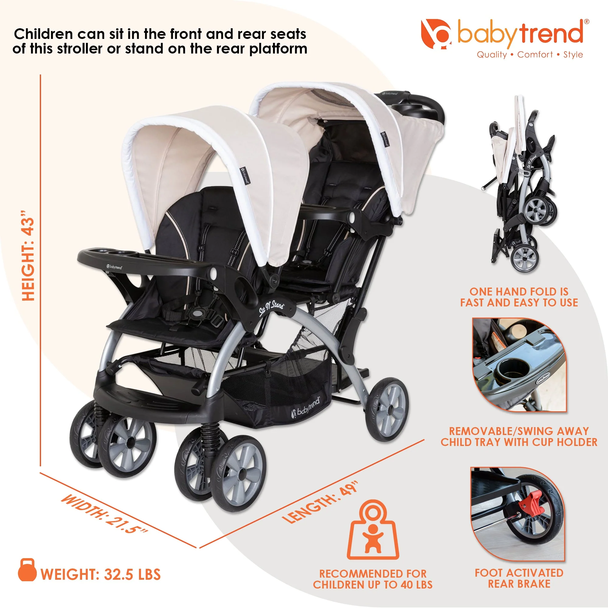 • Convertible double stroller with front and rear seats or use the rear seat as a standing platform for ultimate convenience