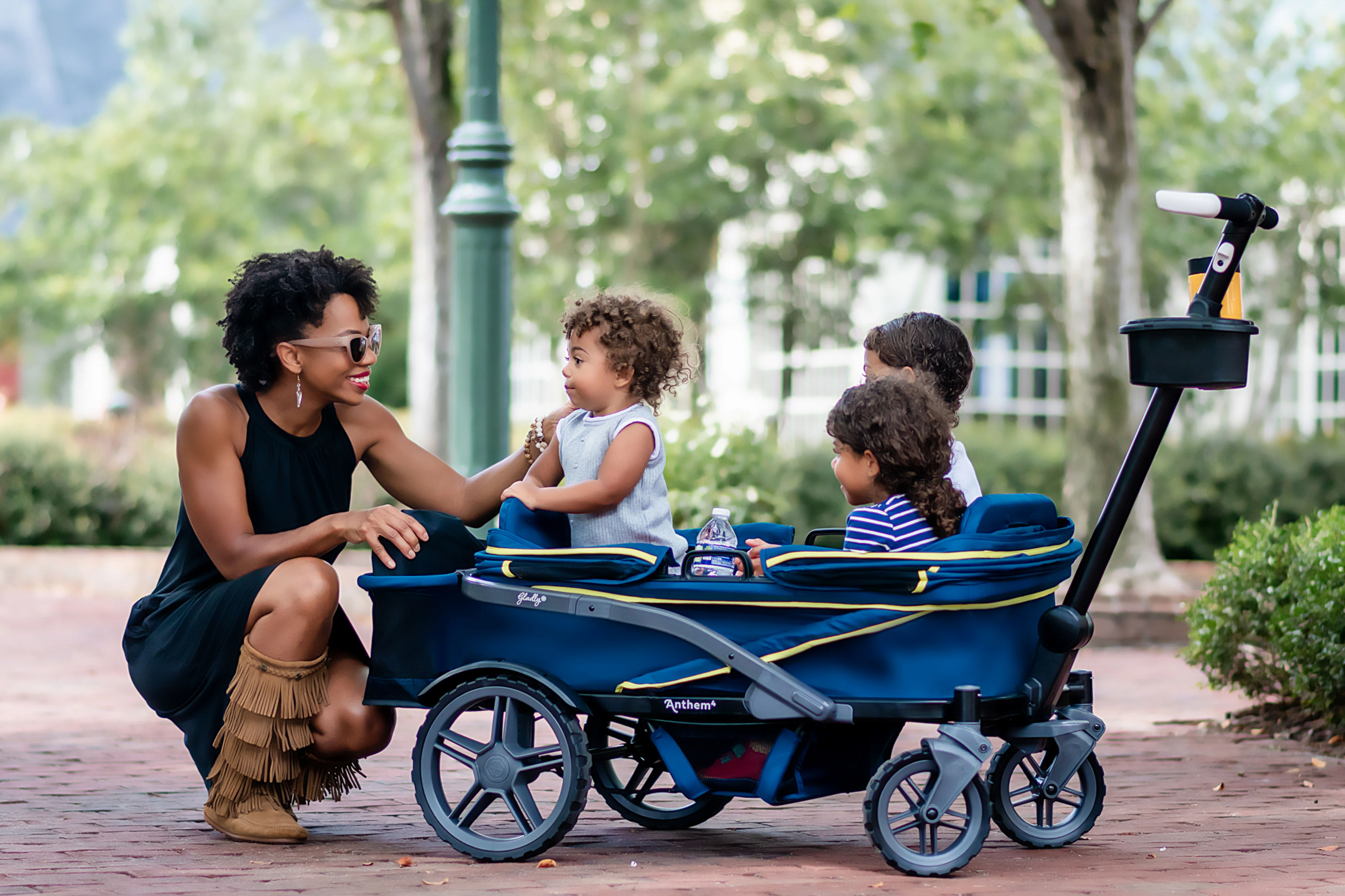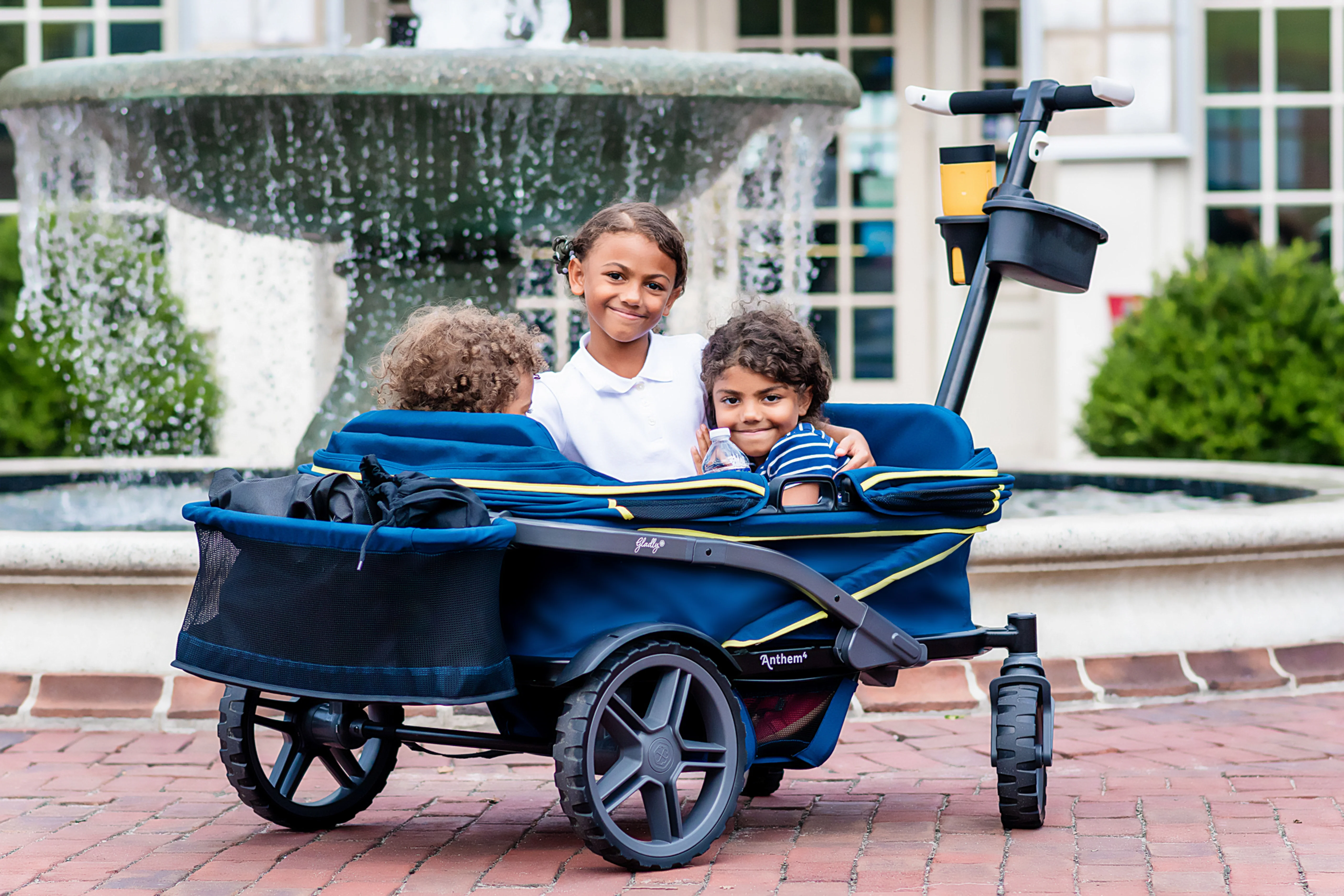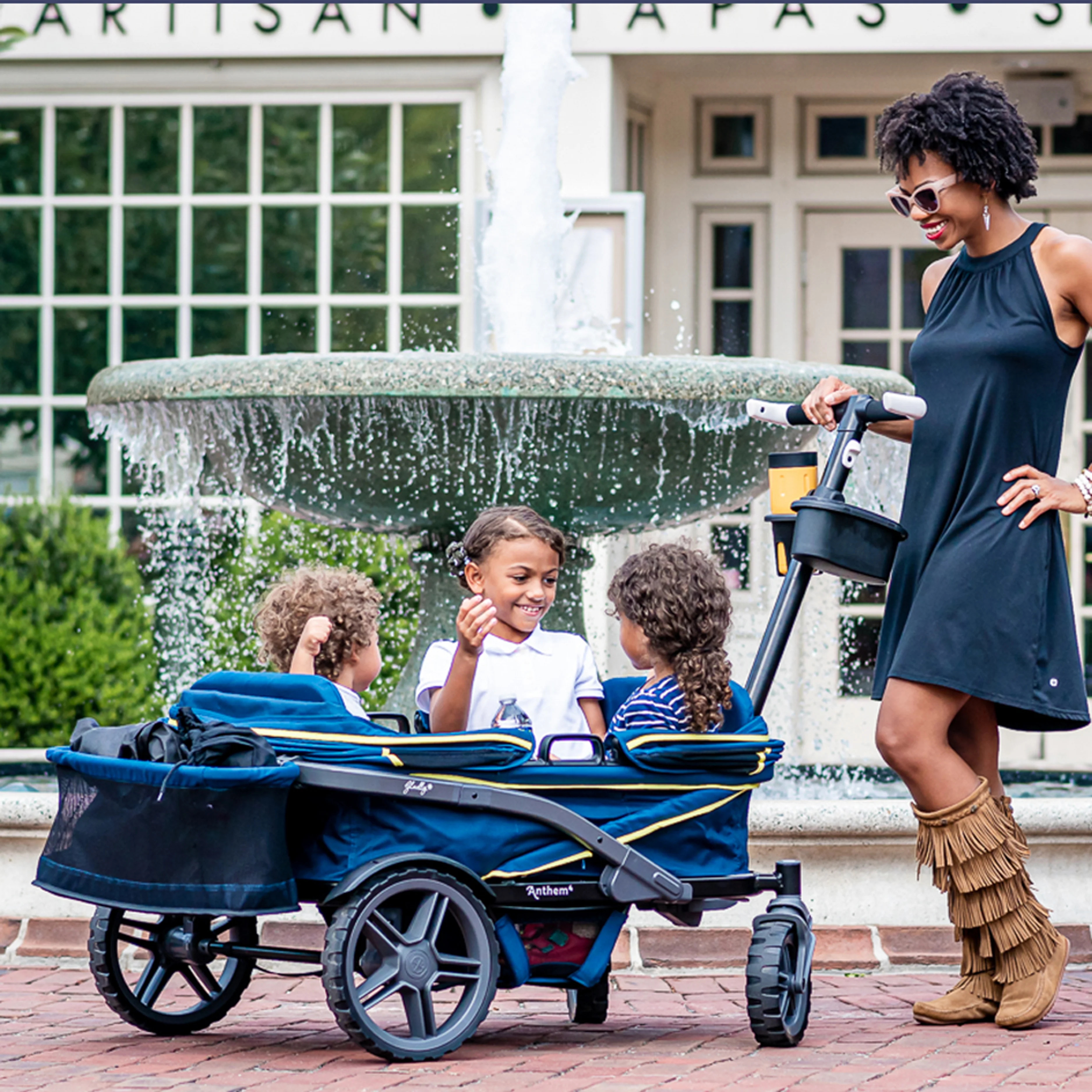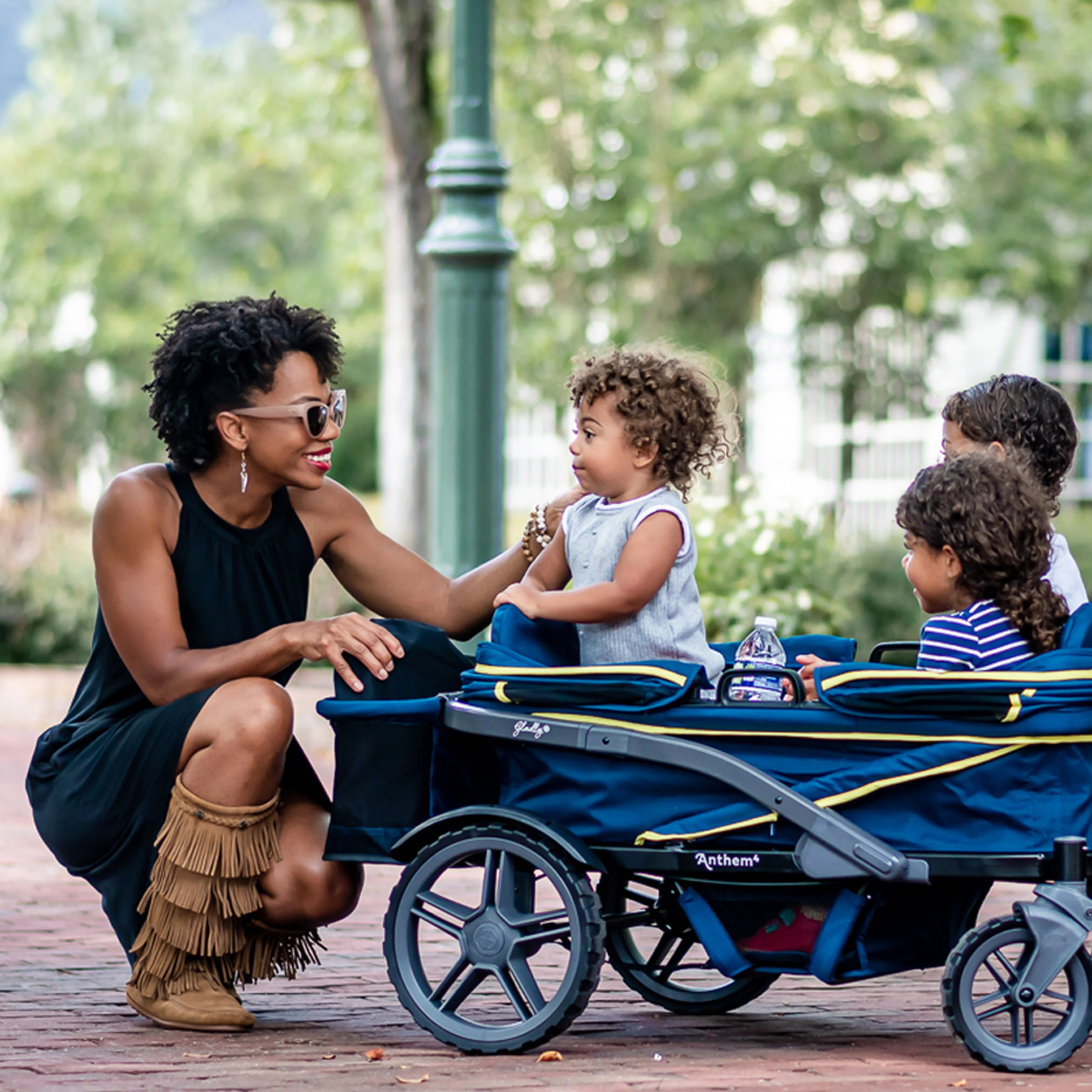 Need room for four? The 4-Seater version of our Anthem™ All-Terrain Wagon Stroller has got you covered. Don't be fooled by its stylish good looks: this cruiser is also an all-terrain workhorse with rugged wheels and a sturdy frame. Plus, "extras" like two XL canopies, parent cup holder and lounge pad come standard!