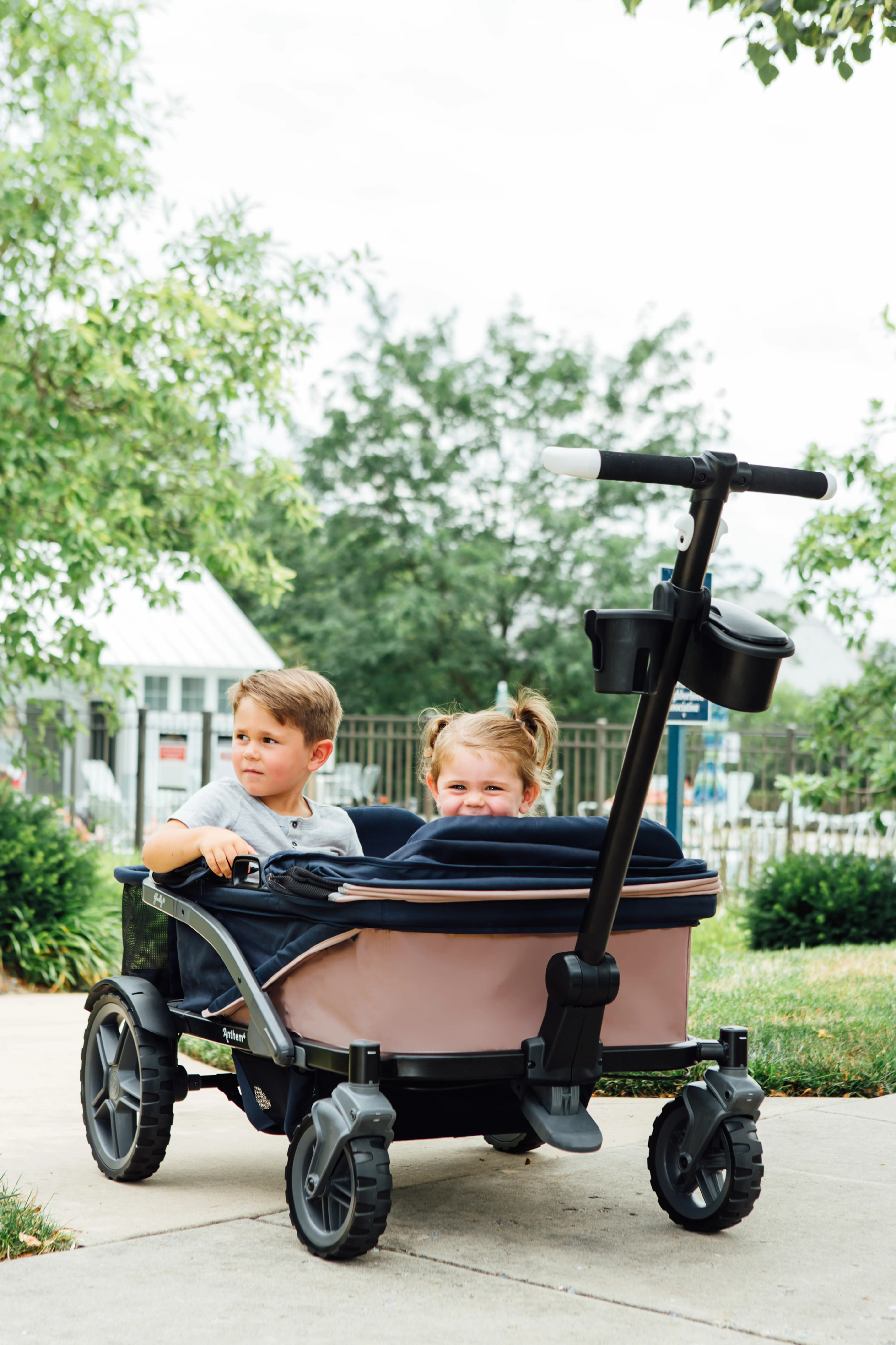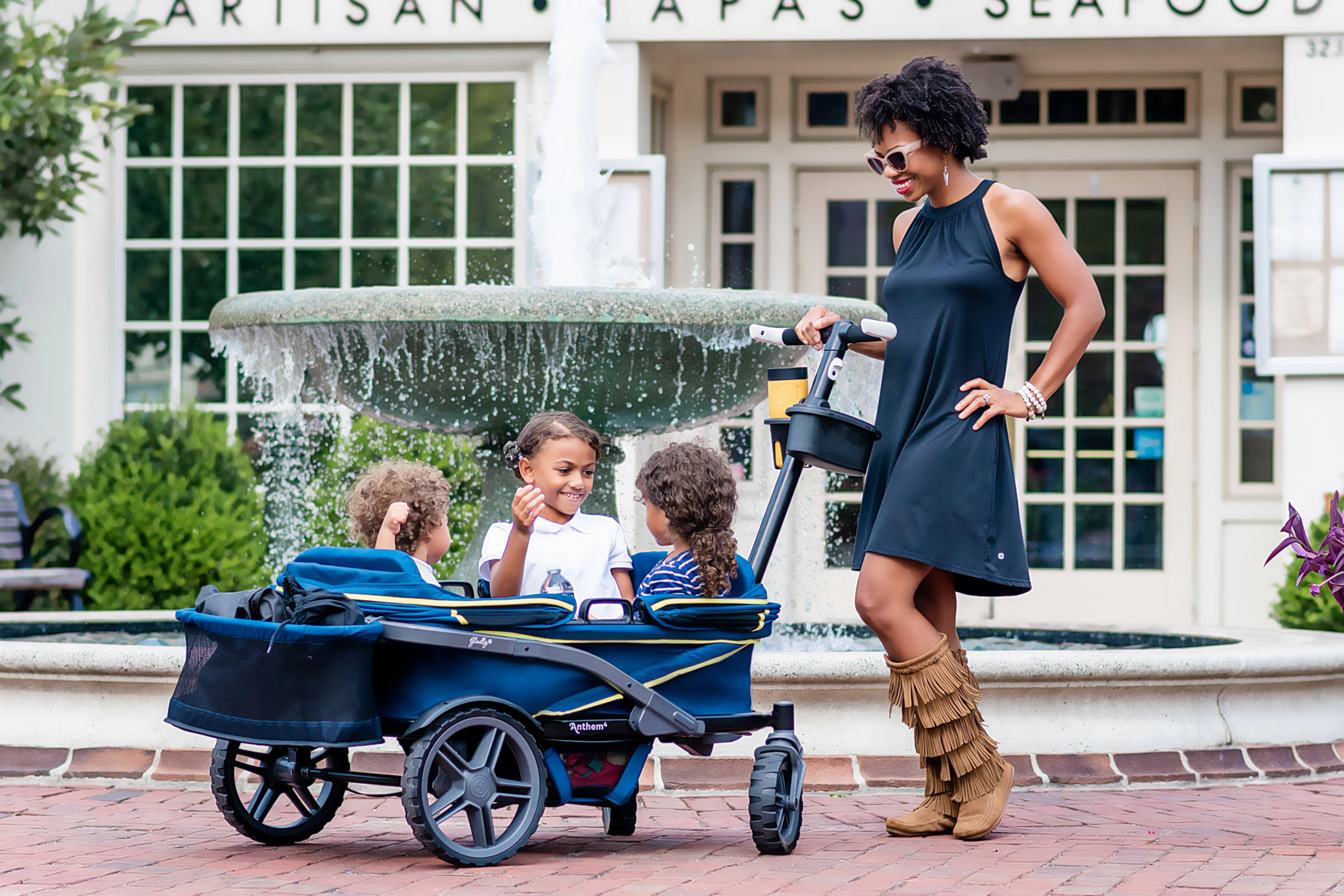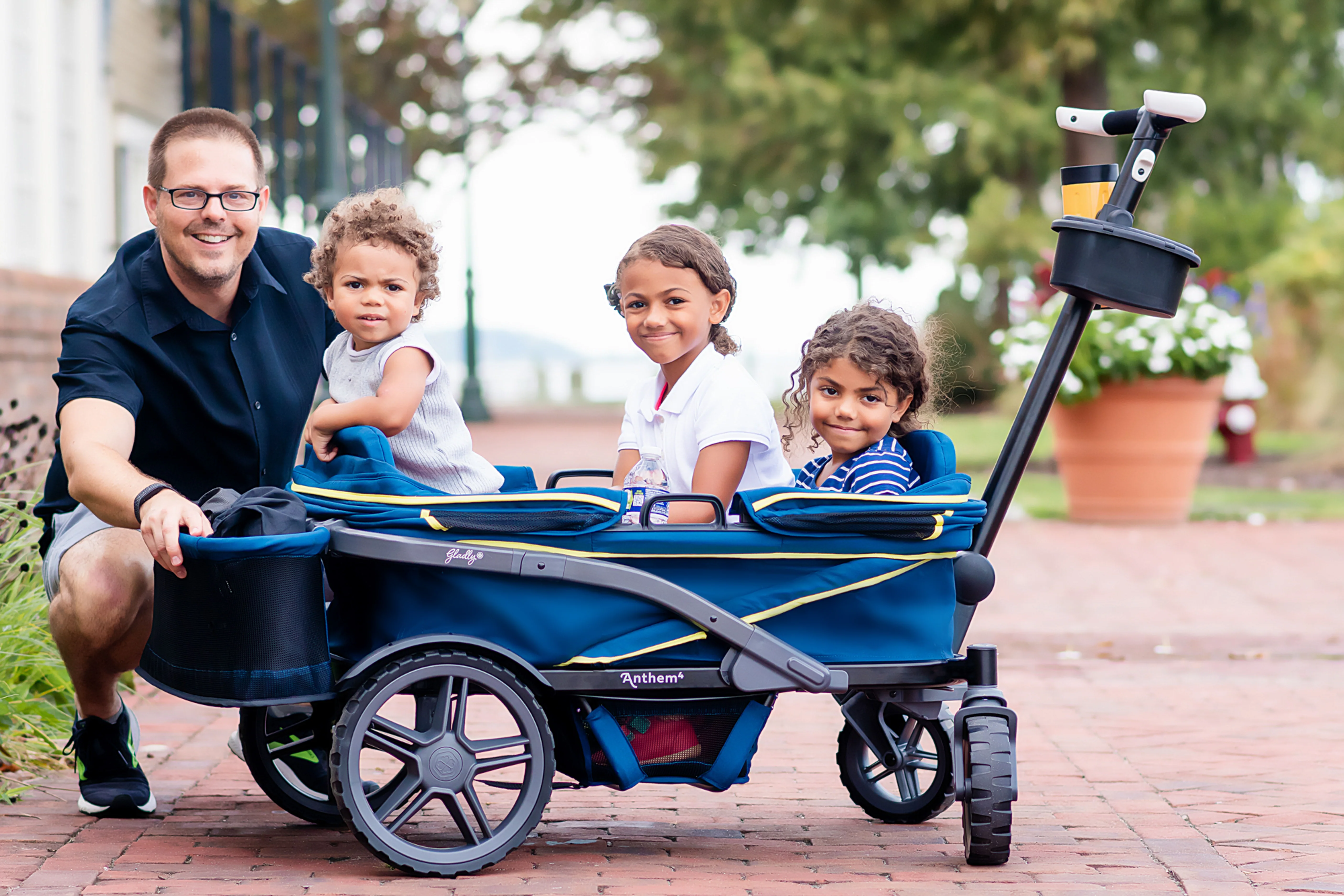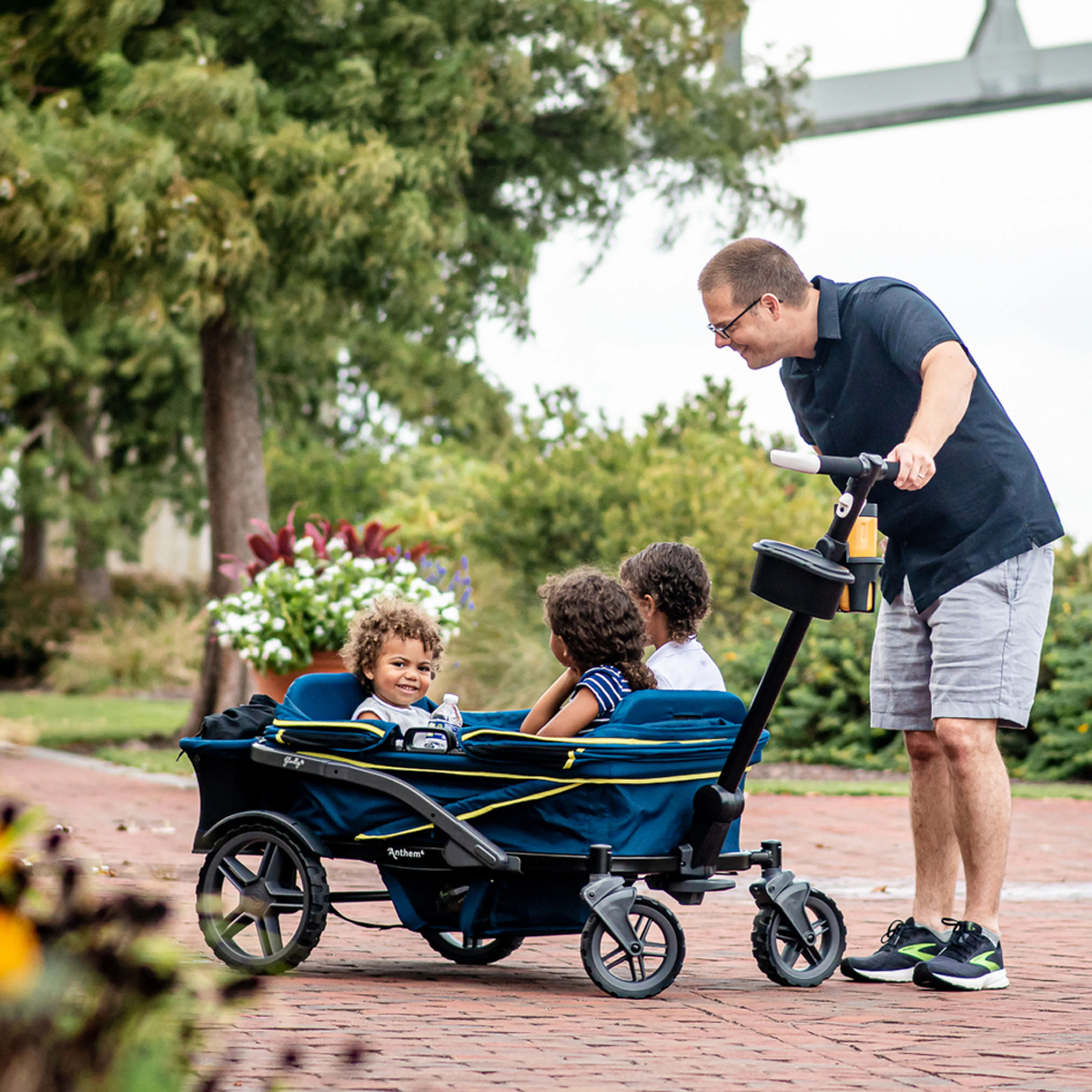 Need room for four? The 4-Seater version of our Anthem™ All-Terrain Wagon Stroller has got you covered. Don't be fooled by its stylish good looks: this cruiser is also an all-terrain workhorse with rugged wheels and a sturdy frame. Plus, "extras" like two XL canopies, parent cup holder and lounge pad come standard!