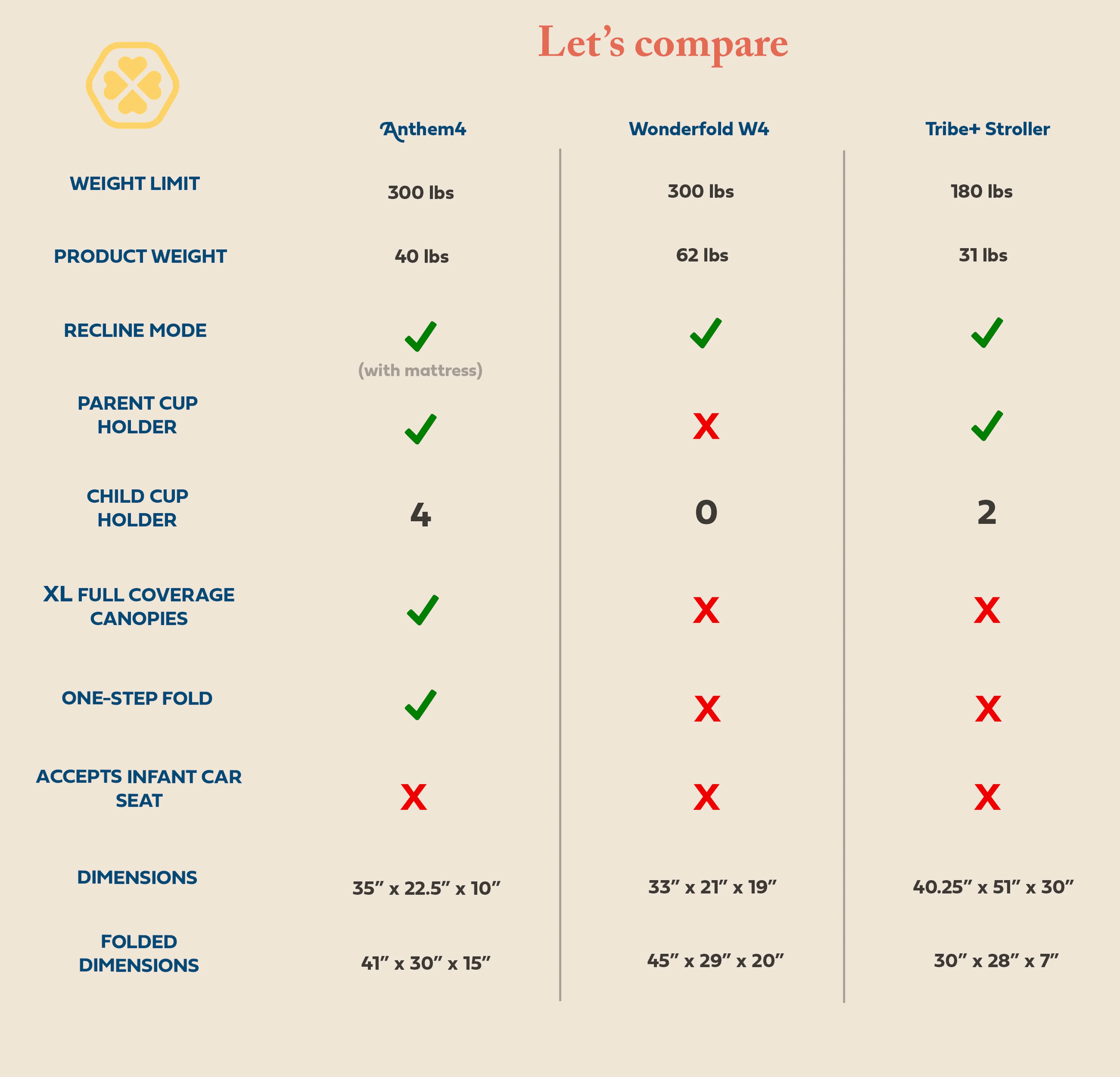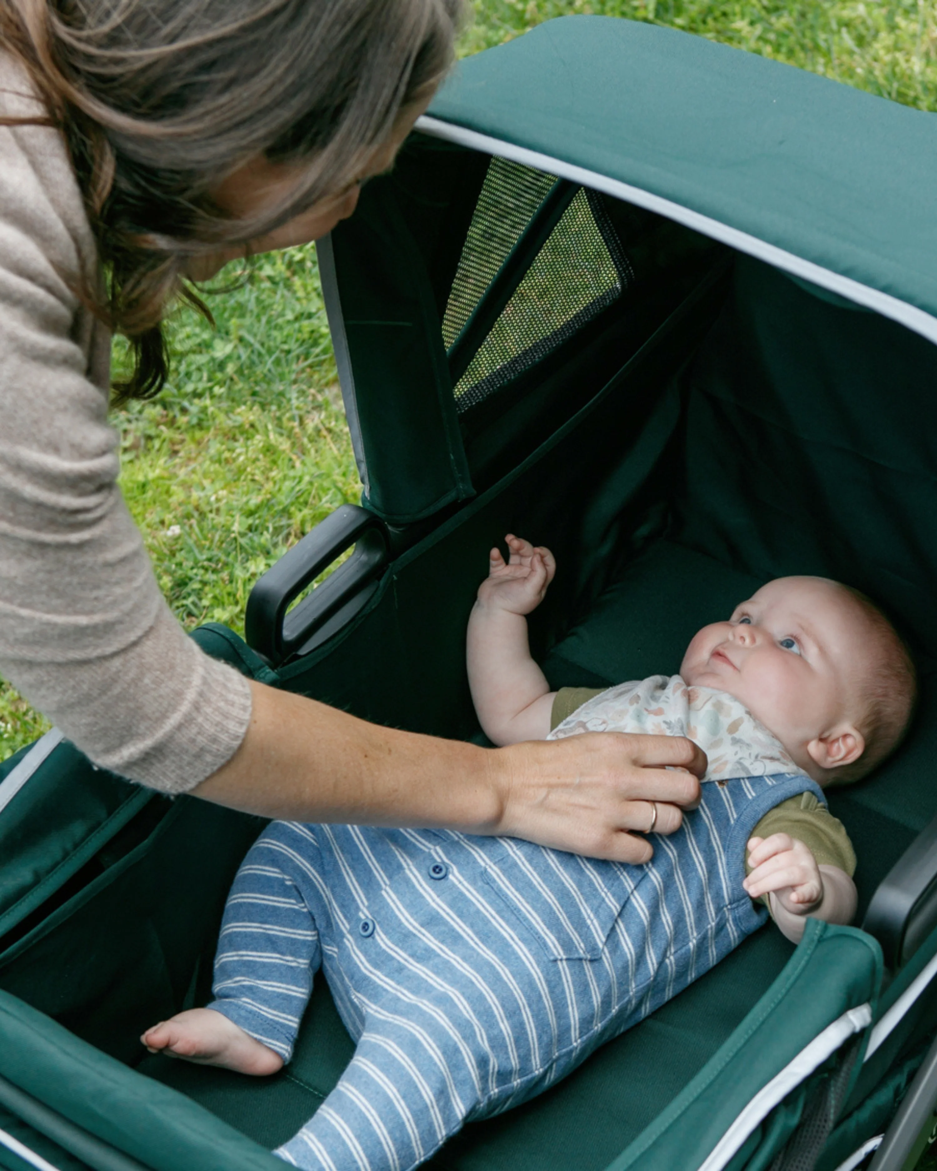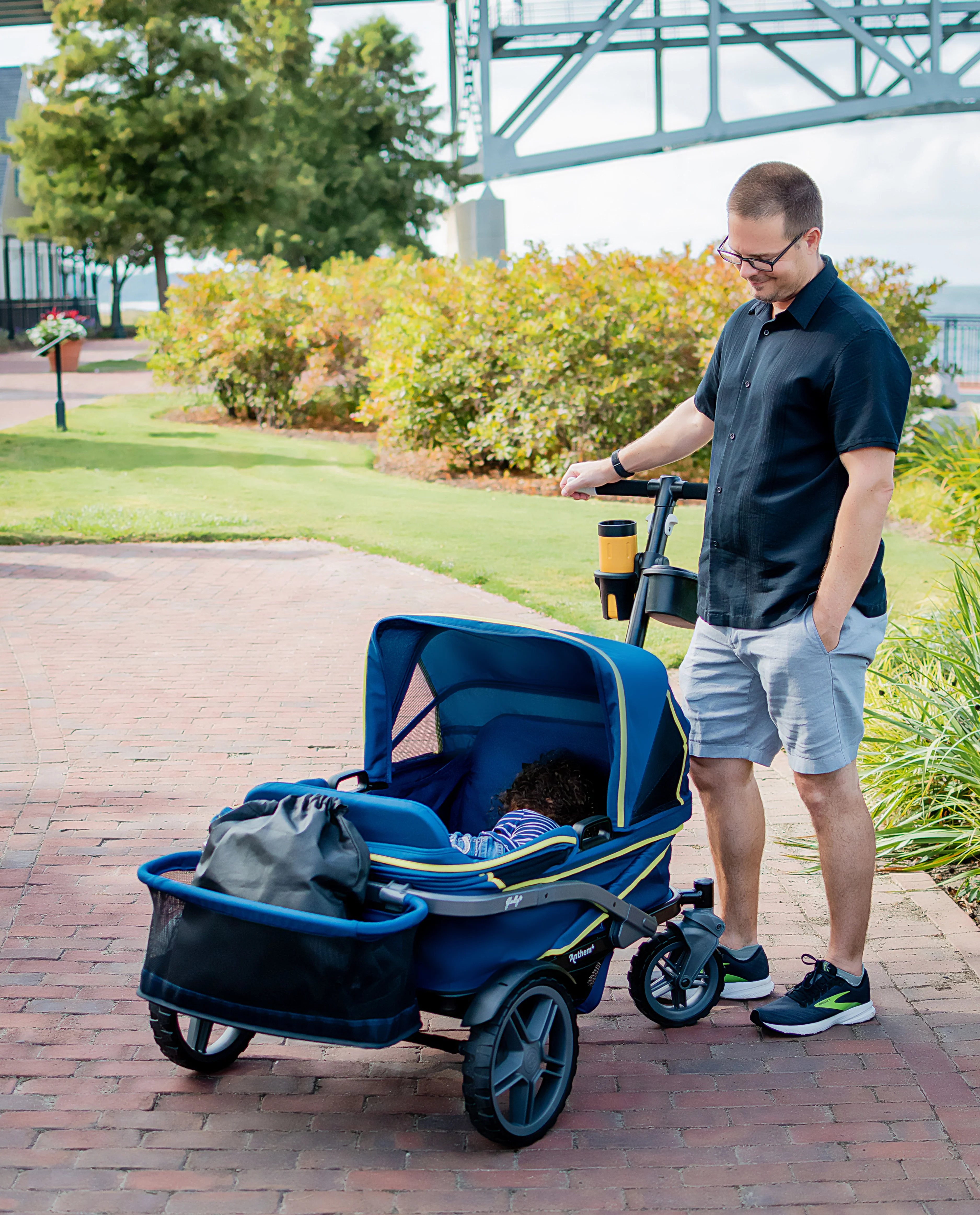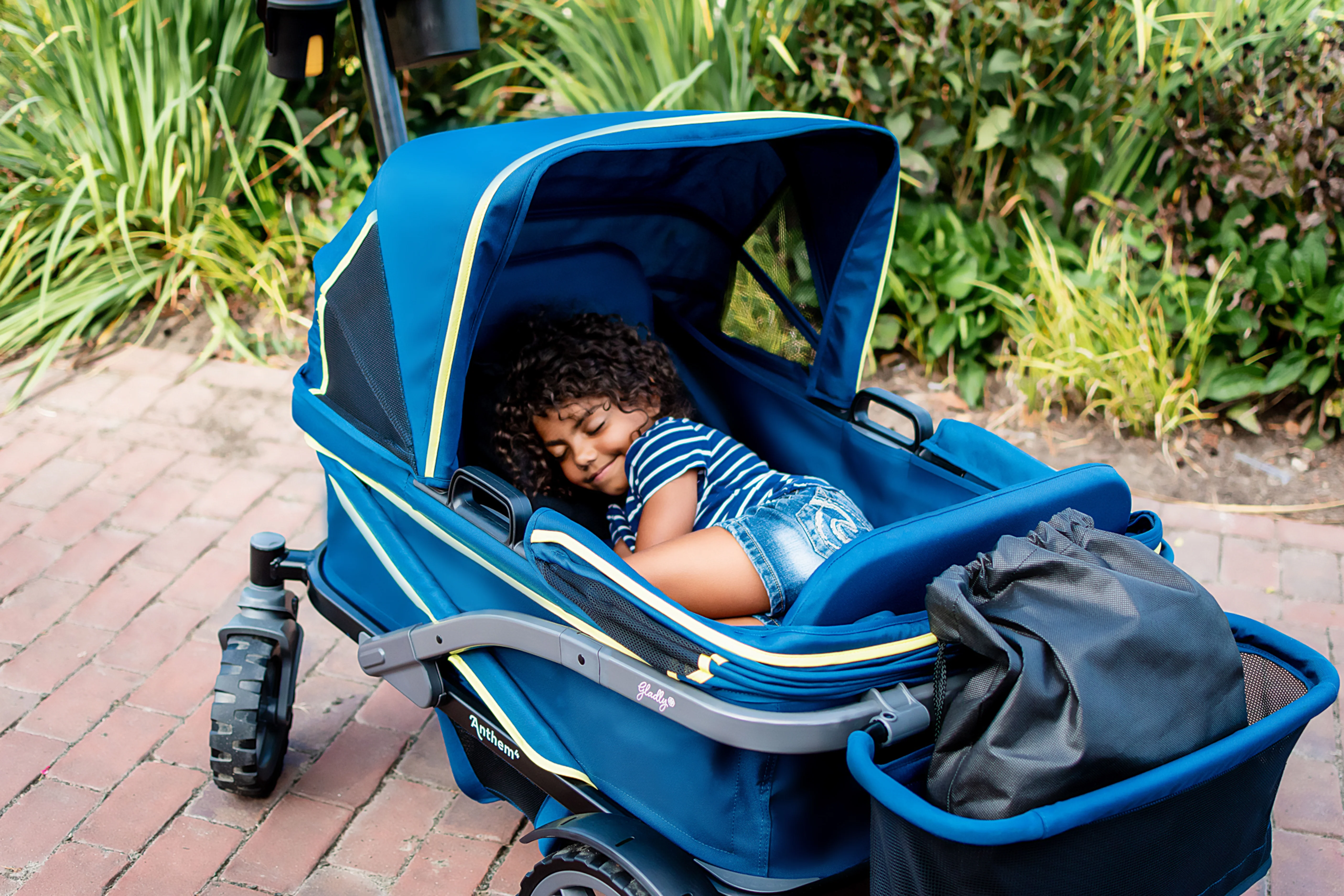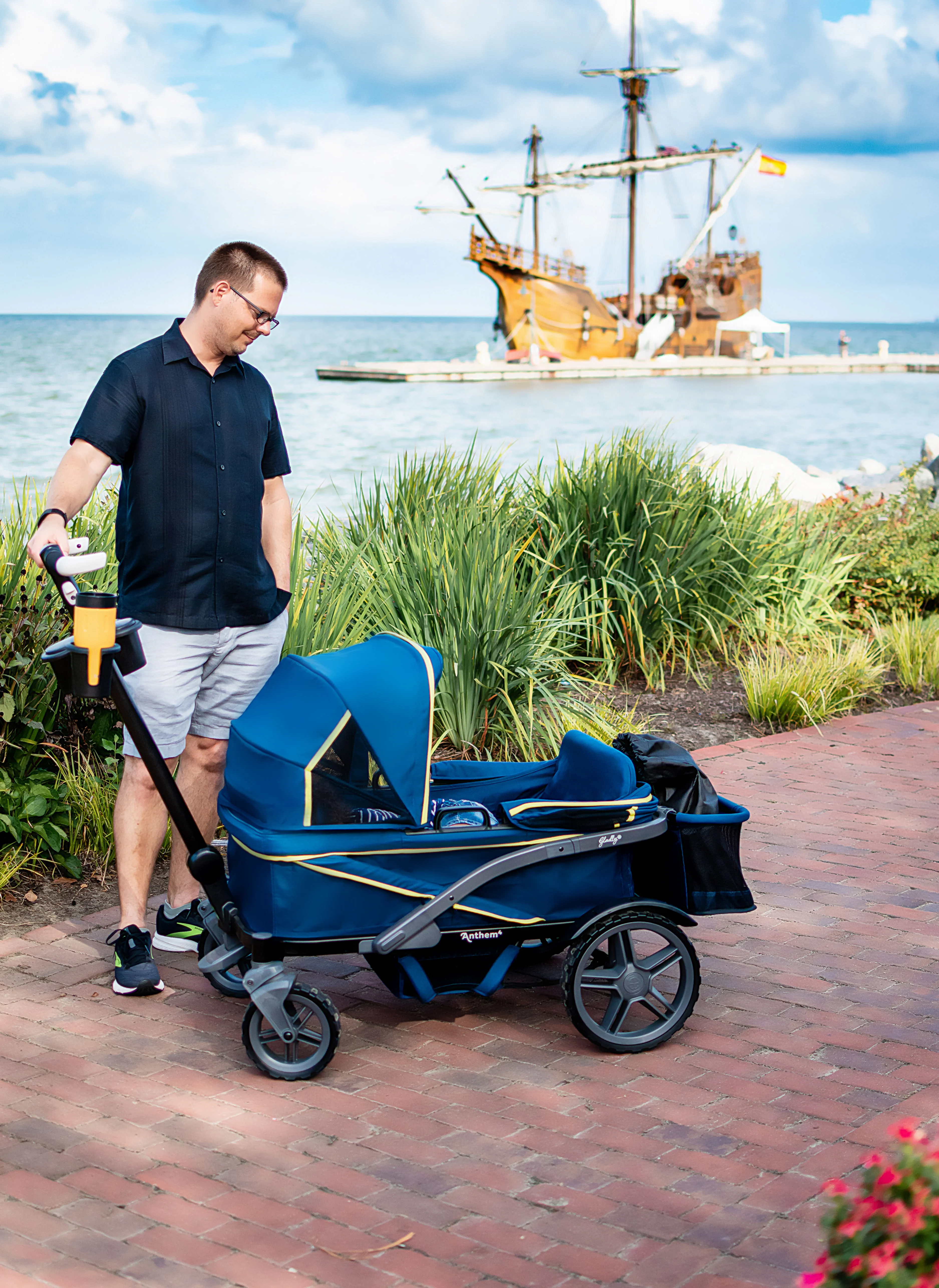 Need room for four? The 4-Seater version of our Anthem™ All-Terrain Wagon Stroller has got you covered. Don't be fooled by its stylish good looks: this cruiser is also an all-terrain workhorse with rugged wheels and a sturdy frame. Plus, "extras" like two XL canopies, parent cup holder and lounge pad come standard!