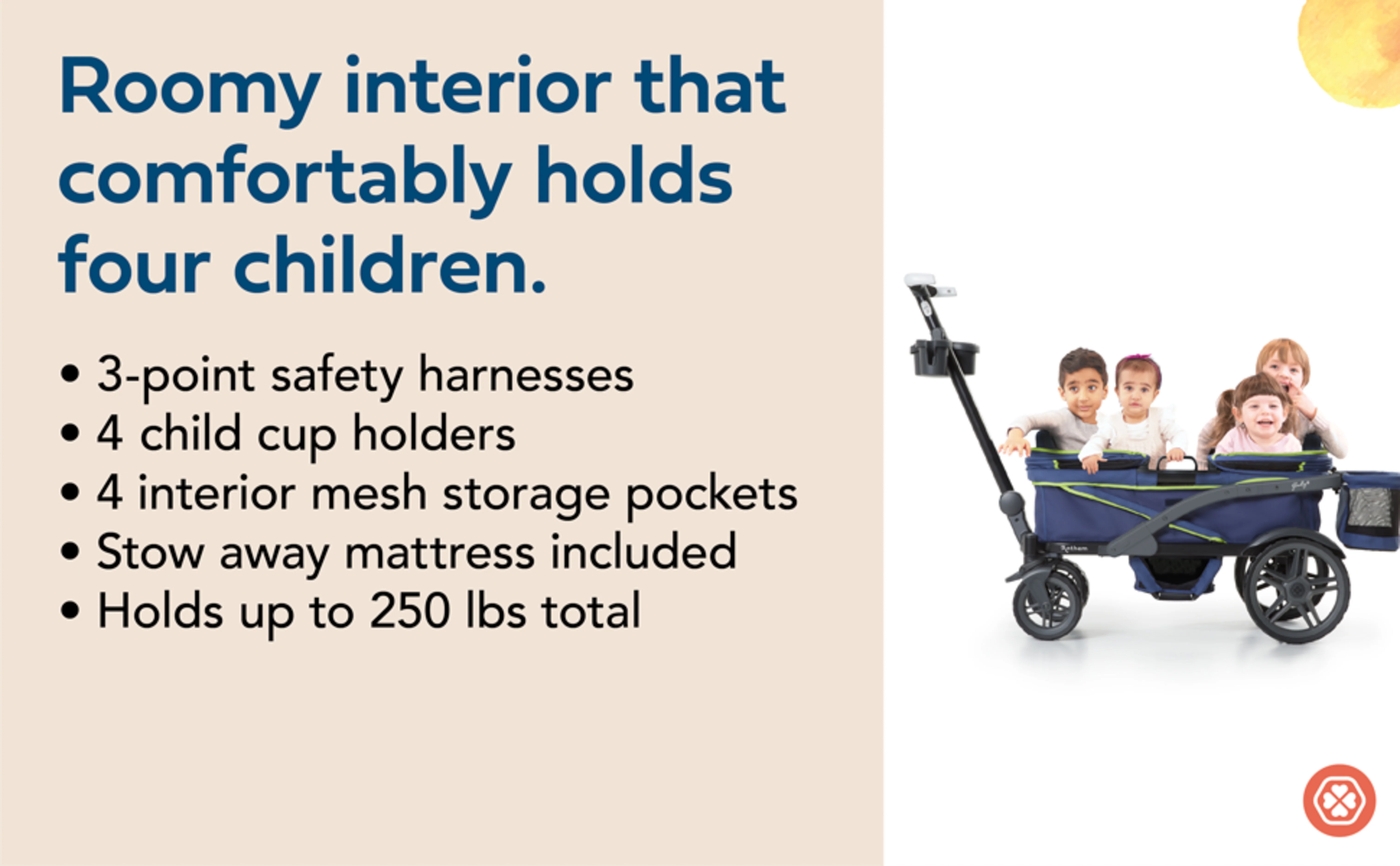 - Roomy interior that comfortably holds four children up to 50 lbs each