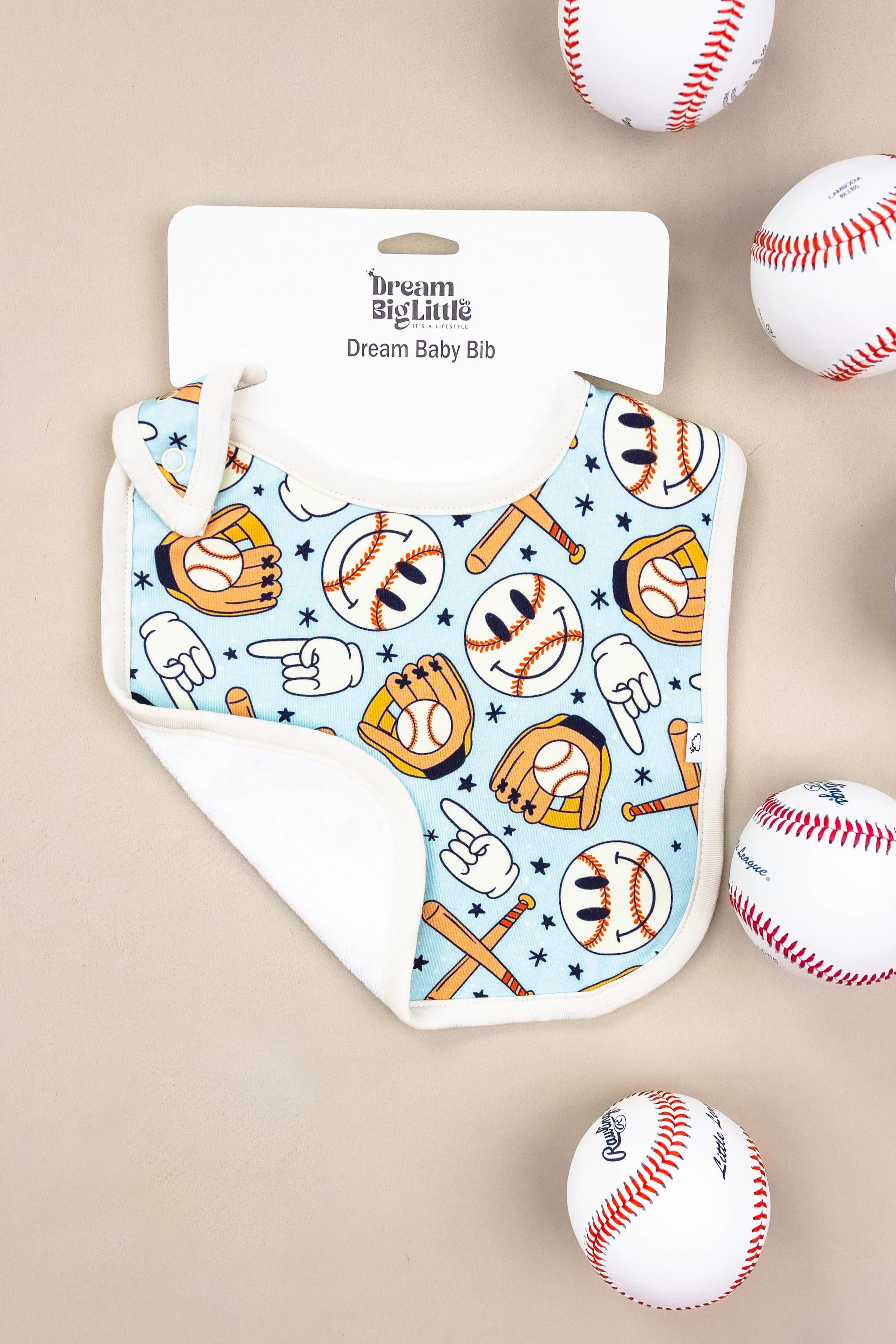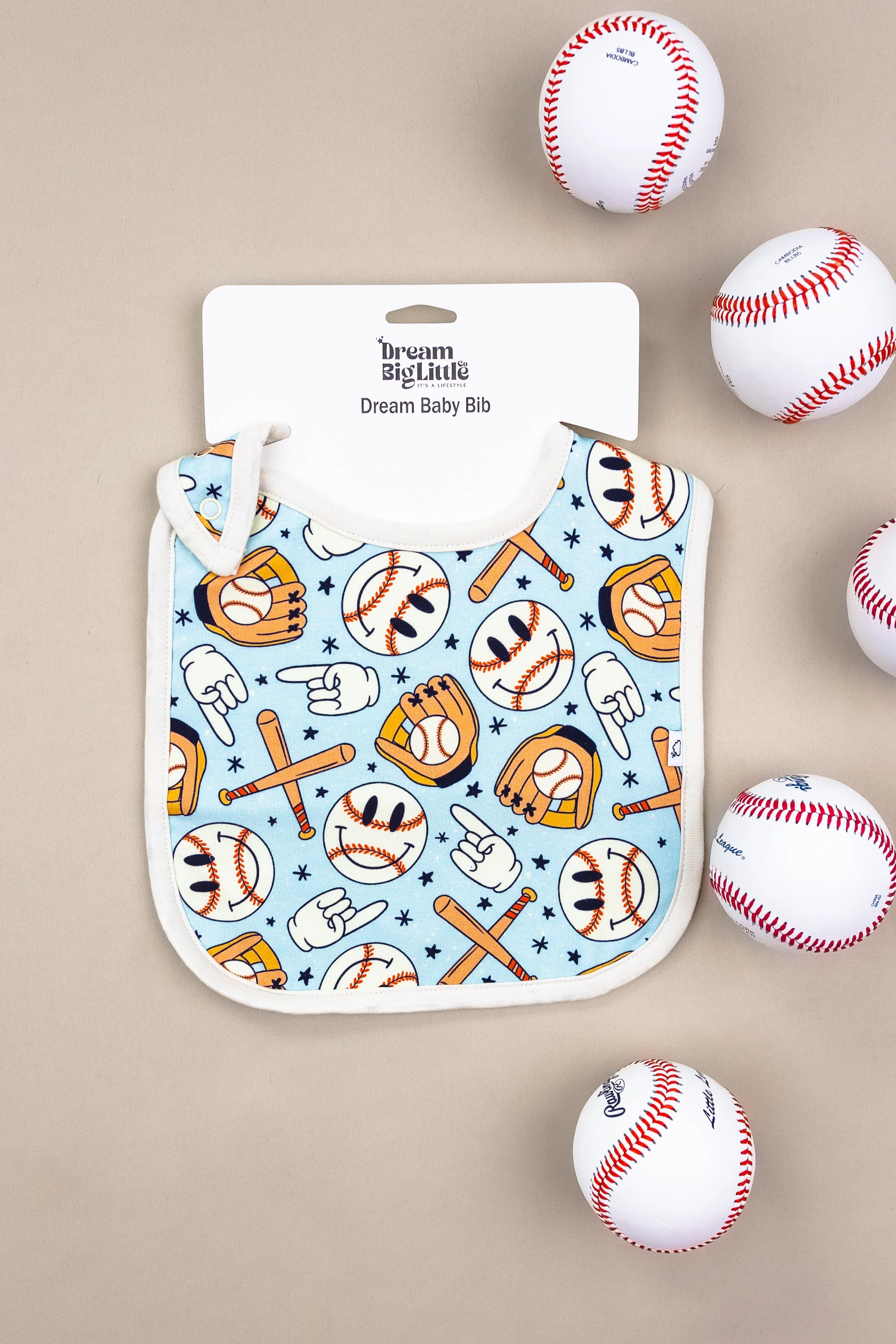 Play ball with our Baseball Smiley Dream Baby Bib! Perfect for your little slugger, this bib features a smiling baseball design and will keep your baby dry and clean during meal time. (Score a home run with this adorable bib!)