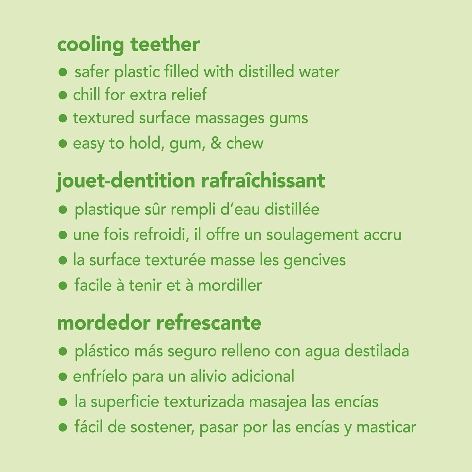 Baby will love the soothing Cooling Teether because it provides extra relief for swollen and sensitive gums. It is perfectly sized to promote healthy oral development and soothe gums during different stages of teething. The shape of the Cooling Teether is easy to hold, gum, and chew, and a textured surface massages sensitive areas. Parents will love the BPA- and PVC-free plastics for health and well-being. Baby will love the fun, bright colors!
