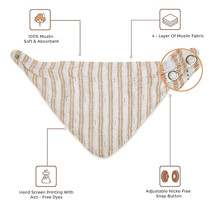 Lightweight and absorbent, our 100% cotton four layer muslin bibs are the perfect piece to accent baby’s “outfit of the day.” Each baby bib features adjustable snaps to grow with your baby, and the set includes three unique bib designs. Bibs are essential to keep your baby clean and dry. The perfect gift idea to bundle with our swaddle wraps and burp cloths available in the same print designs.