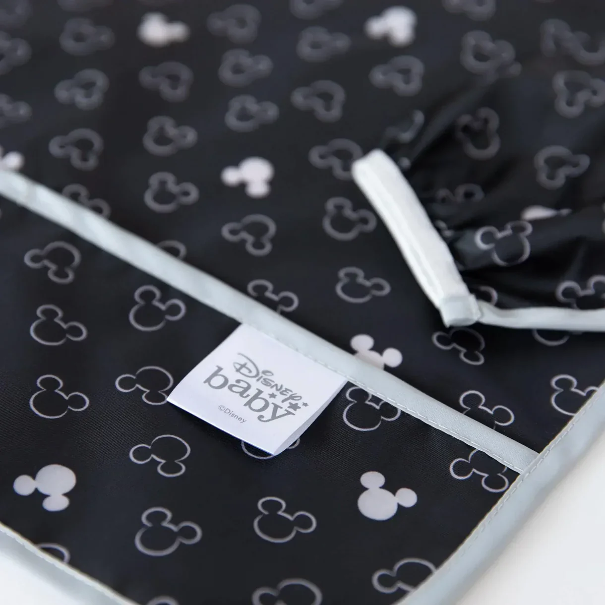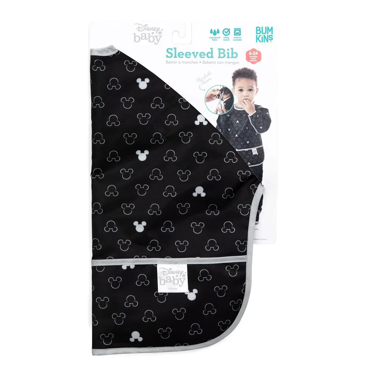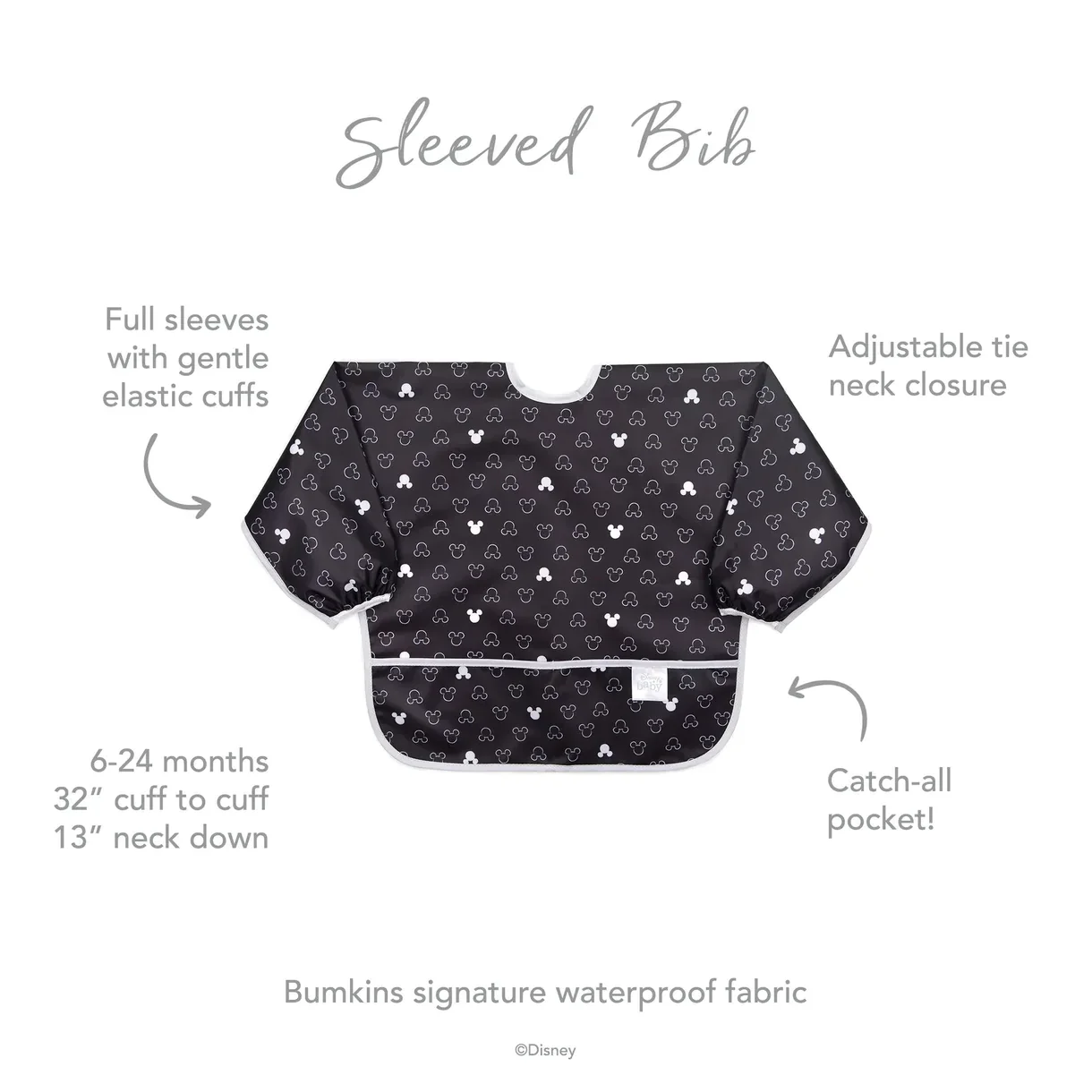 Fresh off the celebration of his 90th birthday, Mickey Mouse is sporting a new, classic black and white look in our Sleeved Bib, with a handy crumb catcher / catch-all pocket for containing spills.