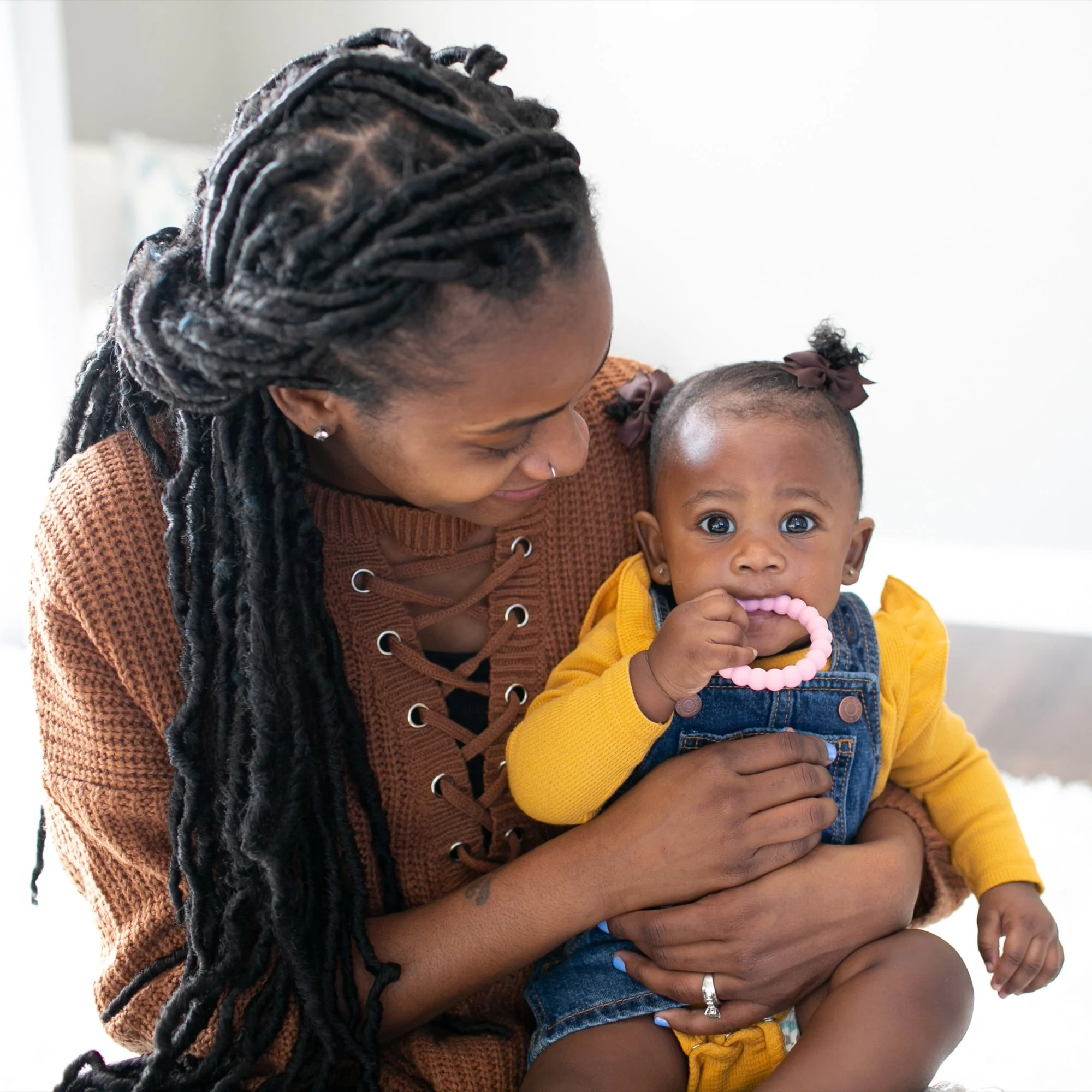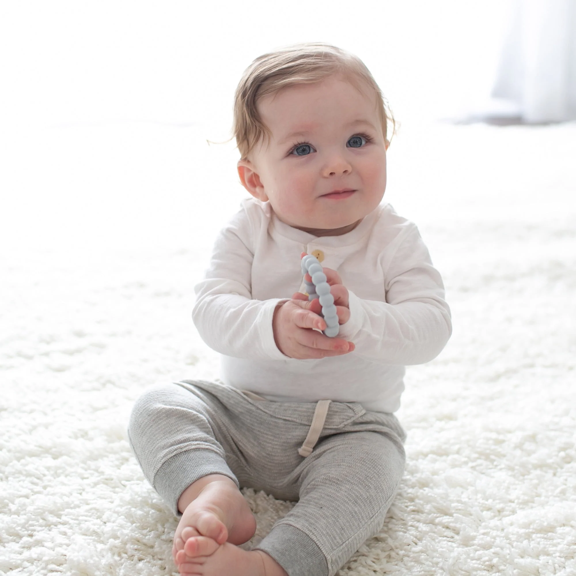 - 100% SILICONE TEETHER FOR BABIES. Soft and durable silicone beads are easy for little fingers to grip and allow baby to gnaw at the teether ring to soothe irritated gums.