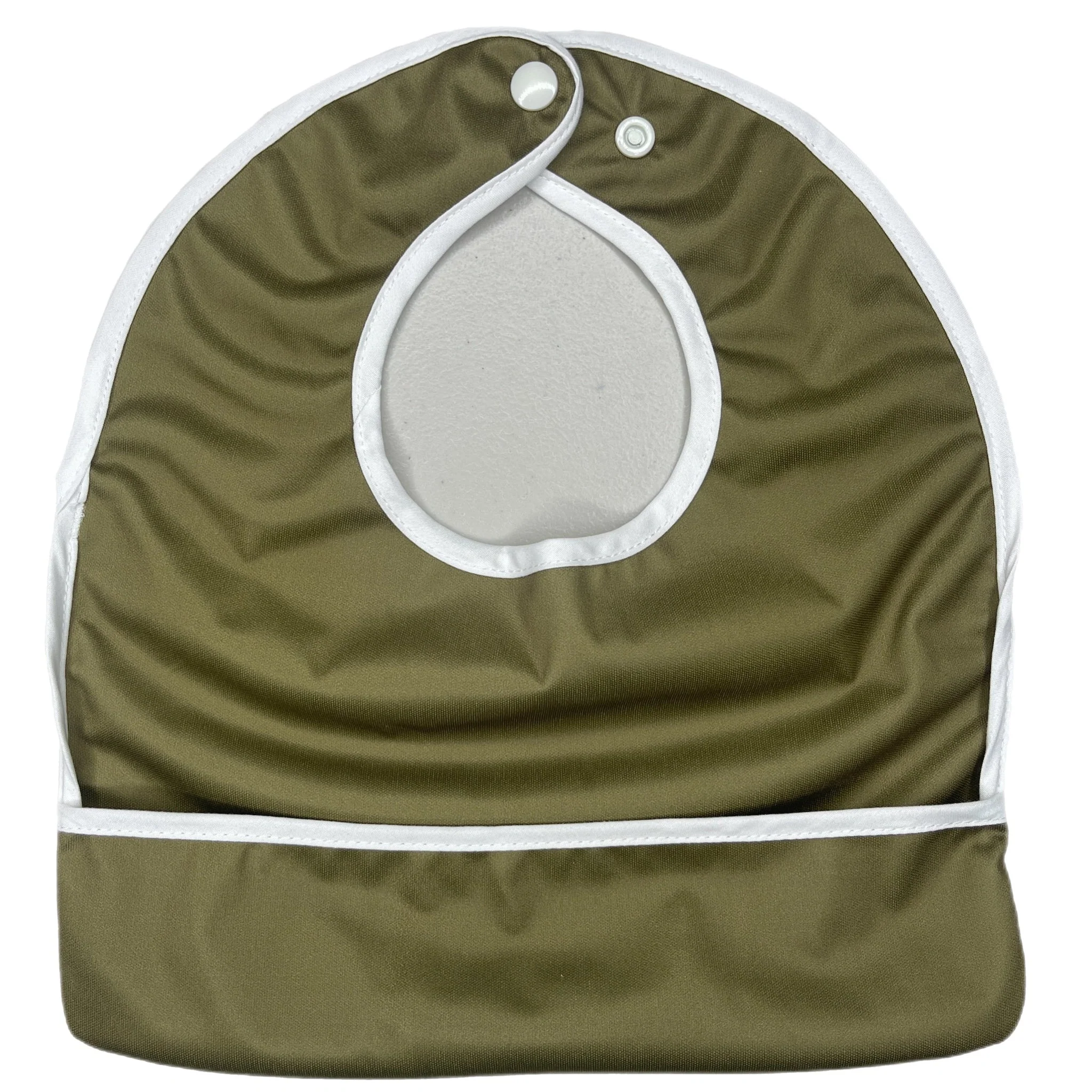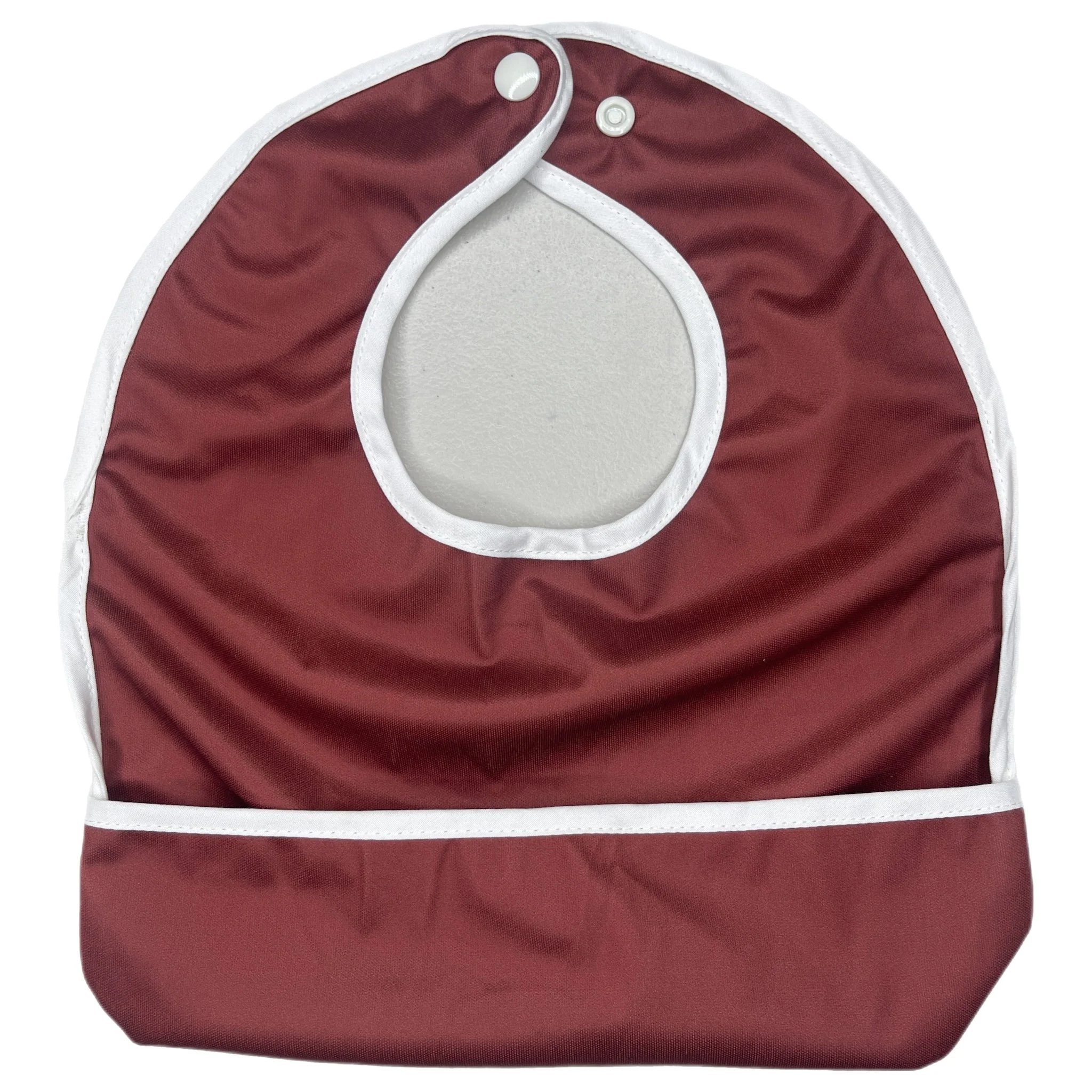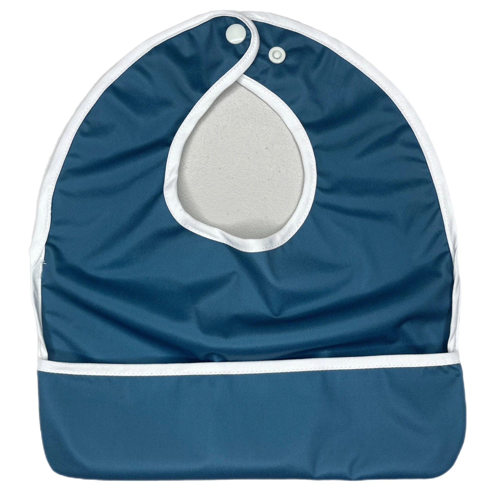These bibs have a pocket to catch food, and drool! Each bib can be flipped back to be used without the pocket. These are machine washable, and made with the same components as a cloth diaper! PUL is water resistant, and easy to clean.