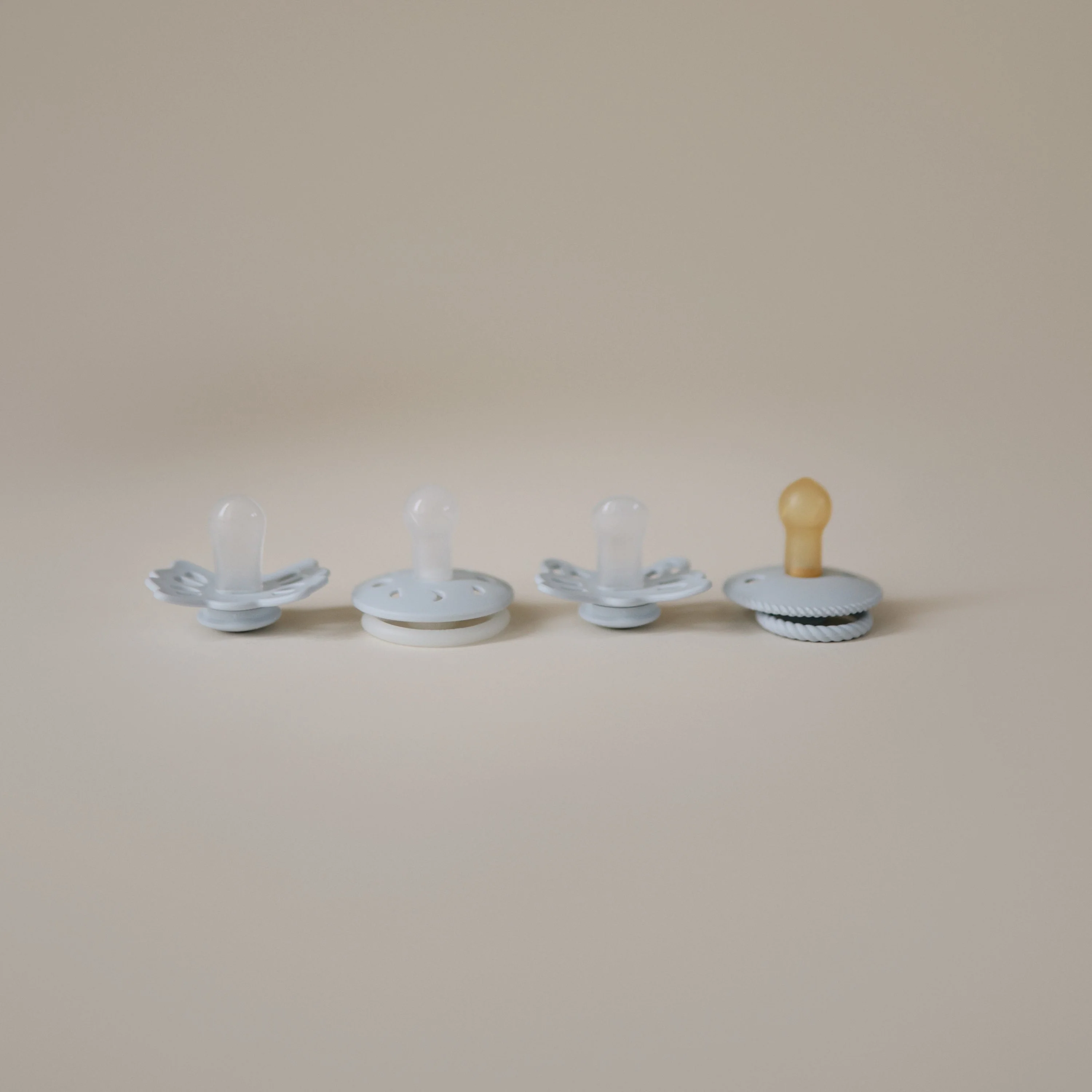 The FRIGG line of natural rubber and silicone pacifiers have been thoughtfully designed for your baby's comfort. The outward curve keeps the pacifier off their delicate skin, while features like air holes and a security handle ensure your baby stays safe. Available in a range of soft colors, FRIGG pacifiers make a beautiful addition to your collection of baby essentials.