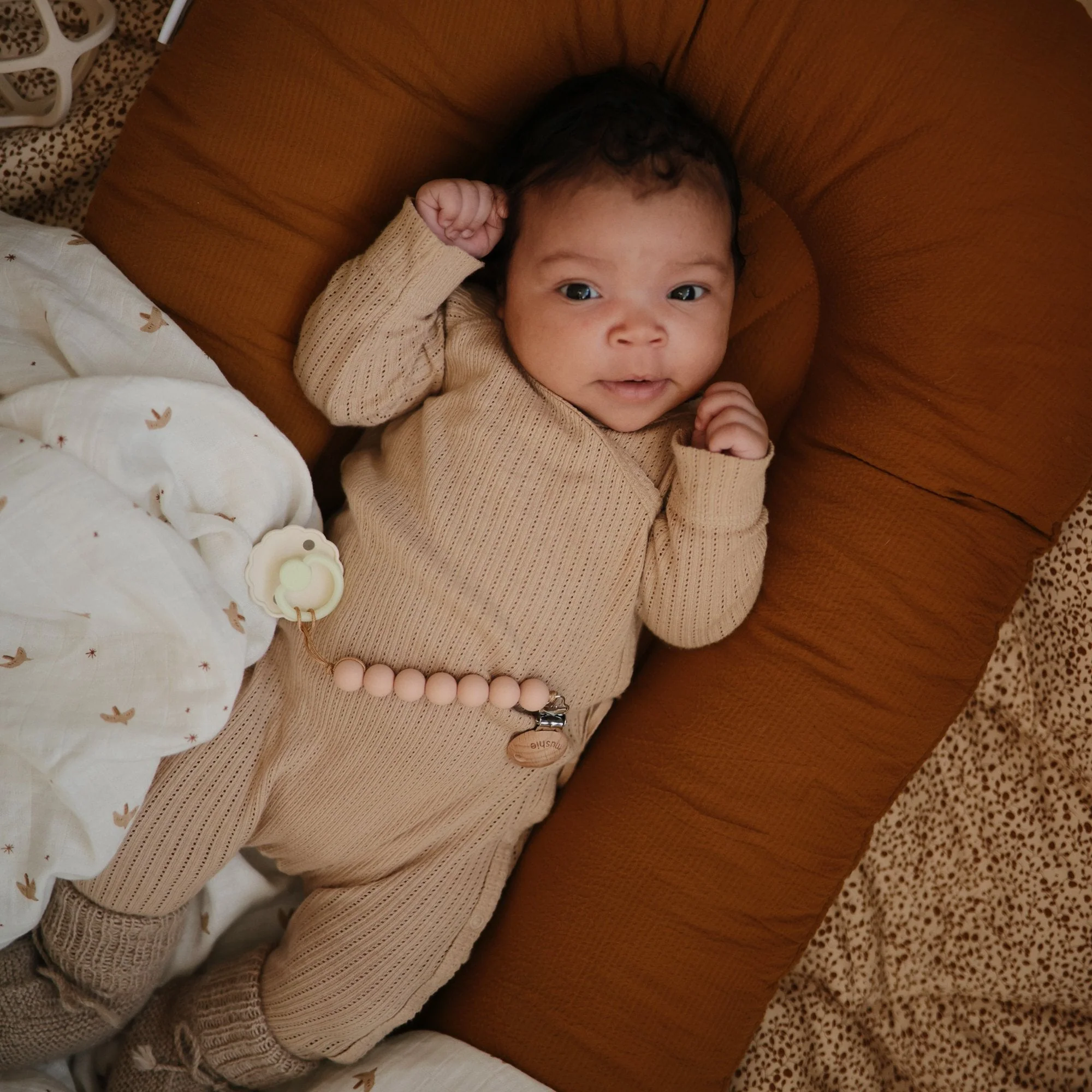 - Pacifiers are made with natural rubber and may expand with use.