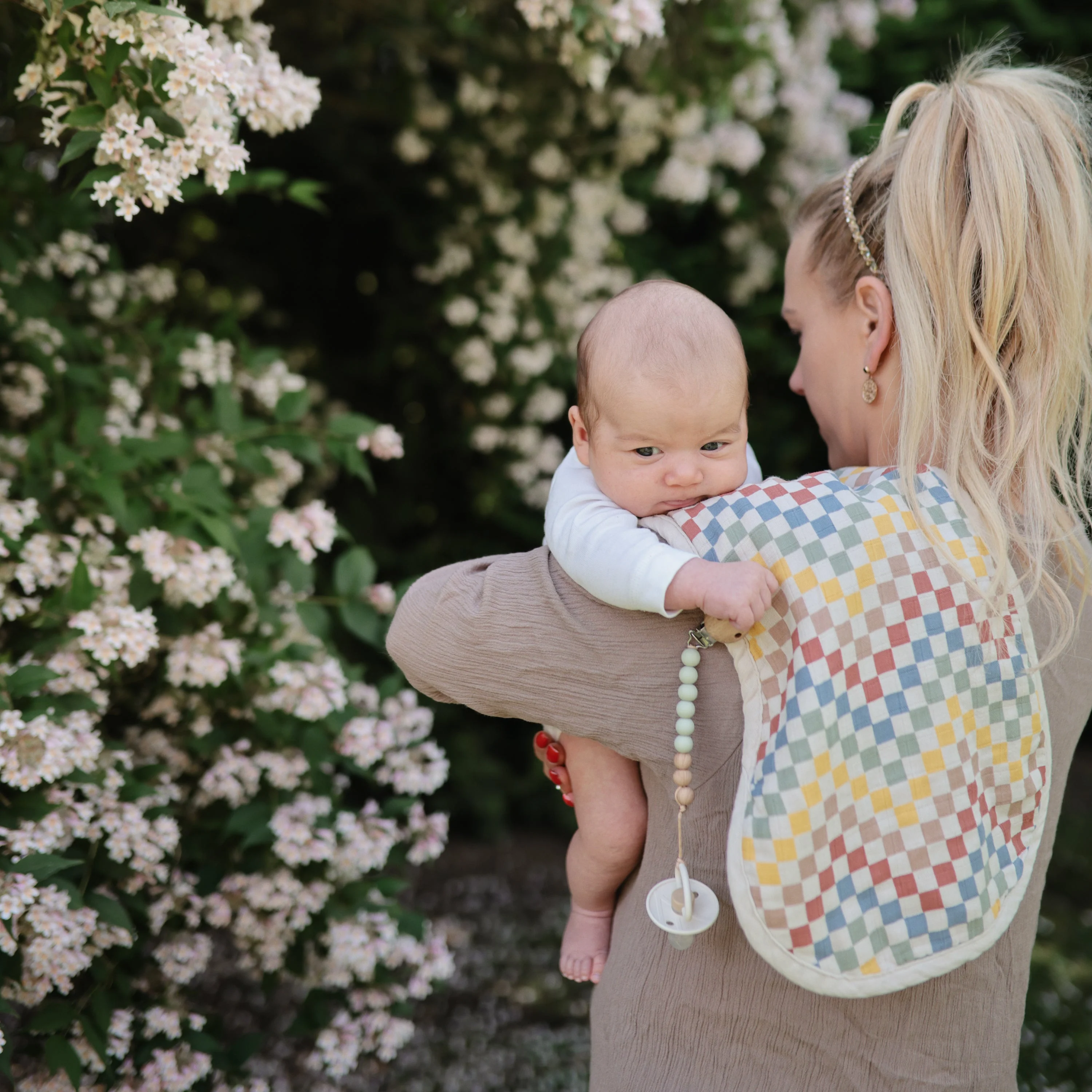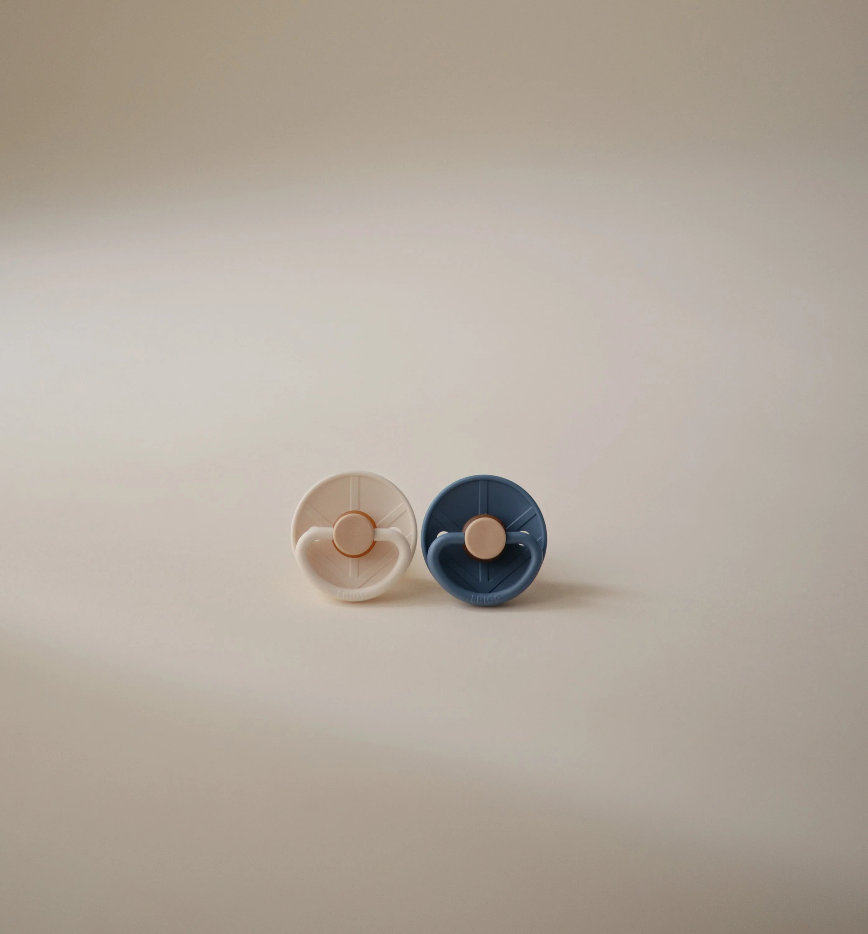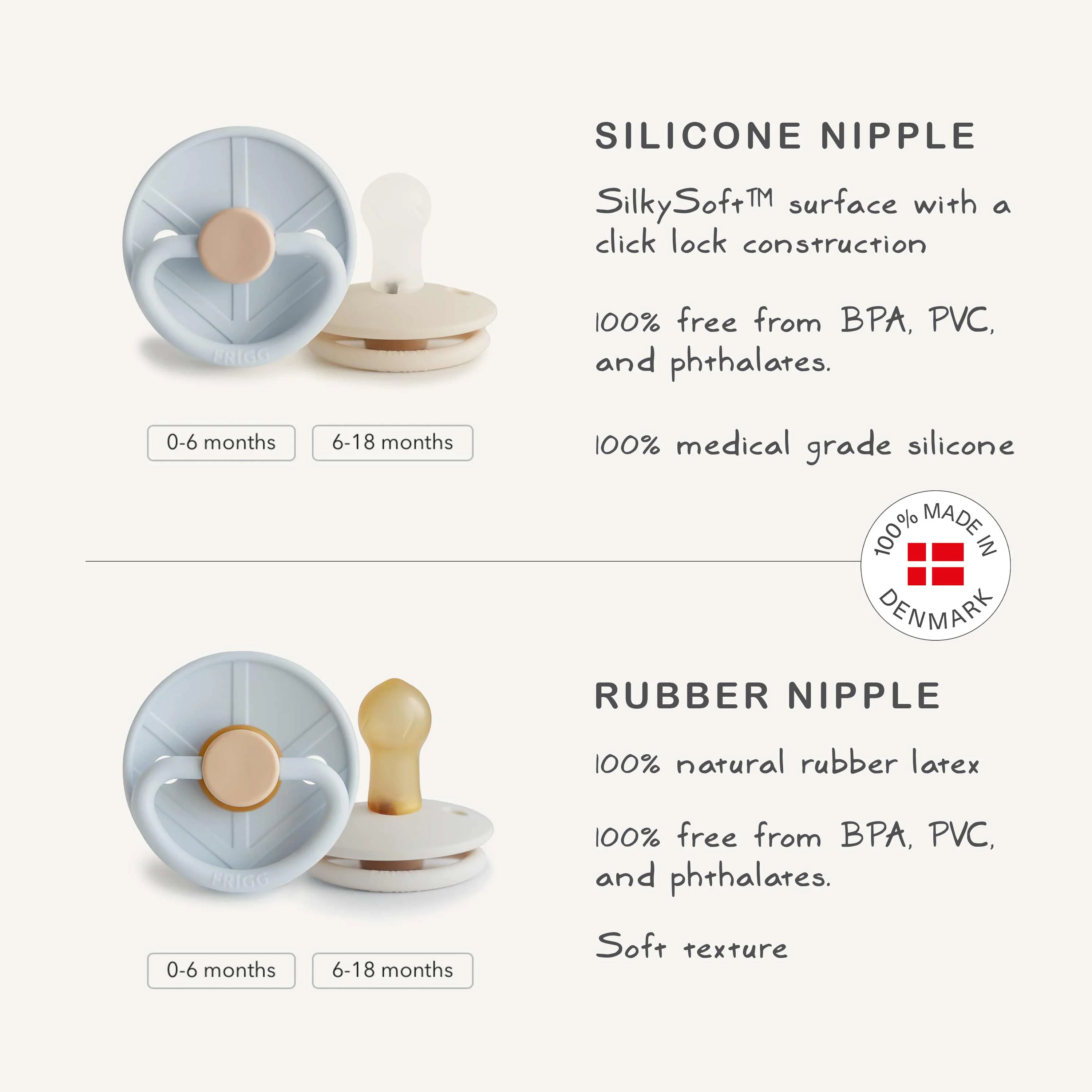 The FRIGG line of Little Viking silicone pacifiers is inspired by Norse mythology, including the Norse Goddess Frigg who is the inspiration behind the FRIGG brand. FRIGG's silicone pacifiers feature an improved SilkySoft™ nipple and innovative Click-lock System. The outward curve keeps the pacifier off their delicate skin, while features like air holes and a security handle ensure your baby stays safe. Available in a range of soft colors, FRIGG pacifiers make a beautiful addition to your collection of baby essentials.