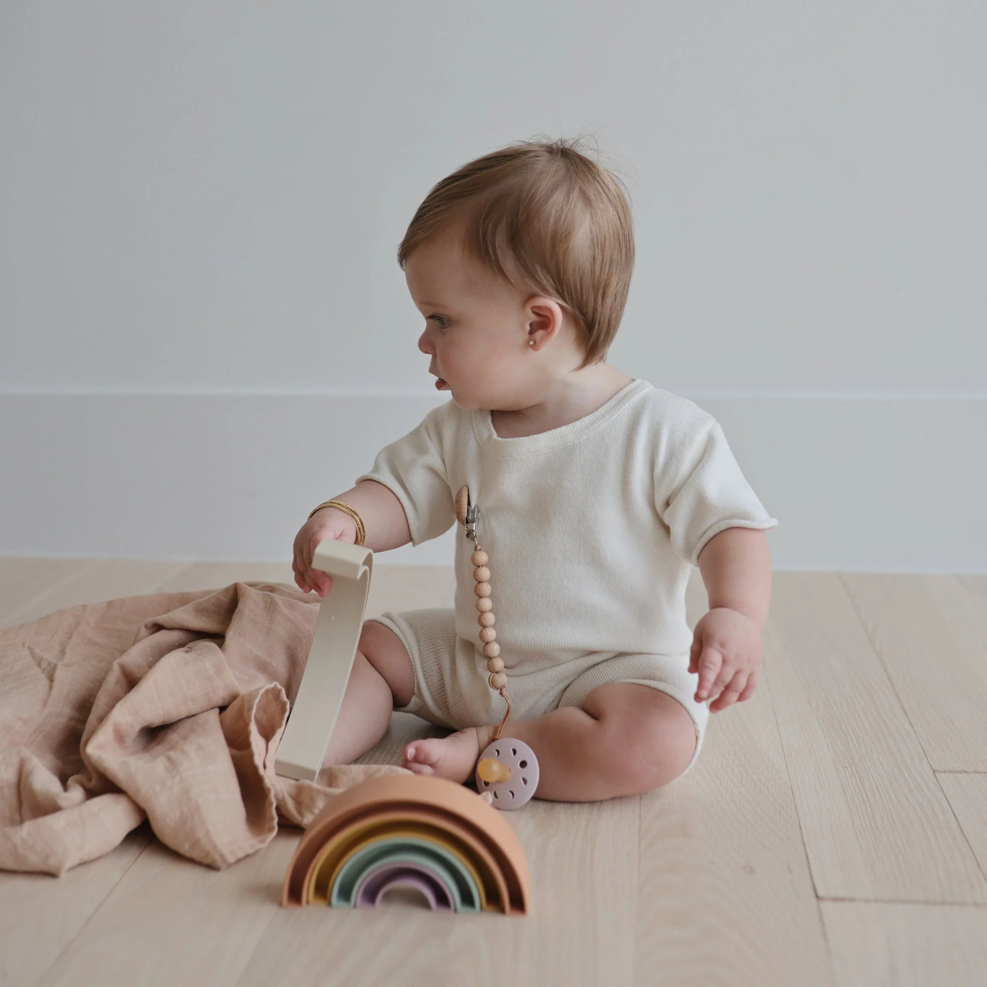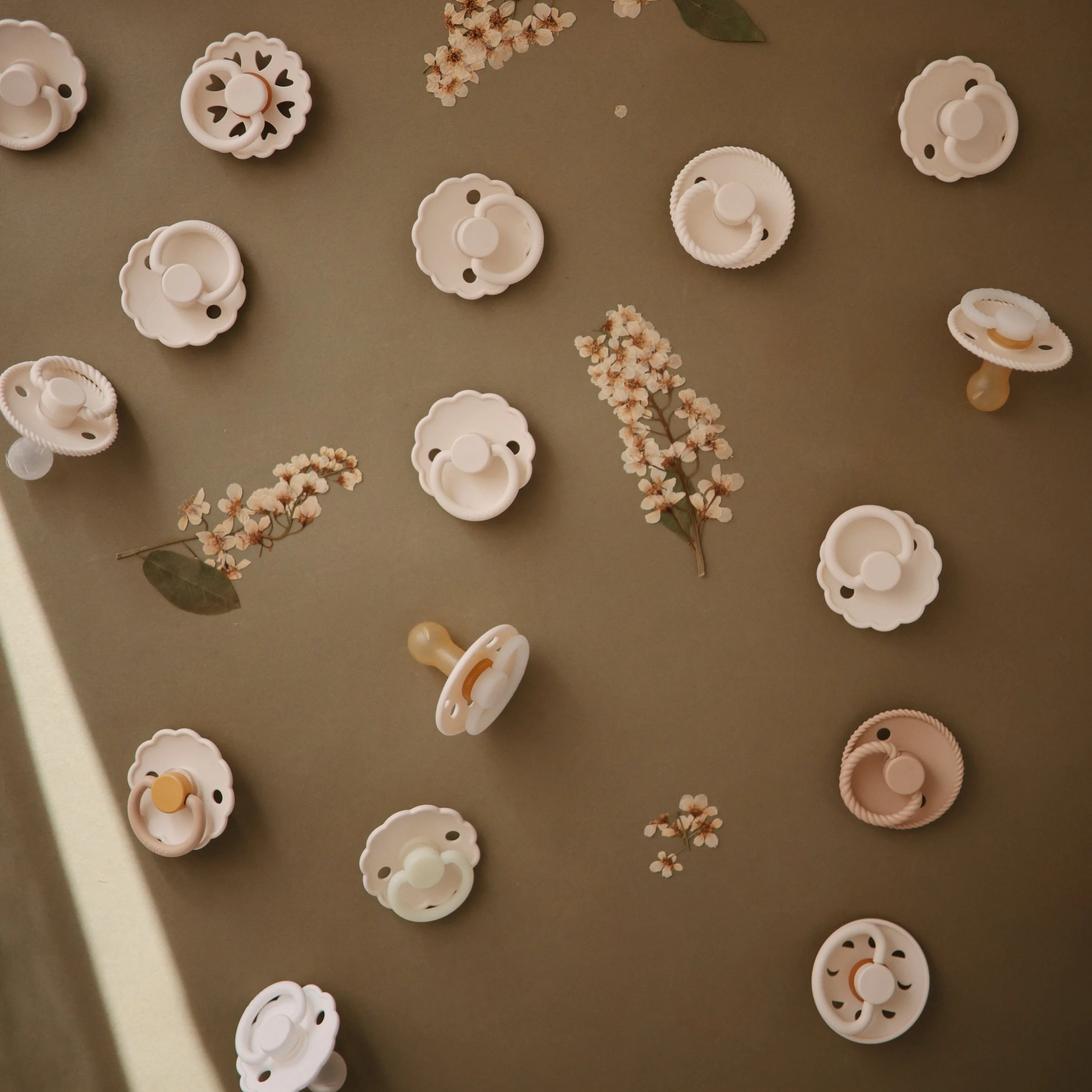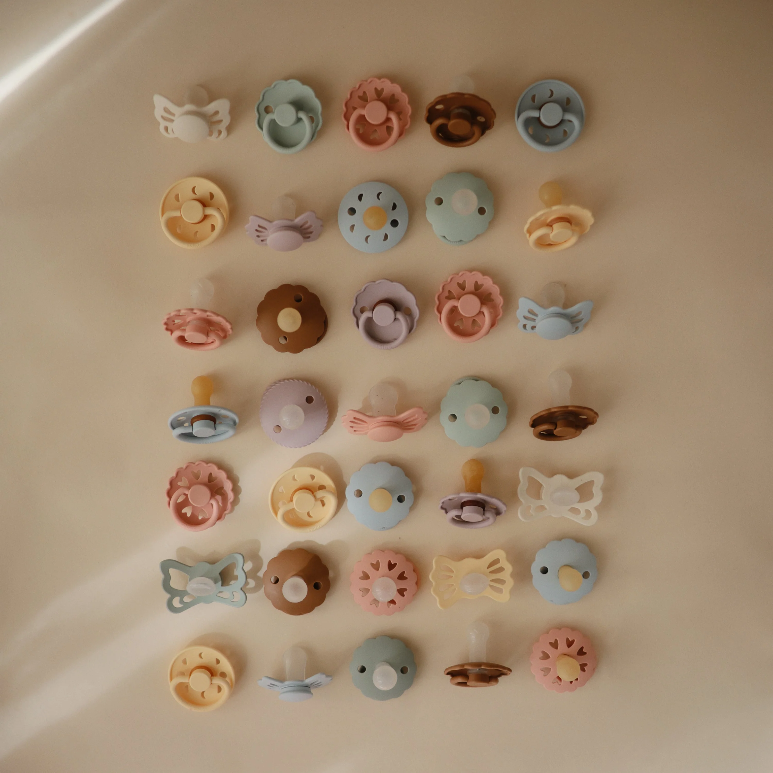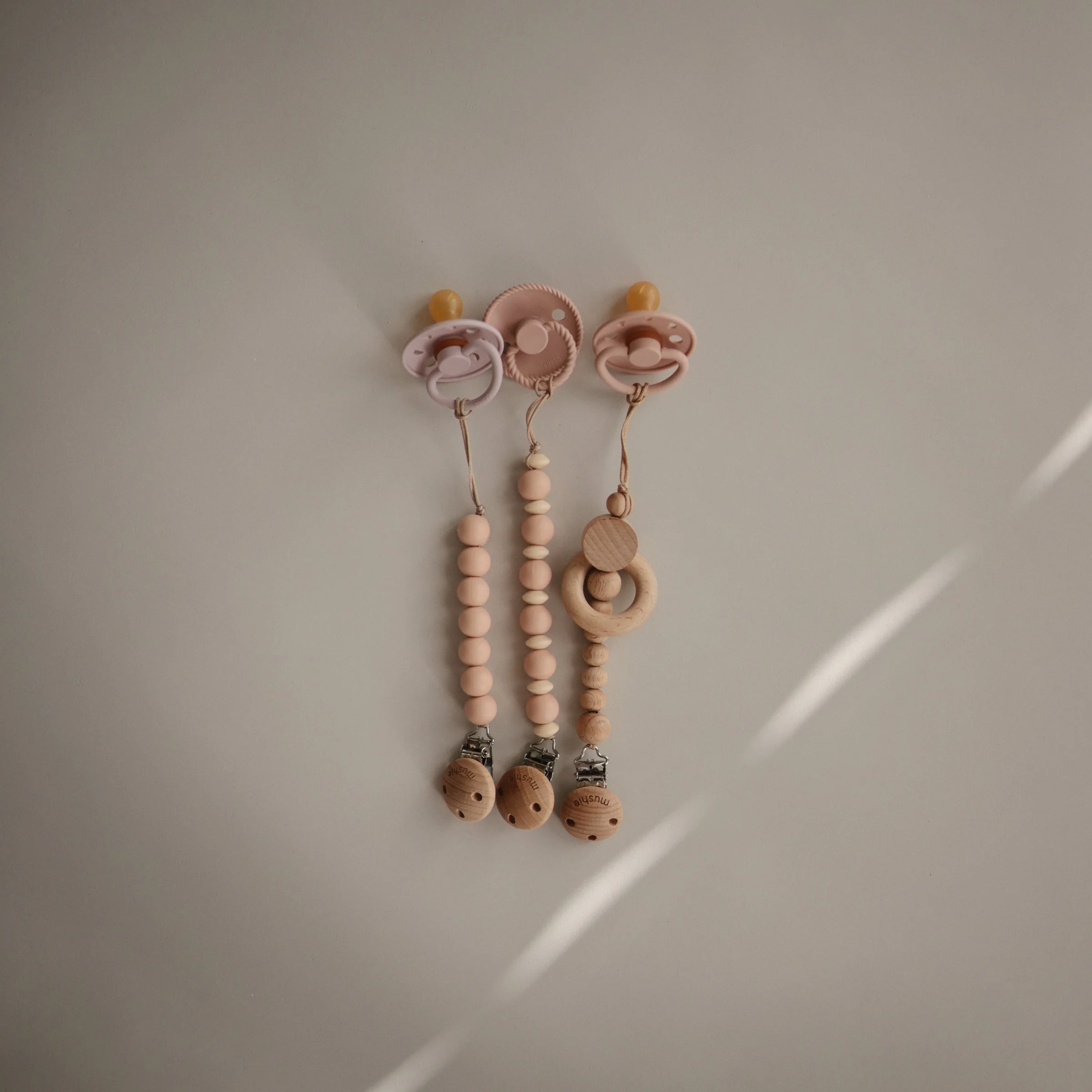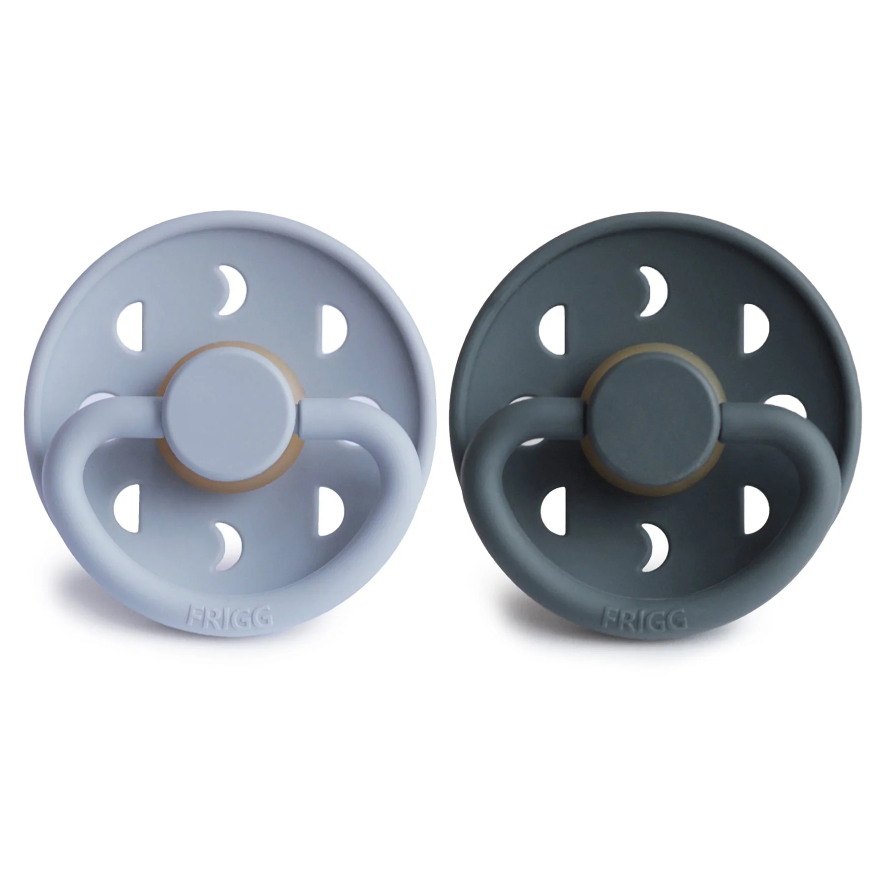 The FRIGG line of moon phase rubber pacifiers is thoughtfully designed for your baby's comfort and inspired by the moon in motion. The outward curve keeps the pacifier off delicate skin, while air holes and a security handle ensure your baby stays safe. Within the pacifier shield, air holes reveal the eight phases of the moon in subtle detail. Available in a range of soft colors, FRIGG pacifiers make a beautiful addition to your collection of baby essentials.