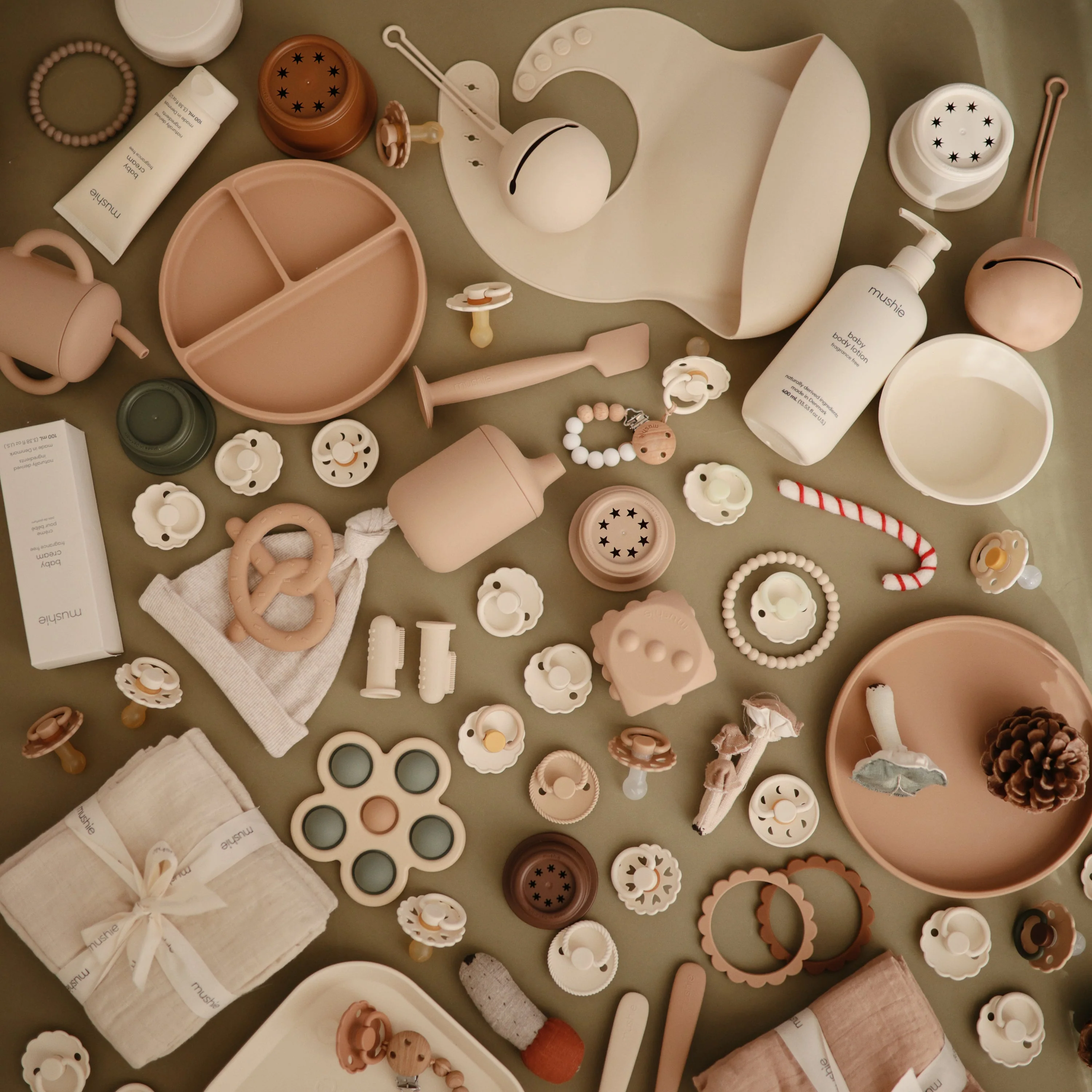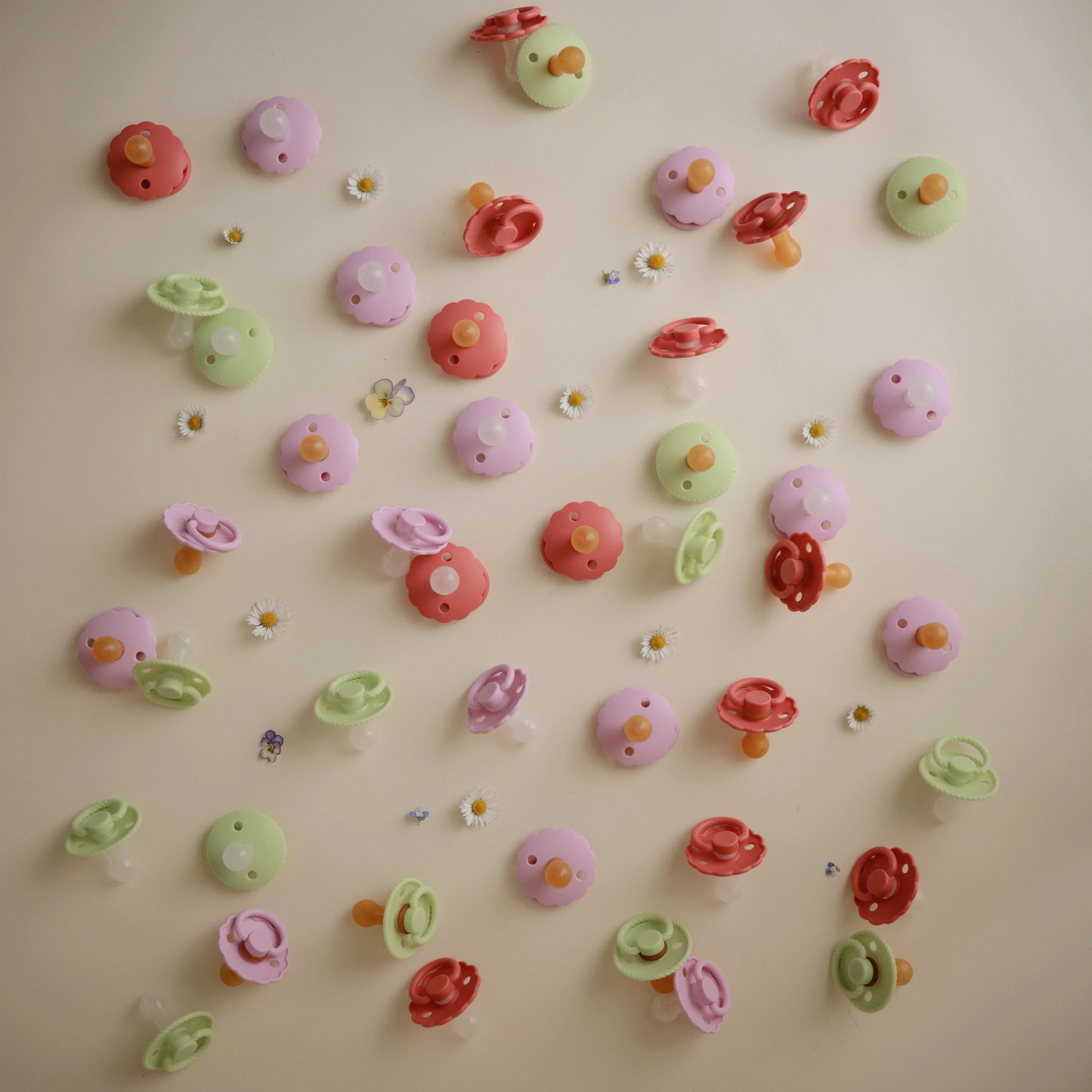 - Pacifiers are made with natural rubber and may expand with use.
