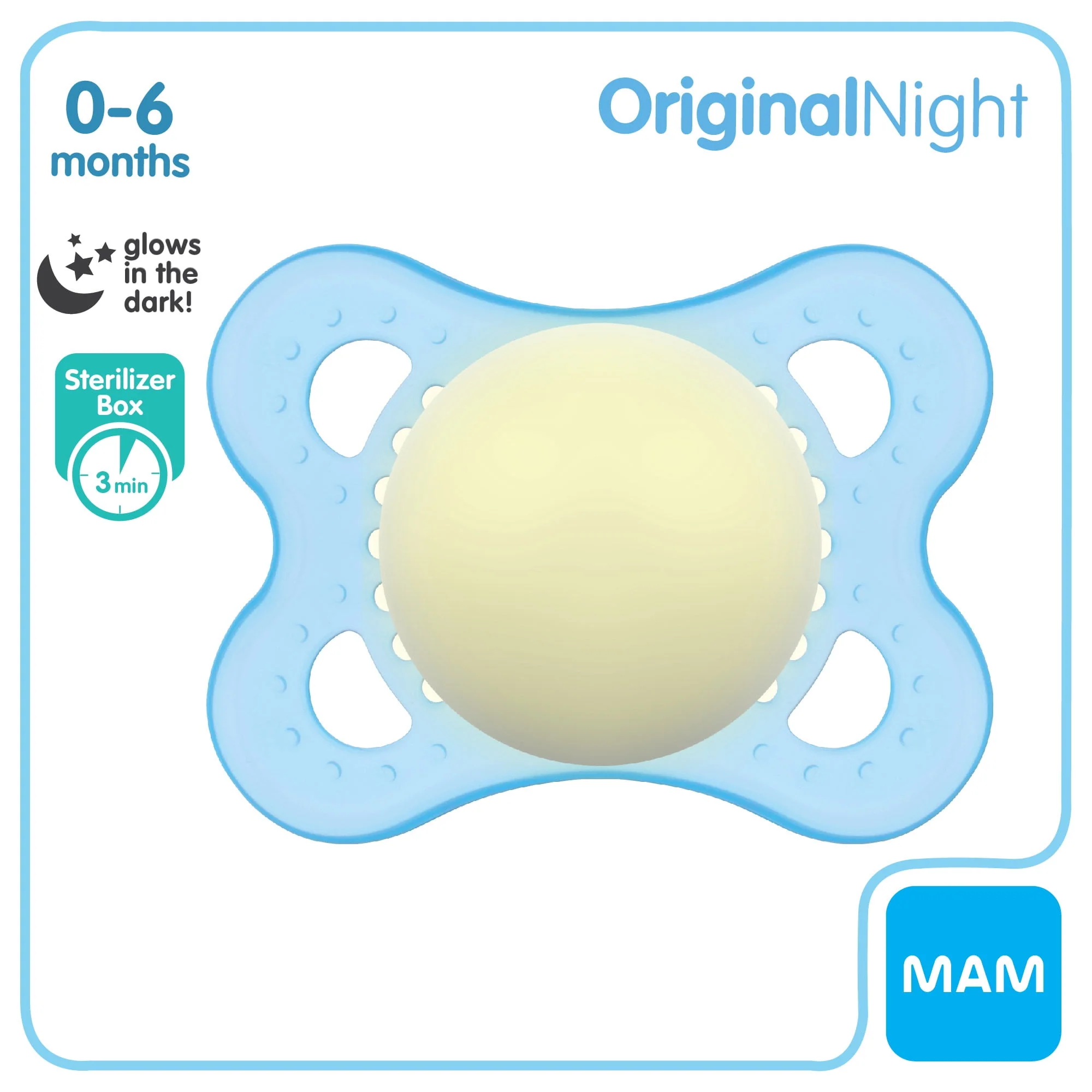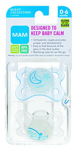 - PRODUCT DETAILS – MAM Night Pacifiers, 2-Count Baby Boy Pacifiers, 0-6 Months, Sterilizing Pacifier Holder