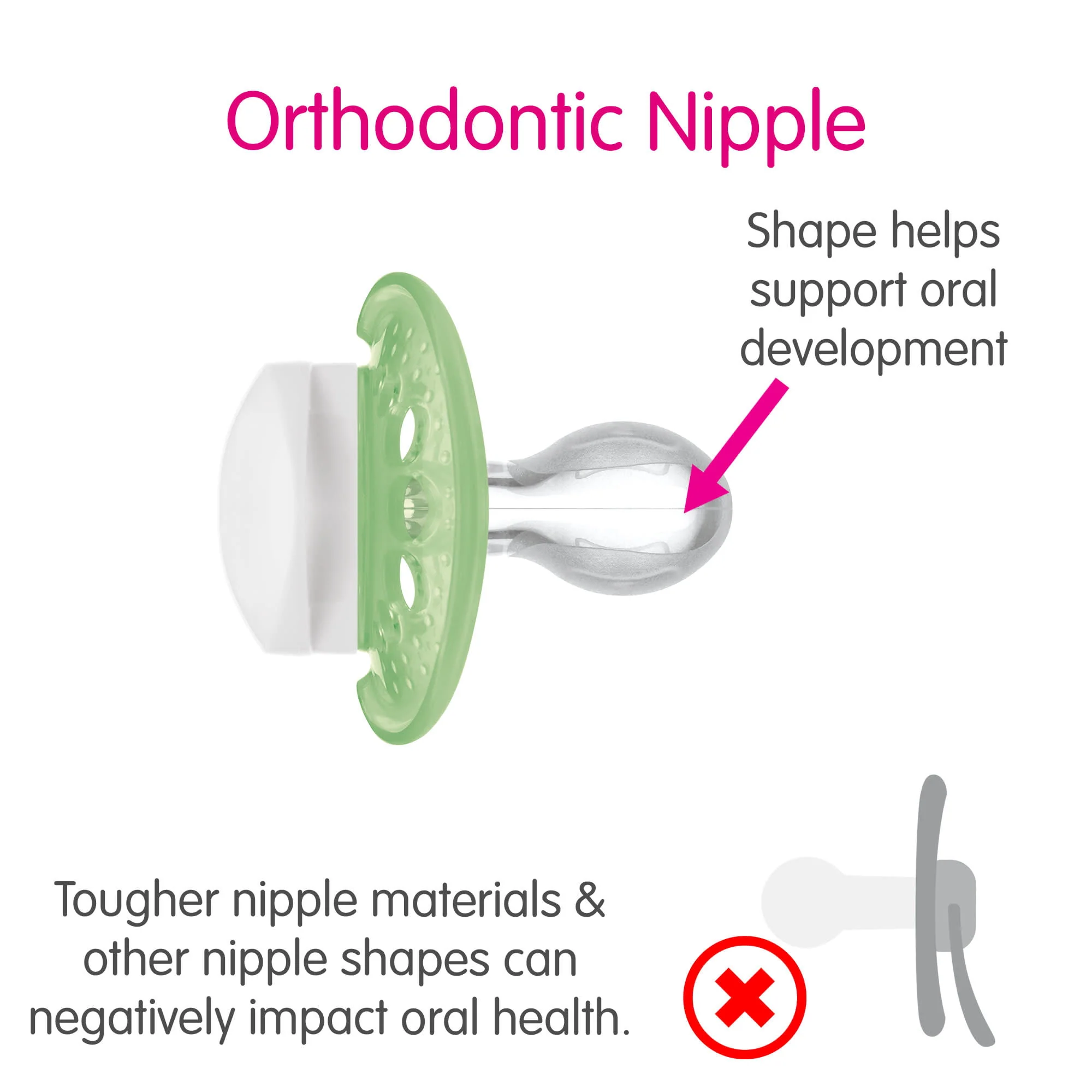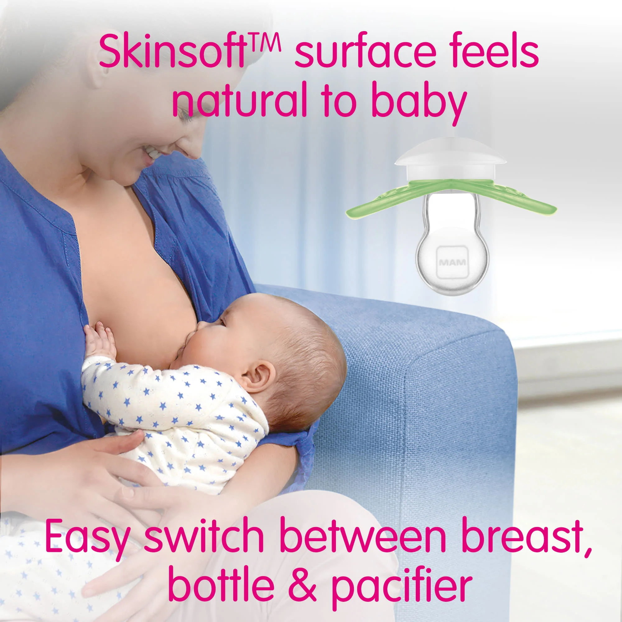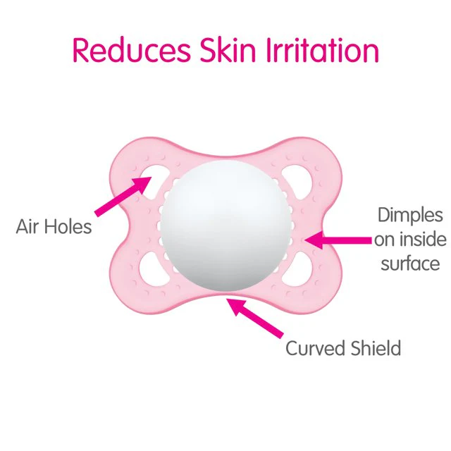 - SILICONE NIPPLE – The BPA-free silicone nipple is a signature MAM pacifier design, with silky SkinSoft material and a symmetrical shape that's ideal for jaw and teeth development.