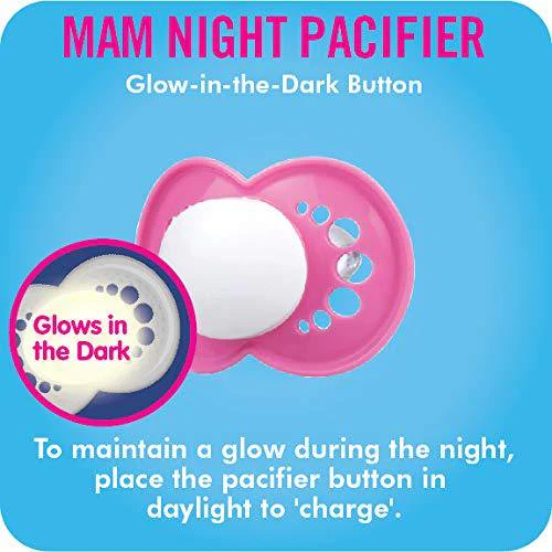 No more frustration trying to find your lost pacifiers at night! This pack includes two cute daytime pacifiers and one that glows in the dark, making it easy for baby and parent to find in the dark. BPA/BPS-free MAM Day & Night Pacifiers were developed by leading paediatric dentists and developmental psychologists to provide maximum comfort and style for babies 0-6 months old*