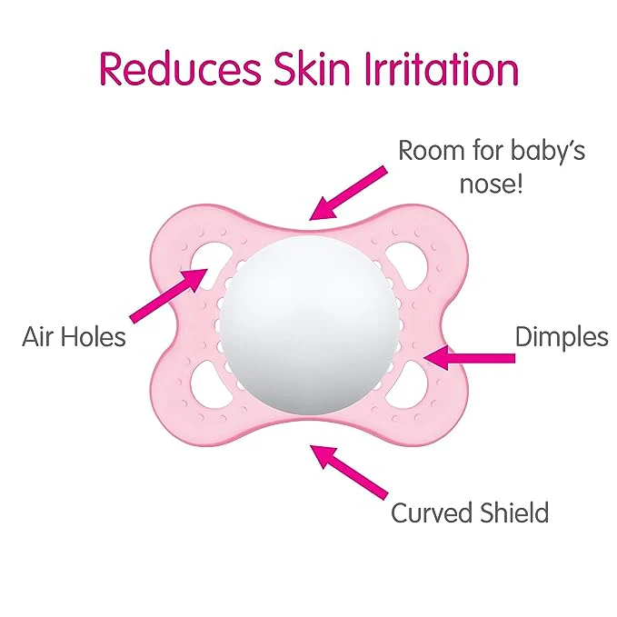 - SKIN IRRITATION PREVENTION: Curved shield and innovative bumps on inner pacifier surface prevent moisture from being trapped against baby's delicate skin.