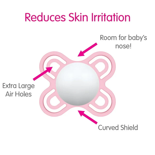 - COMFORTABLE DESIGN – The BPA-free SkinSoft silicone nipple with a signature MAM pacifier shield design and the extra large air holes let baby's skin breathe and keep it dry.