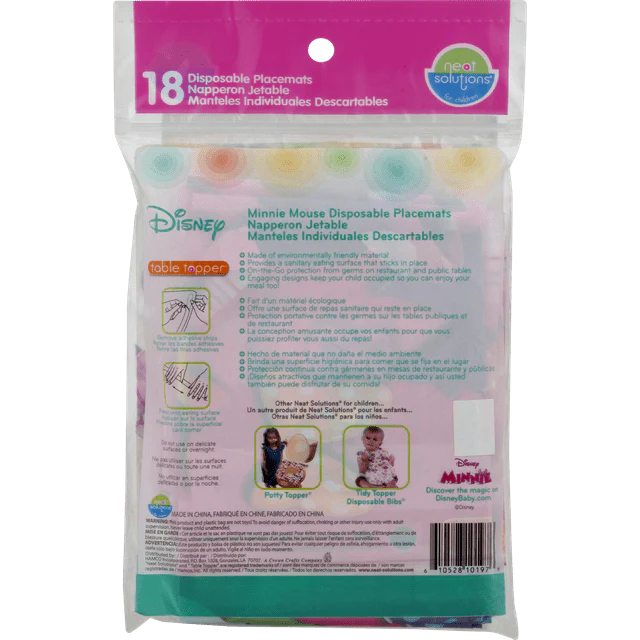 Protect your child from germs wherever they go while letting them play with their favorite Disney mouse with the Neat Solutions Disposable Stick-On Placemats. The backing sticks in place at the table making this a must-have item for parents to take their kids out to restaurants or friends homes at meal time. The table topper disposable place mats for baby come in an 18-count package ensuring that you have enough for plenty of trips away from home. The products are eco-friendly and can be disposed of after just one use minimizing the germs that reach your child s hands and mouth. The Neat Solutions disposable stick-on place mats a 12 x 18 area.