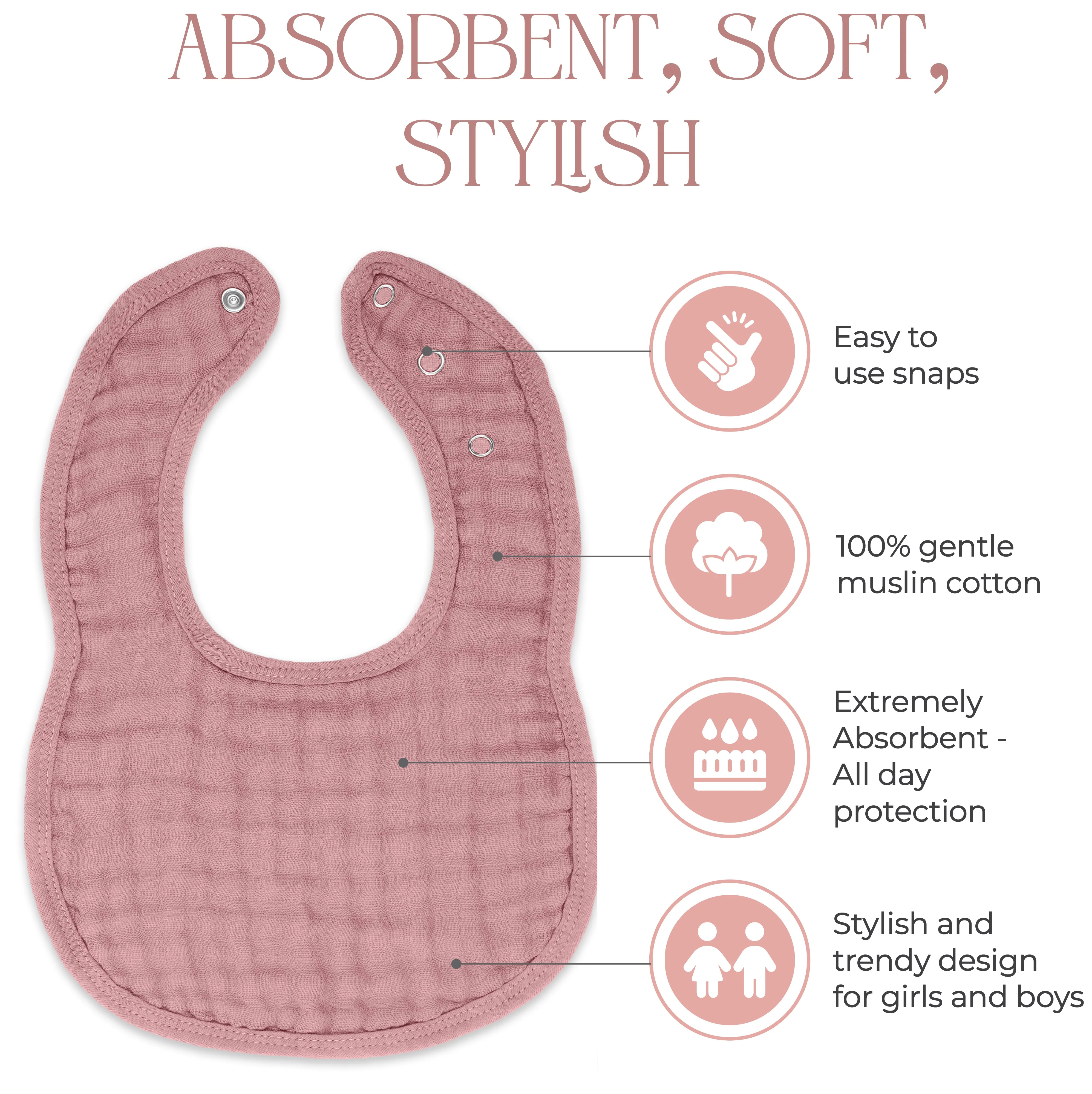 • These bibs feature easy-to-use snaps, making it a breeze to get them on and off your little one quickly and easily. No more fussing with complicated closures that take forever to secure.