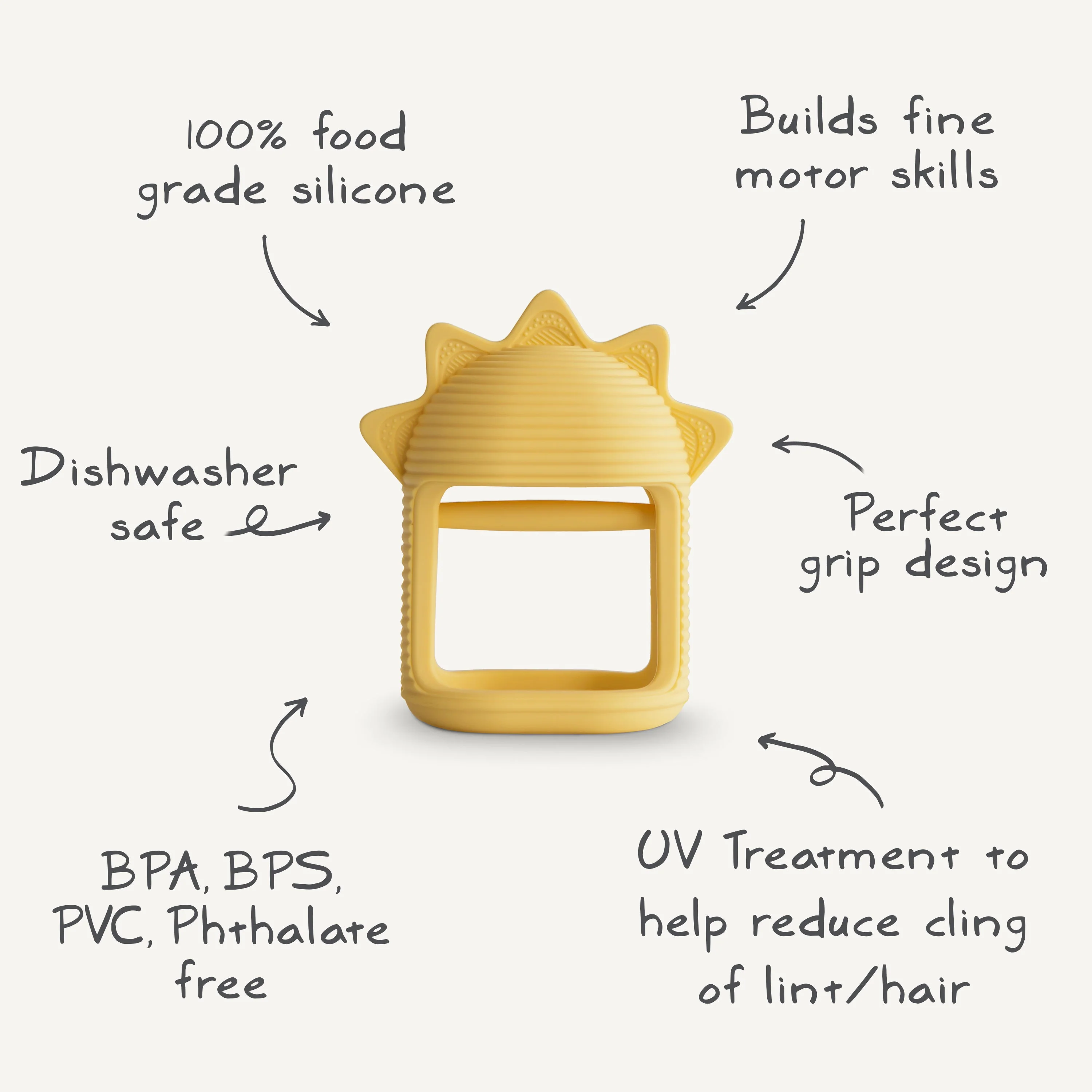 Find brighter days ahead with our no-drop sun teether that offers soothing comfort and sensory features. With an interior handle that's easy to grasp without dropping, baby will enjoy holding tight and exploring the textured surface and soft edges. Made from 100% food grade silicone, this toy is safe for mouthing and chewing as littles seek relief for sore gums.
