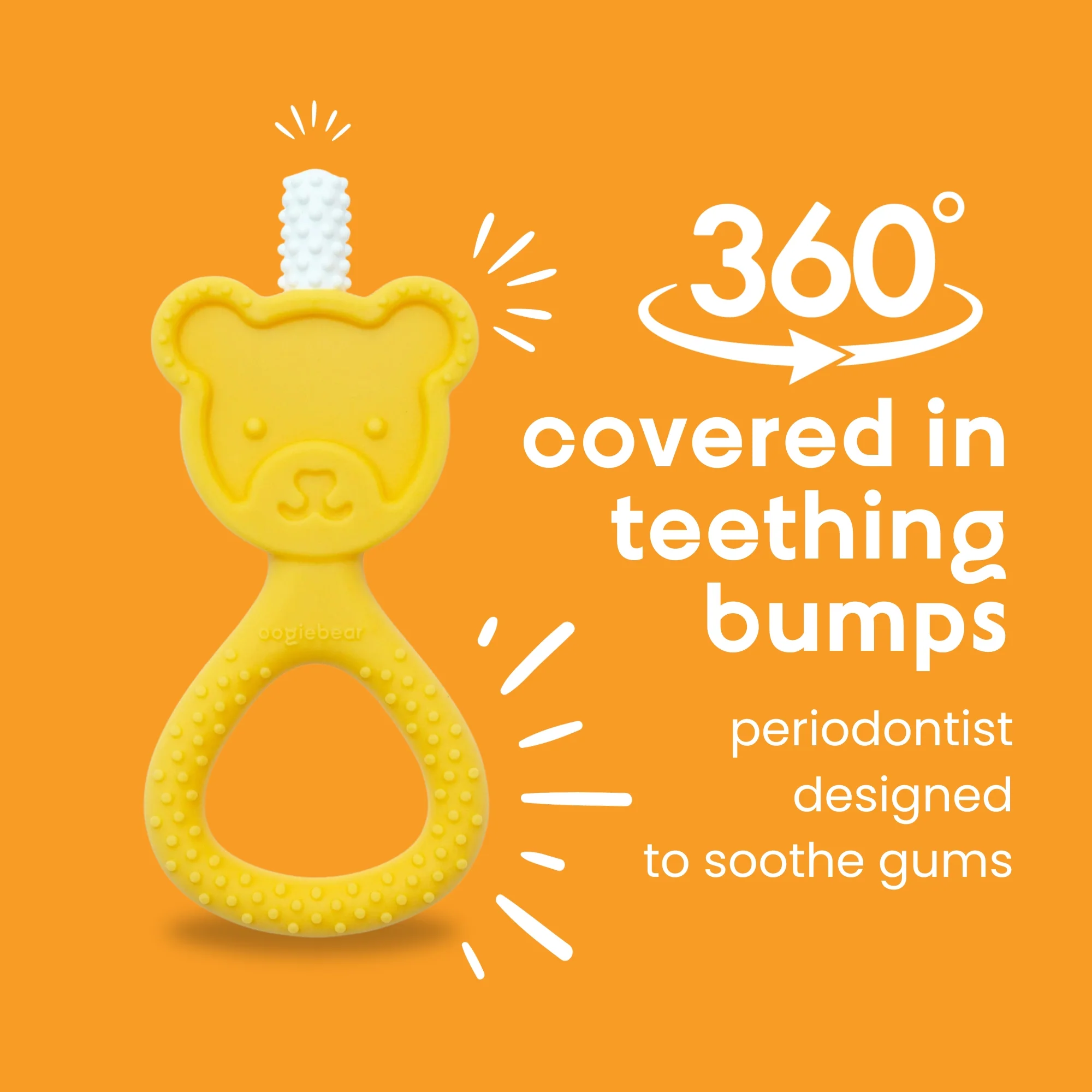 Made from high-quality silicone with an easy-grip loop, the 360 Teether from oogiebear has an innovative bear head design that prevents it from going too far into little mouths. 360-degree bristles brush and massage sore gums and teeth, plus smooth bumps on the bear ears and bottom of the silicone base further stimulate their gums.