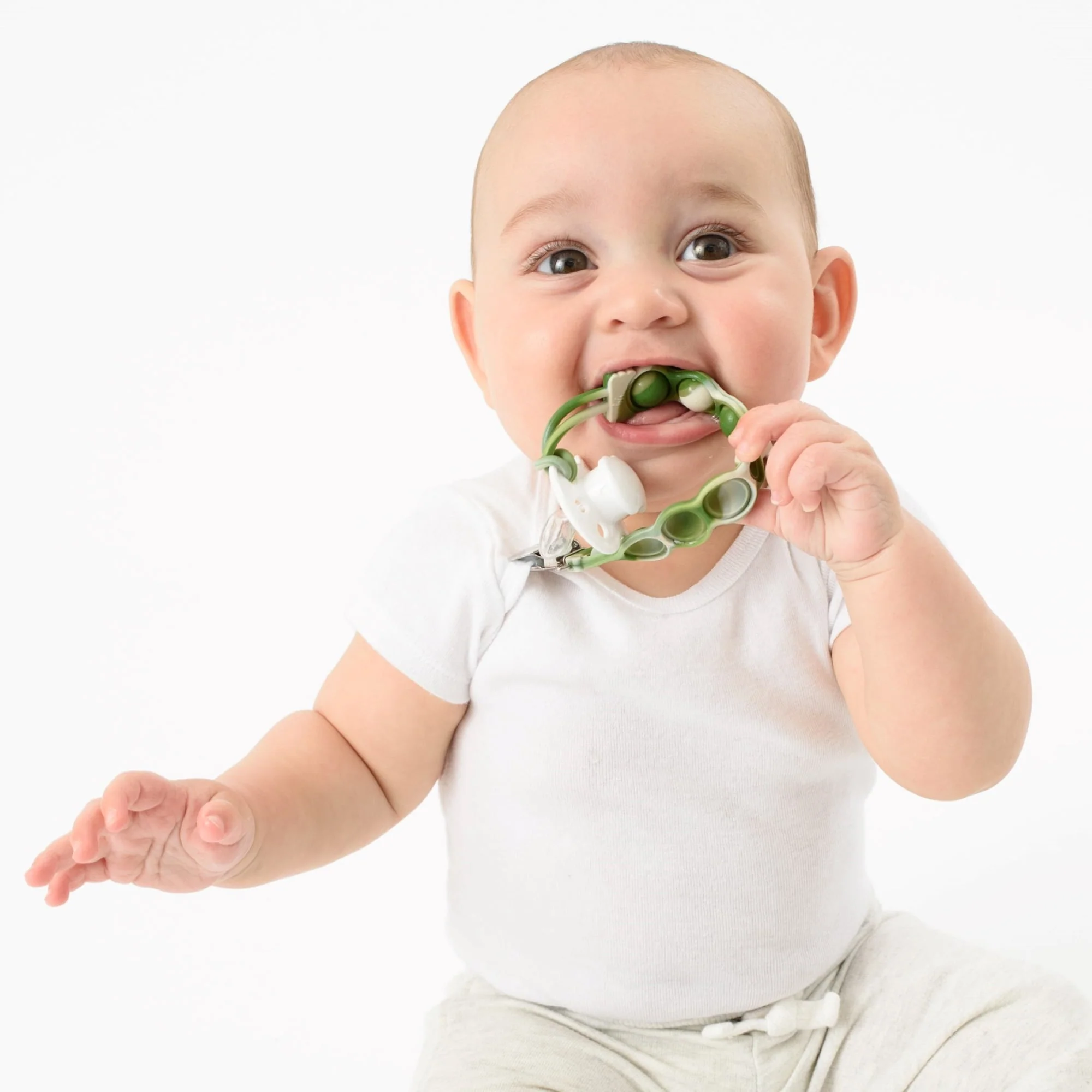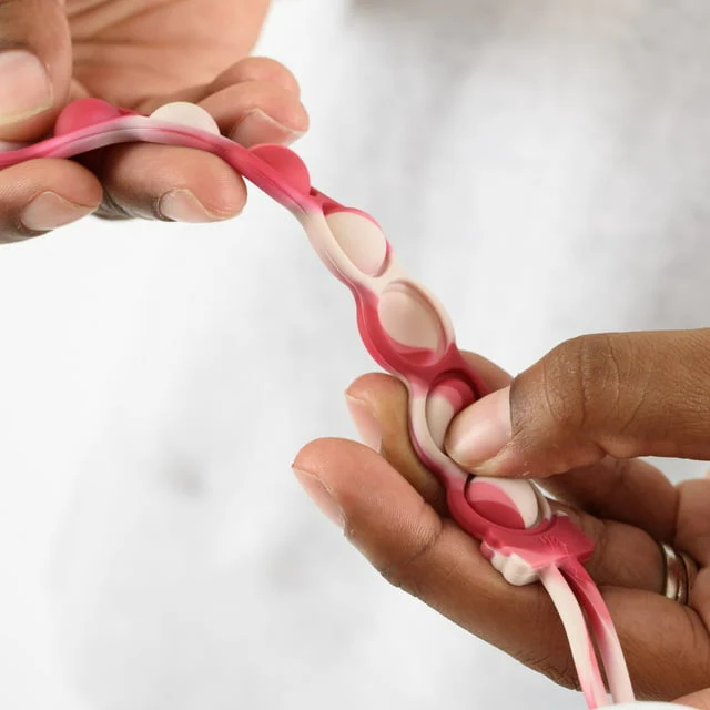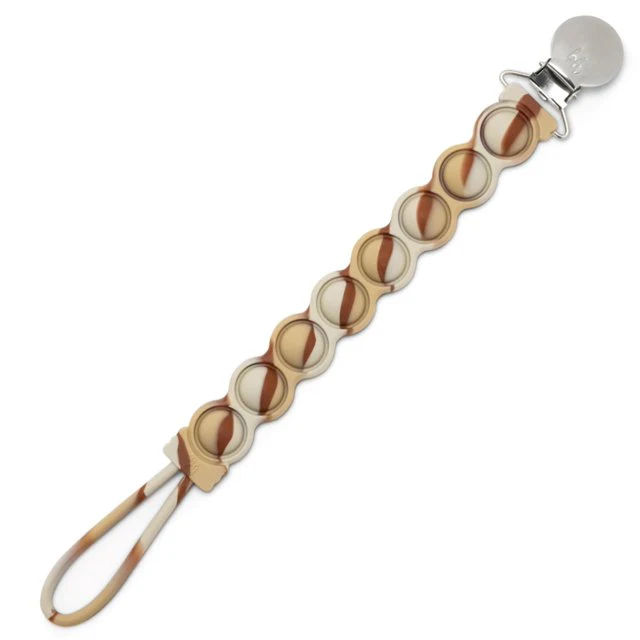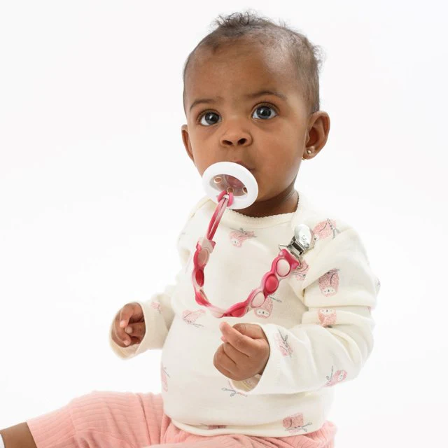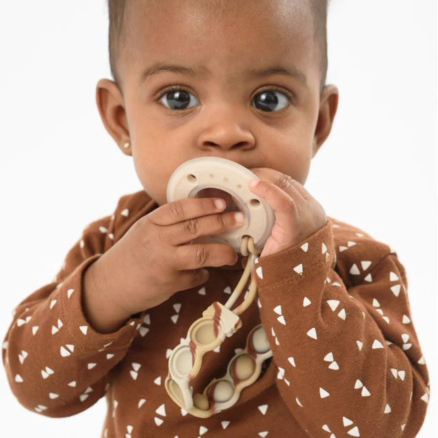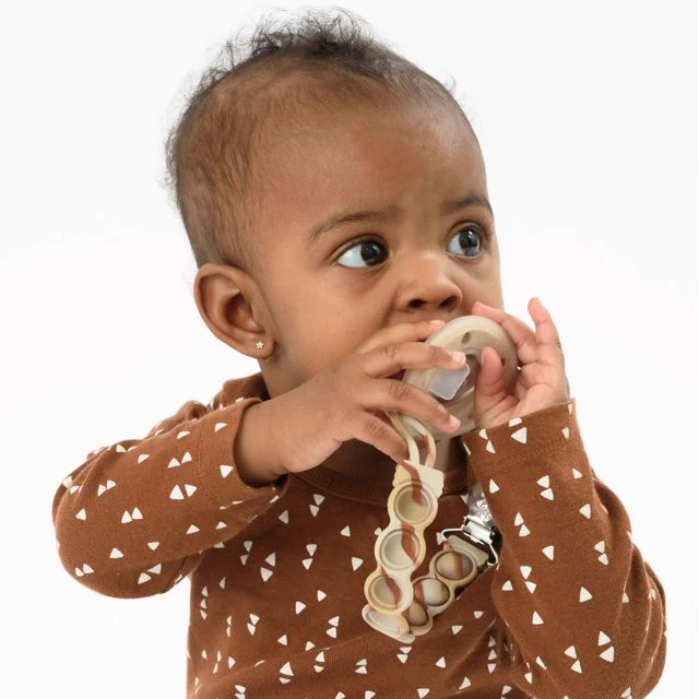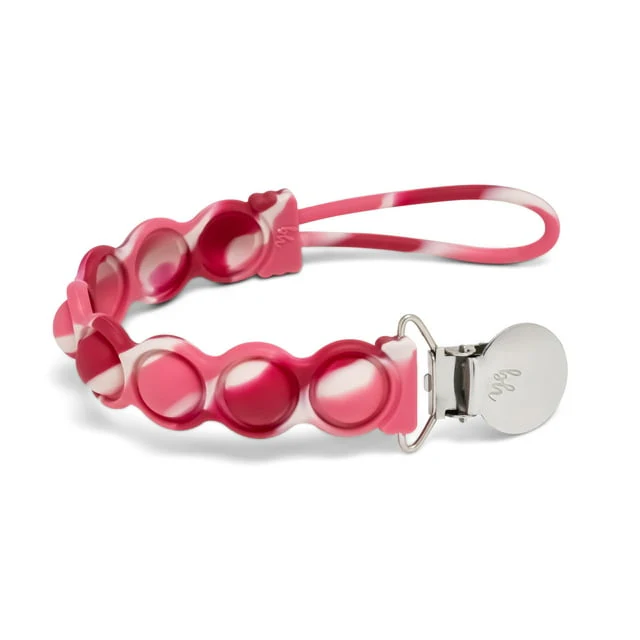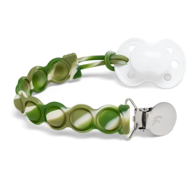 POP! Pop, pop, pop, pop, pop! BooginHead’s POP Sensory Silicone Pacifier Clip is a flexible, single-molded one-piece silicone strap designed to emulate your favorite sensory stim fidget toy. POP Sensory Silicone Pacifier Clip has a universal loop that works with any pacifier your baby likes, and a strong stainless steel clip that holds tight and still manages to be gentle on fabrics. BooginHead’s POP Sensory Silicone strap is calming, soothing fun for moms, dads, and babies. The unique bubble pop shape offers more angles, edges, textures, and varying resistance points to massage sore gums, while chic, stylish colors and patterns match any outfit.