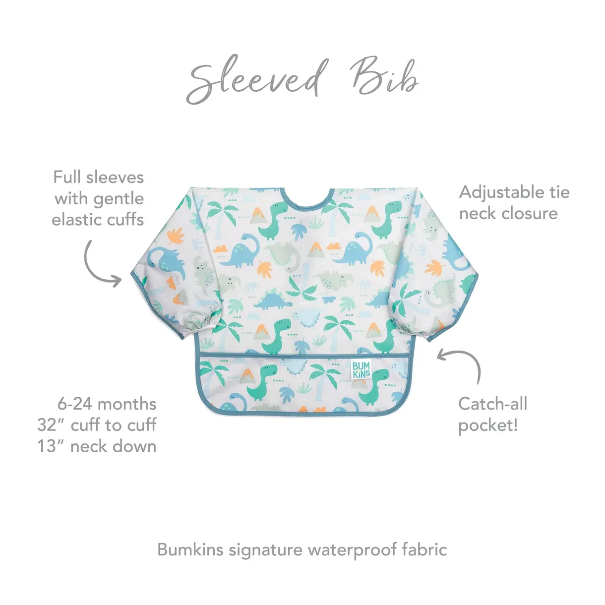 Our Sleeved Bib saves one outfit at a time. With a handy crumb catcher / catch-all pocket for containing spills. Generously sized and made from Bumkins lightweight, waterproof, easy-wipe, stain and odor-resistant fabric.