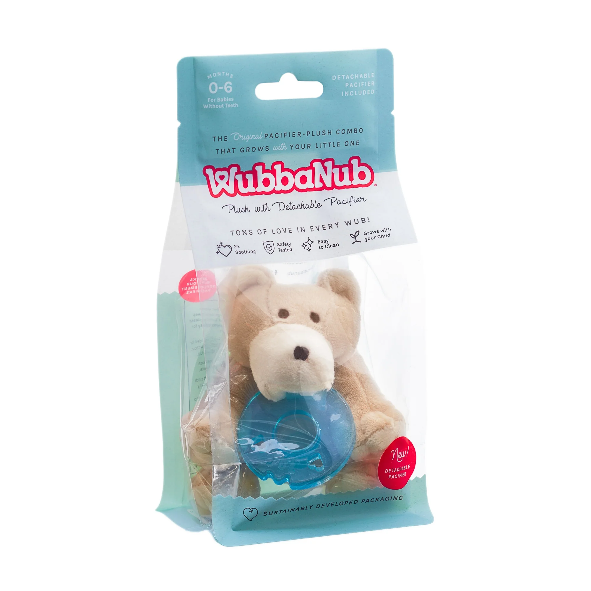 The detachable pacifier design means your WubbaNub adapts and grows with your little one. The patent-pending design contains no snaps for safety or hook and loop fasteners for durability. The 0-6 month pacifier included is washable, detachable, and replaceable making the WubbaNub detachable extra loveable! The unique style of WubbaNub allows it to remain close and easily positioned by baby offering twice the soothing.