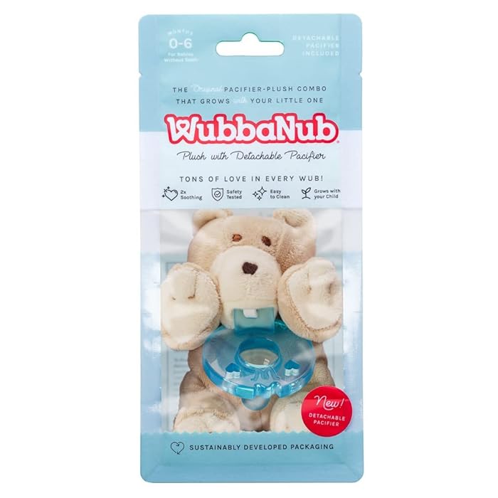 WubbaNub, the original pacifier-plush brand has added a detachable design to their award winning line. With the same self-soothing qualities, The WubbaNub detachable design contains no snaps or hook and loop fasteners for convenience. Babies who are not teething, regardless of age. 3 pack replaceable pacifier sold separately.
