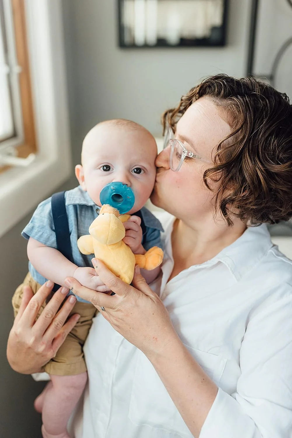 - Plush animal makes it easy for baby to grasp and manipulate the pacifier.