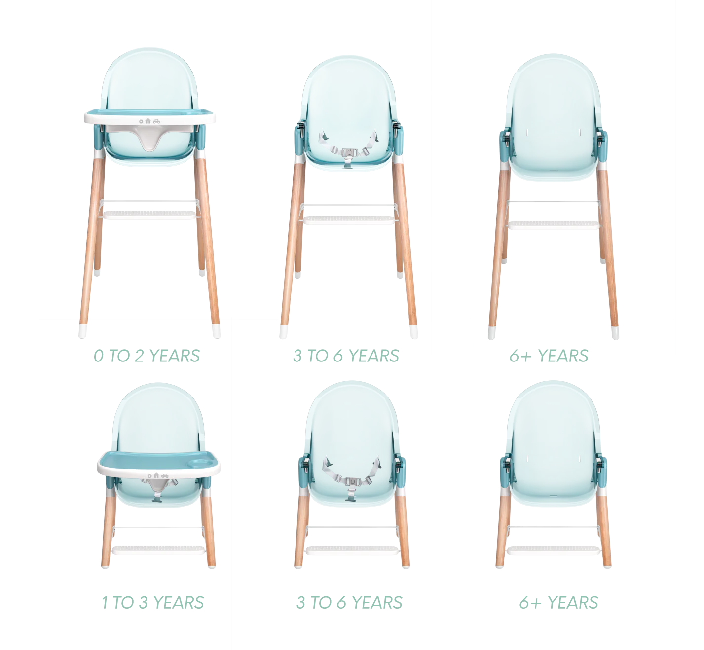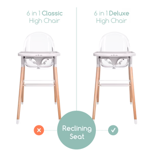 The removable tray and legs make it easy for this high chair to change to your growing child. Our design allows for you to use this from ages 6 months to 6 years old as a high chair, booster seat, or kids chair. The chair comes with three reclining levels, so you are able to adjust as your child gets older.