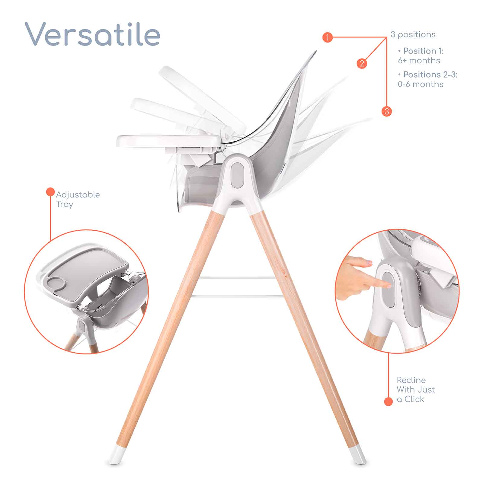 The removable tray and legs make it easy for this high chair to change to your growing child. Our design allows for you to use this from ages 6 months to 6 years old as a high chair, booster seat, or kids chair. The chair comes with three reclining levels, so you are able to adjust as your child gets older. - SAFETY FIRST