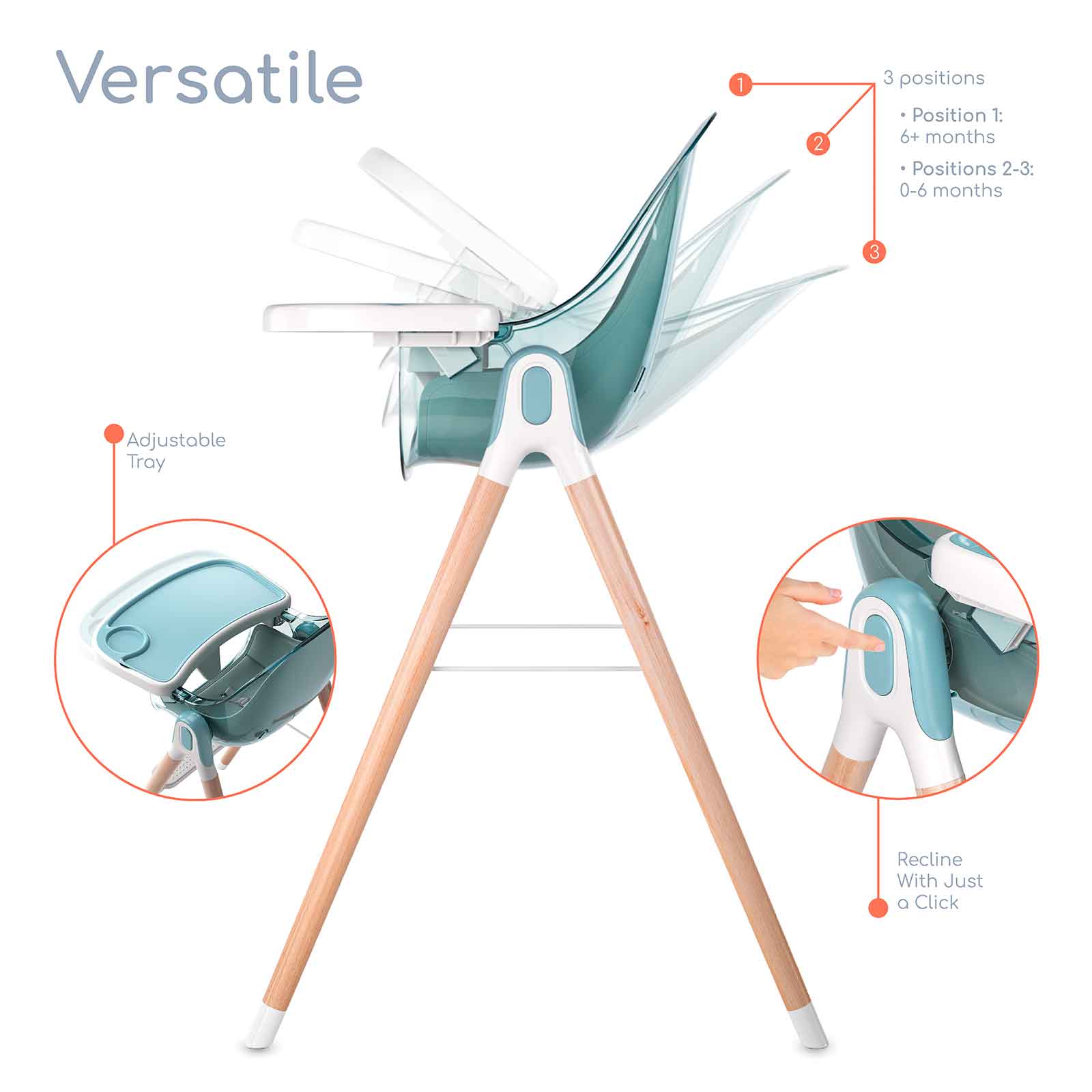Three positions to adjust to your child’s age and food ability. From bottles to eating solids the chair can accommodate your little one. The chair also transitions to different stages from infant to toddler to young child. - QUALITY & SAFE MATERIALS