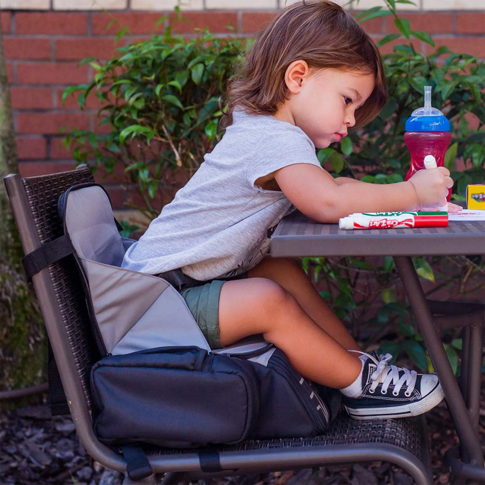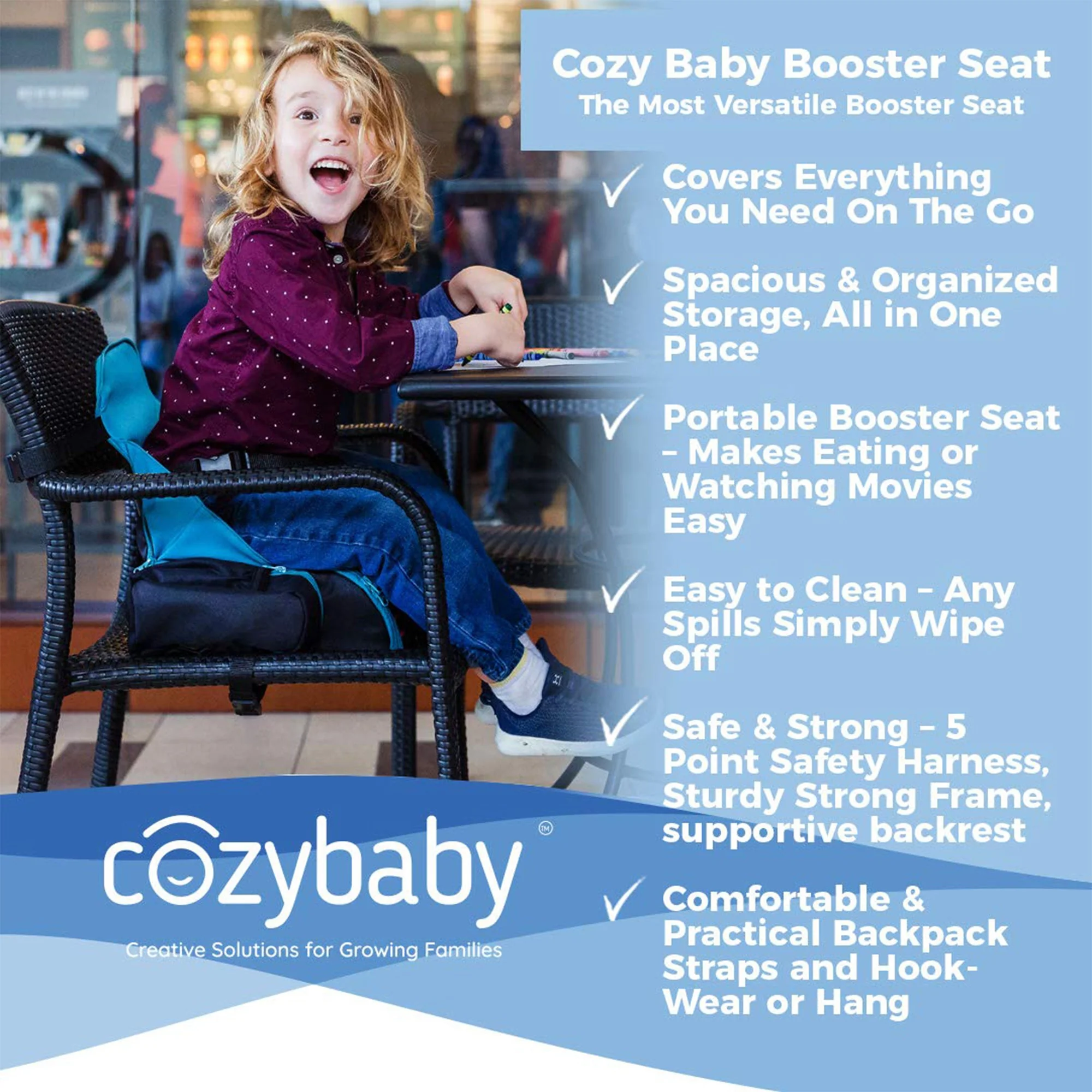 - This backpack has been designed to be supportive with a 5-point safety harness to hold your child securely when they eat