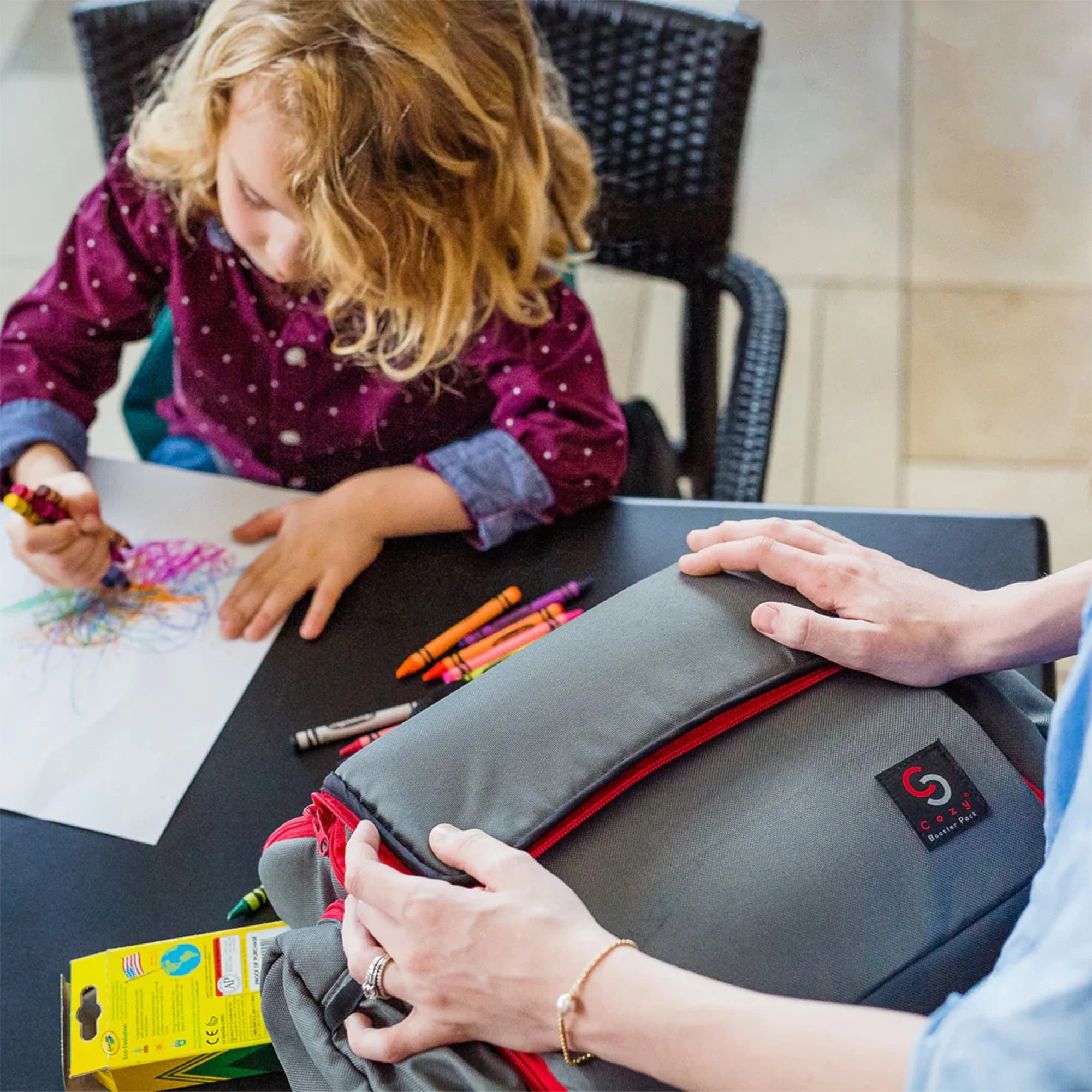 - This backpack has been designed to be supportive with a 5-point safety harness to hold your child securely when they eat