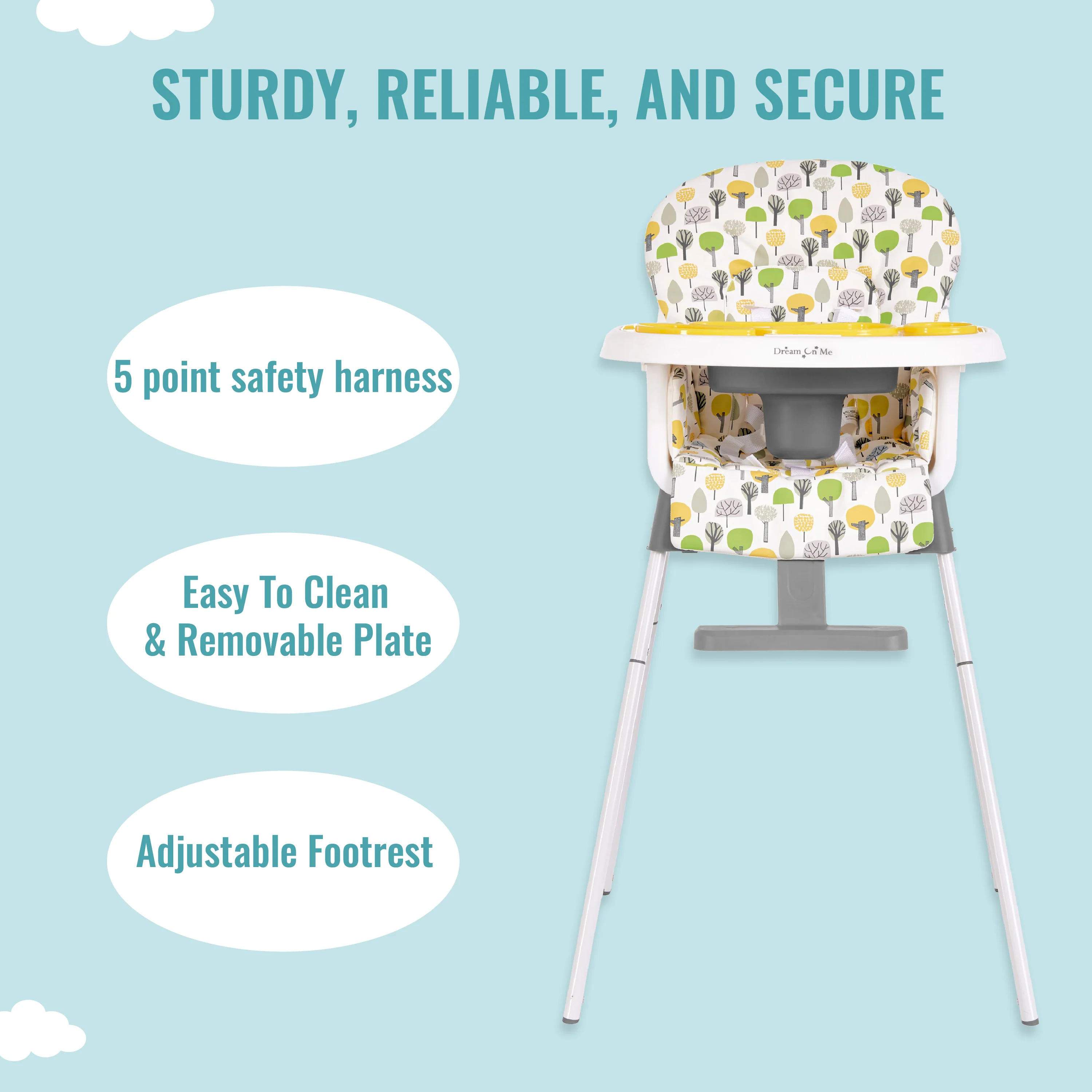 - Dream On Me Curio Sit N Seek High Chair for baby comes with a 5-point safety harness and is made of a sturdy, lightweight frame.