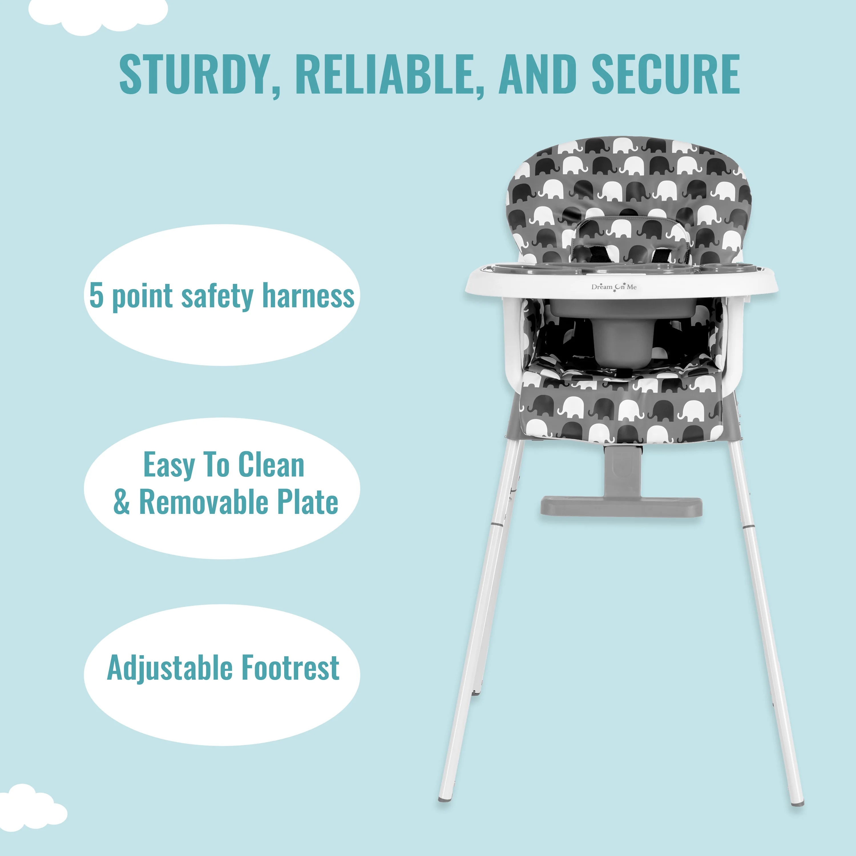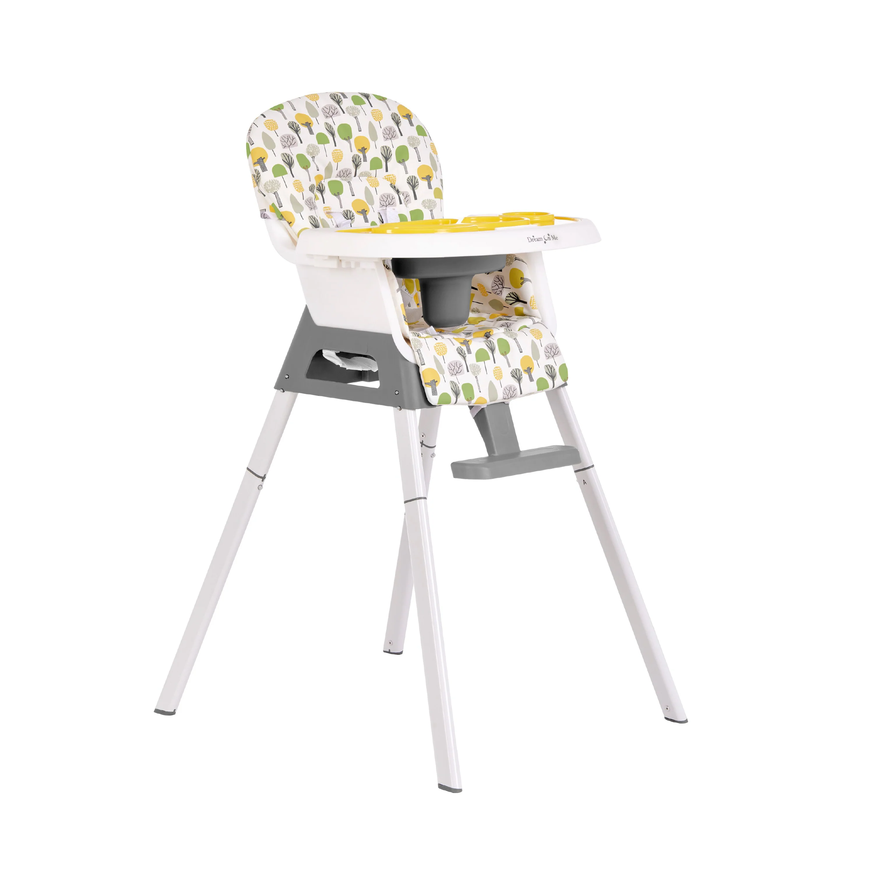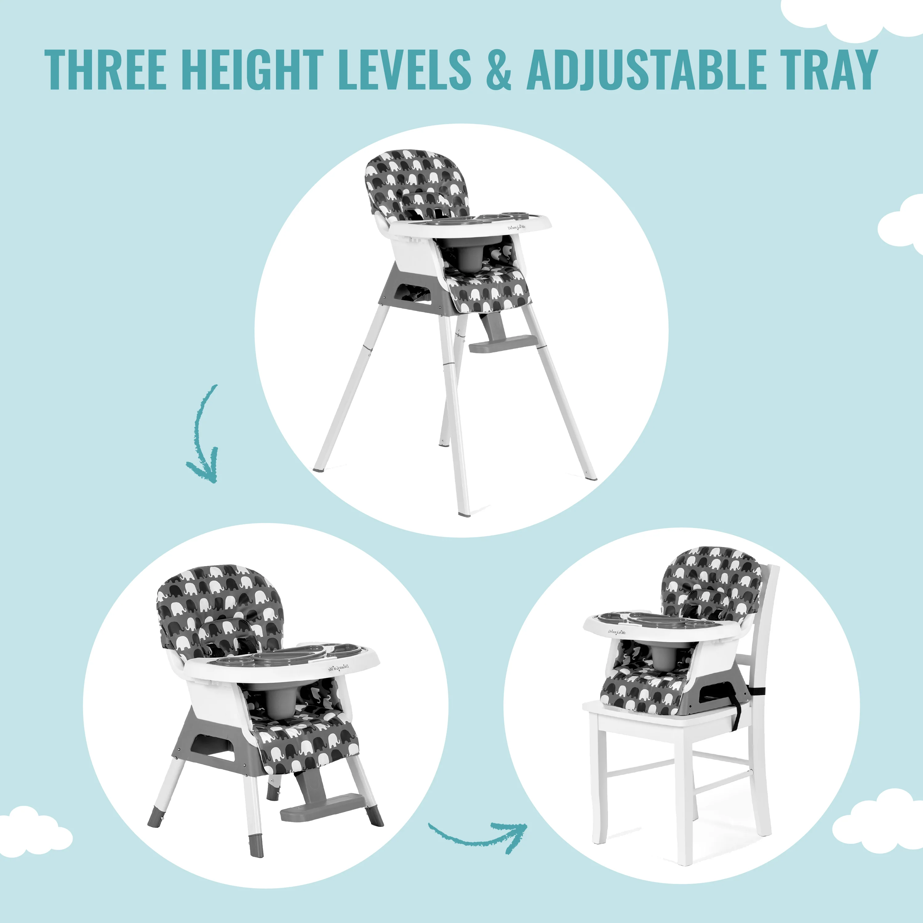 - The Dream On Me Curio Sit N Seek High Chair offers 3 height level adjustments, a 3-position adjustable tray, and an adjustable footrest, ensuring your child is always at the perfect level for feeding.