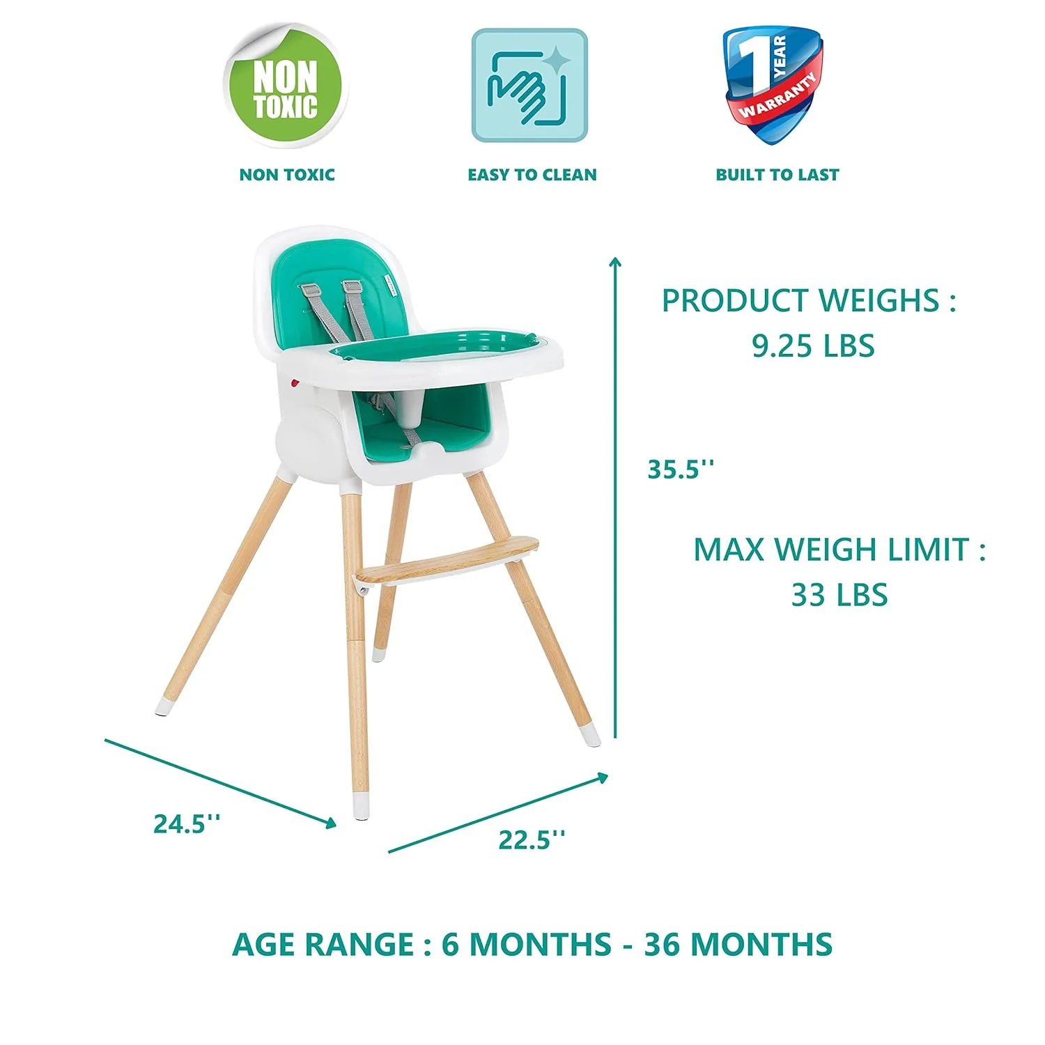 - PRODUCT SPECS. & WARNINGS: The Lulu 2-in-1 High Chair comes with dimensions of 24.5” L x 22.5” W x 35.5” H and weighs 9.25 lbs. It’s made for children aged 6 months till 3 years, or until they start sitting up independently.