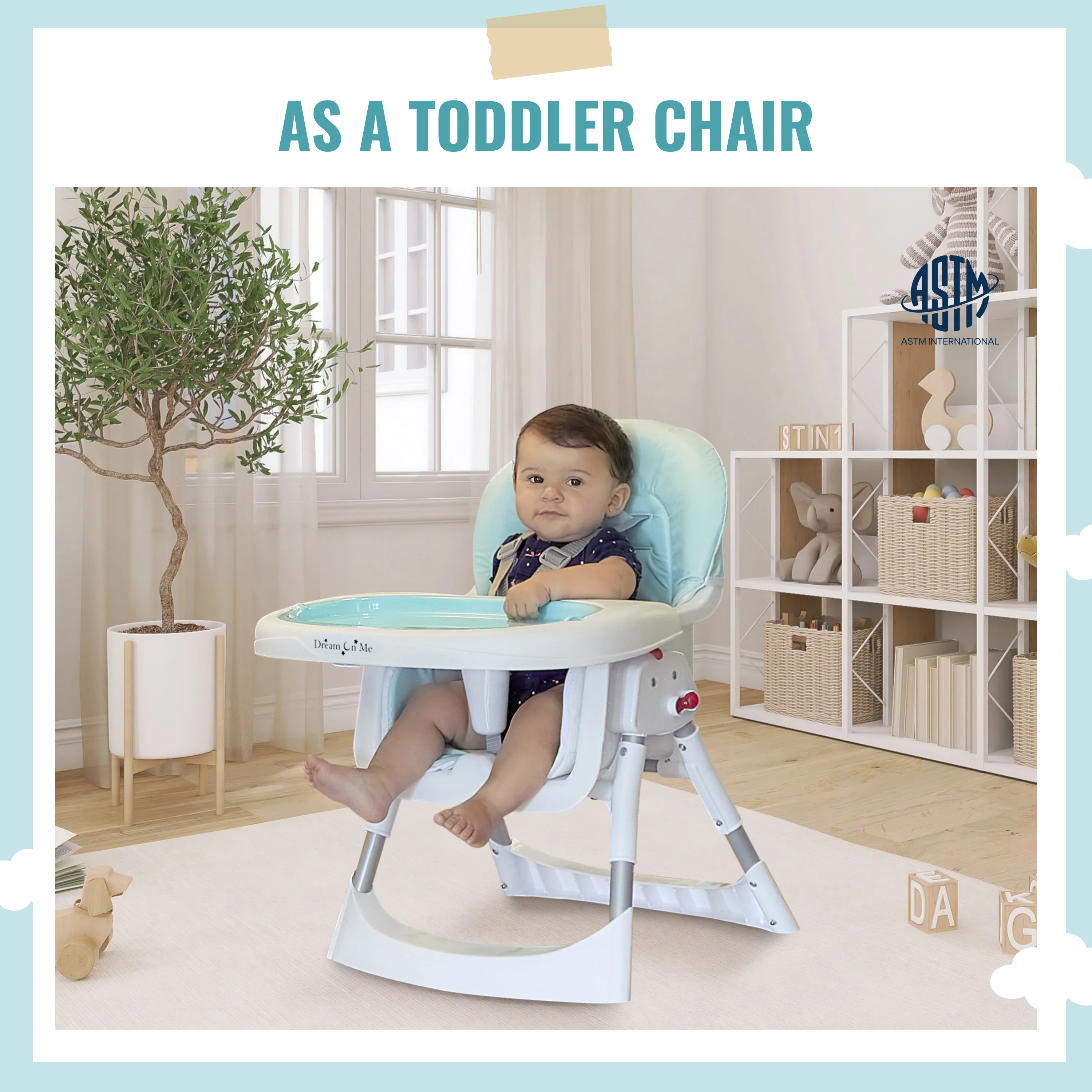 - The Tabletalk Highchair is fitted with a 5 point safety harness and anti-skid feet. It meets all ASTM/CPSC standards. Dimensions of Junior Chair are 17.5″ x 16″ x 24″ Weight is 5.5 lbs