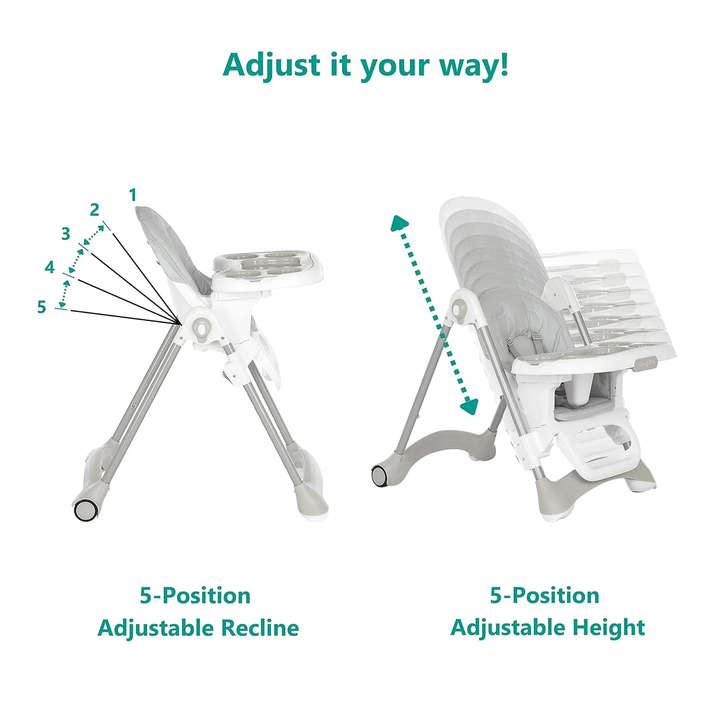 - It also comes with a 5-position adjustable seat recline and 3-position adjustable double tray - perfect for feeding or playing.