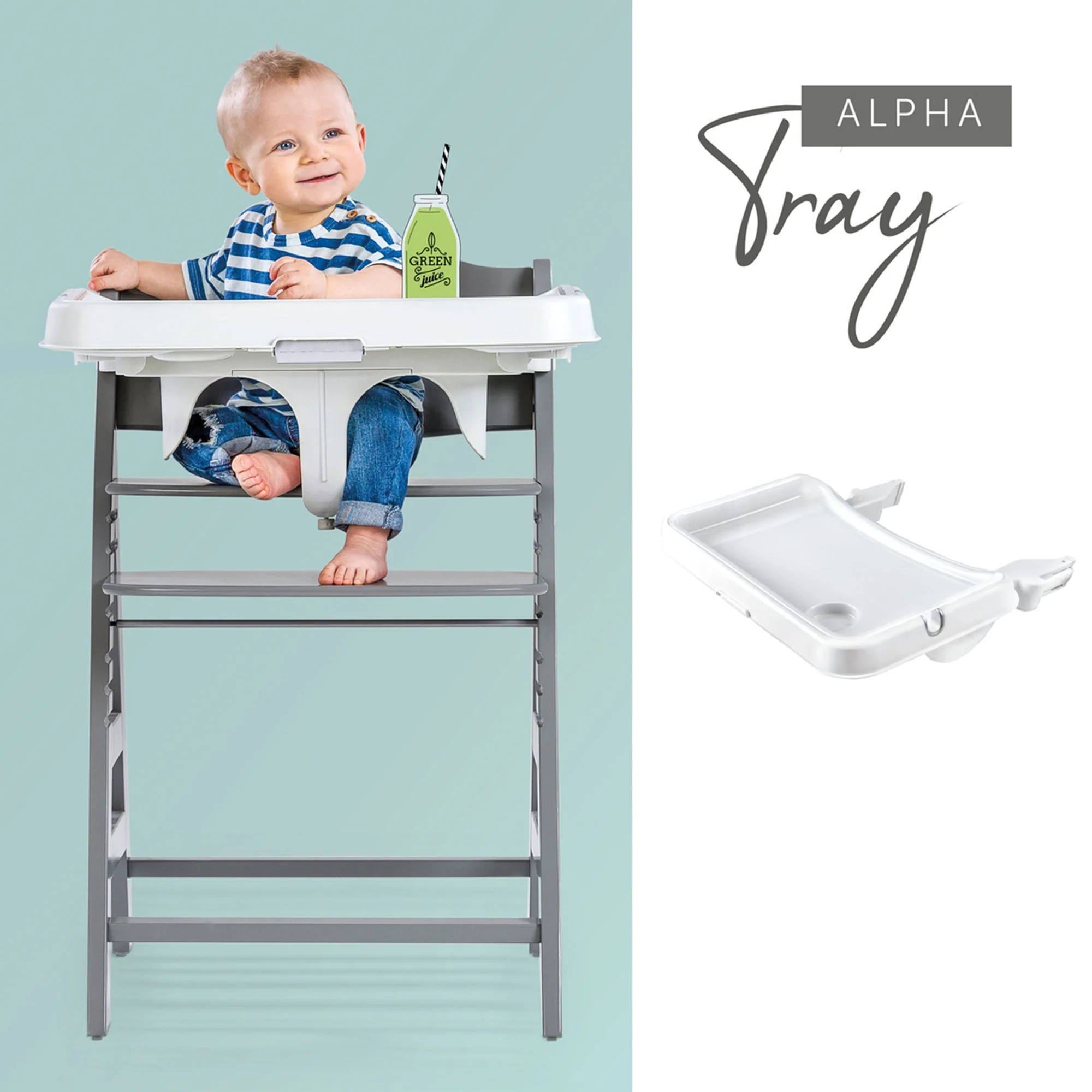 Designed to grow with your child, this table is adjustable up to 3 times in-depth. The practical food table easily slips on the grow-along Alpha plus and Beta plus wooden highchair base and clicks into place (high chair sold separately).