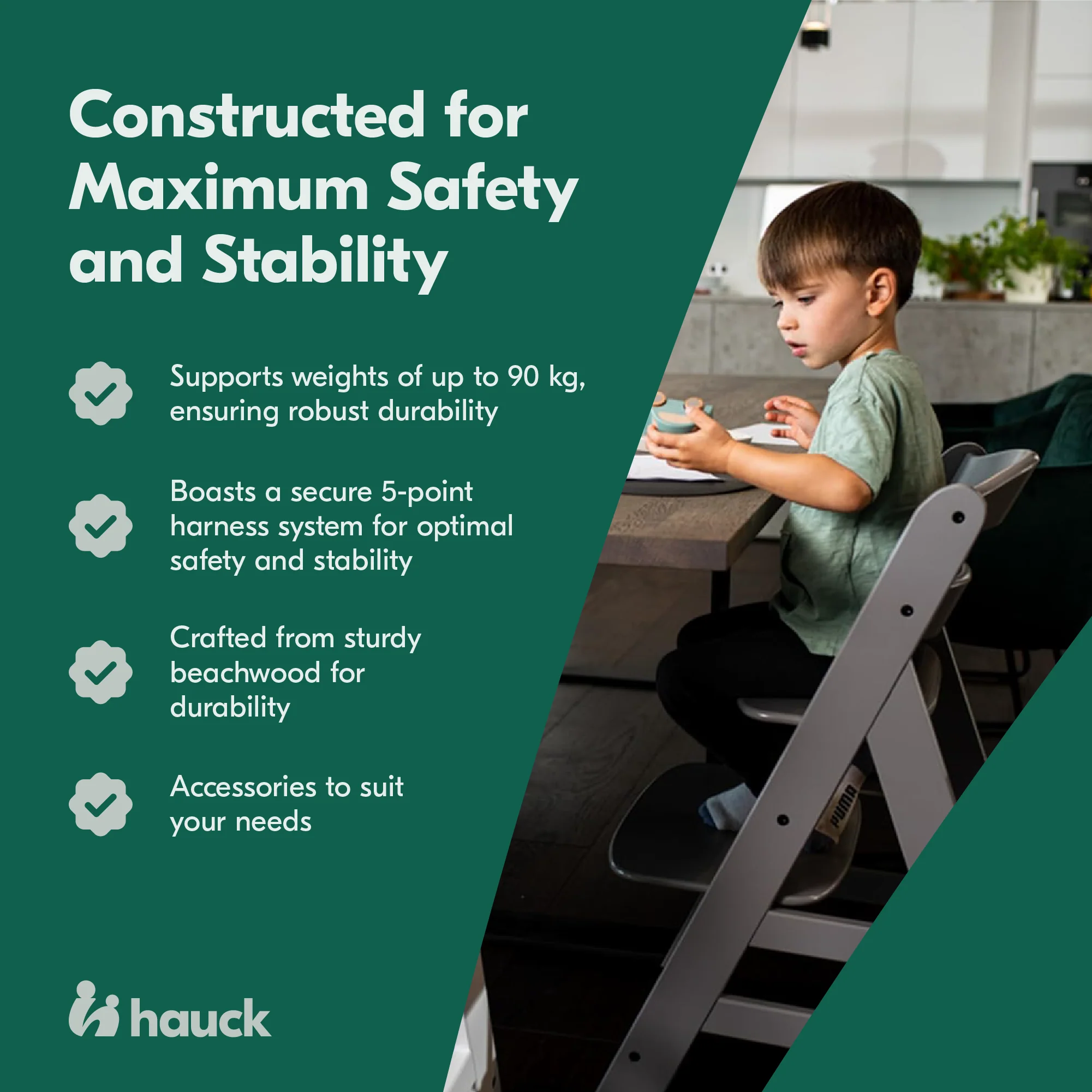 With hauck, your child can experience comfort from birth with our flexible accessories. The Alpha+ can be paired with various dining and game boards, additional high-chair cushions, and a newborn top (all sold separately). The inclusion of 2 harness systems and the option to use the chair with or without the front bar makes it an ergonomic grow-along high chair that caters to your child’s changing needs. Trust hauck for a lifetime of high-quality, safe, and responsible mealtime adventures.