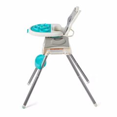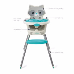 This 4-in-1 high chair transforms into a space saver, booster and toddler chair. Features a dishwasher safe multi-functional meal mat and easy release removable food tray. Food tray and seat back are adjustable for ideal positioning from tiny to toddler. Cushioned, low-density foam padding is soft for baby, and easy to clean for parents.