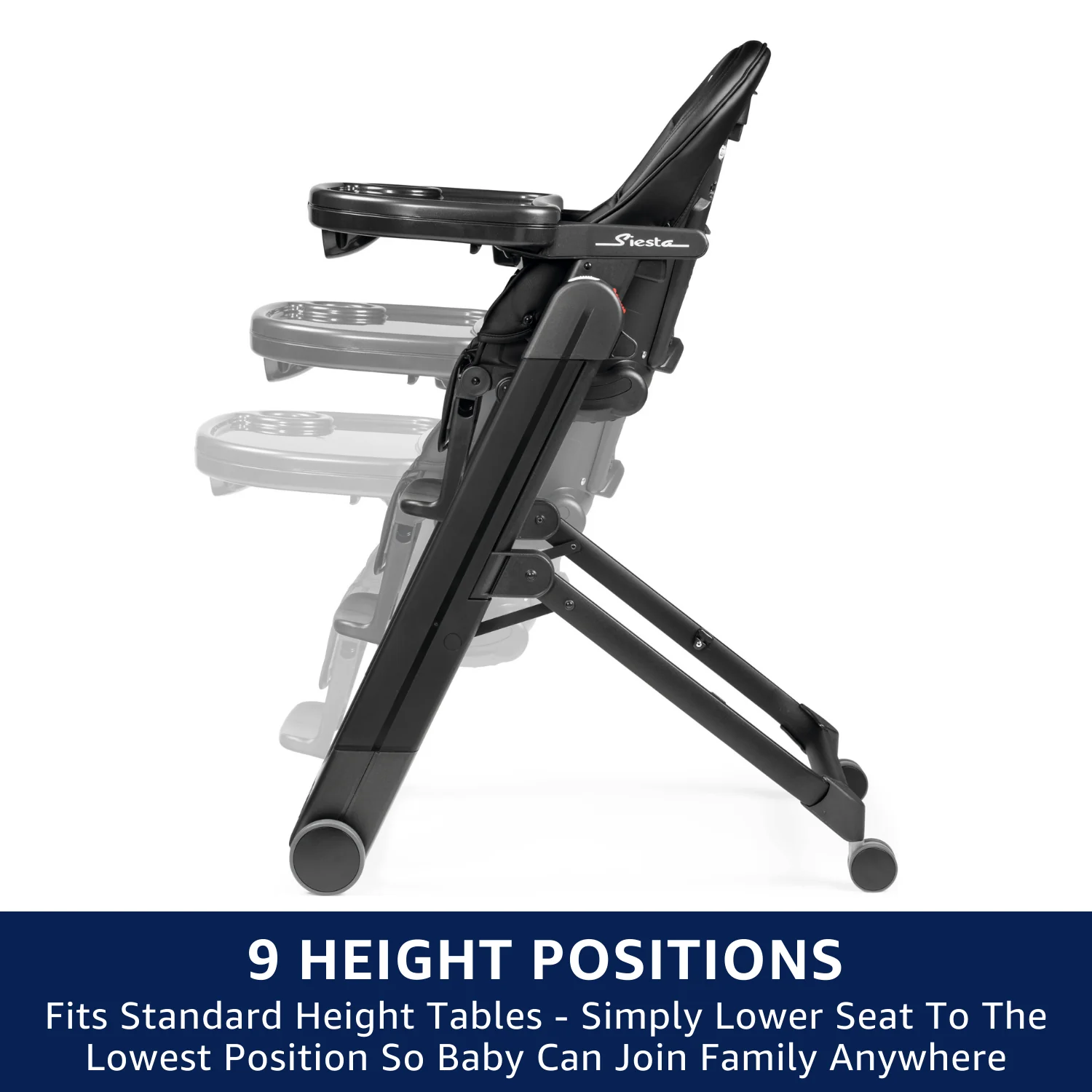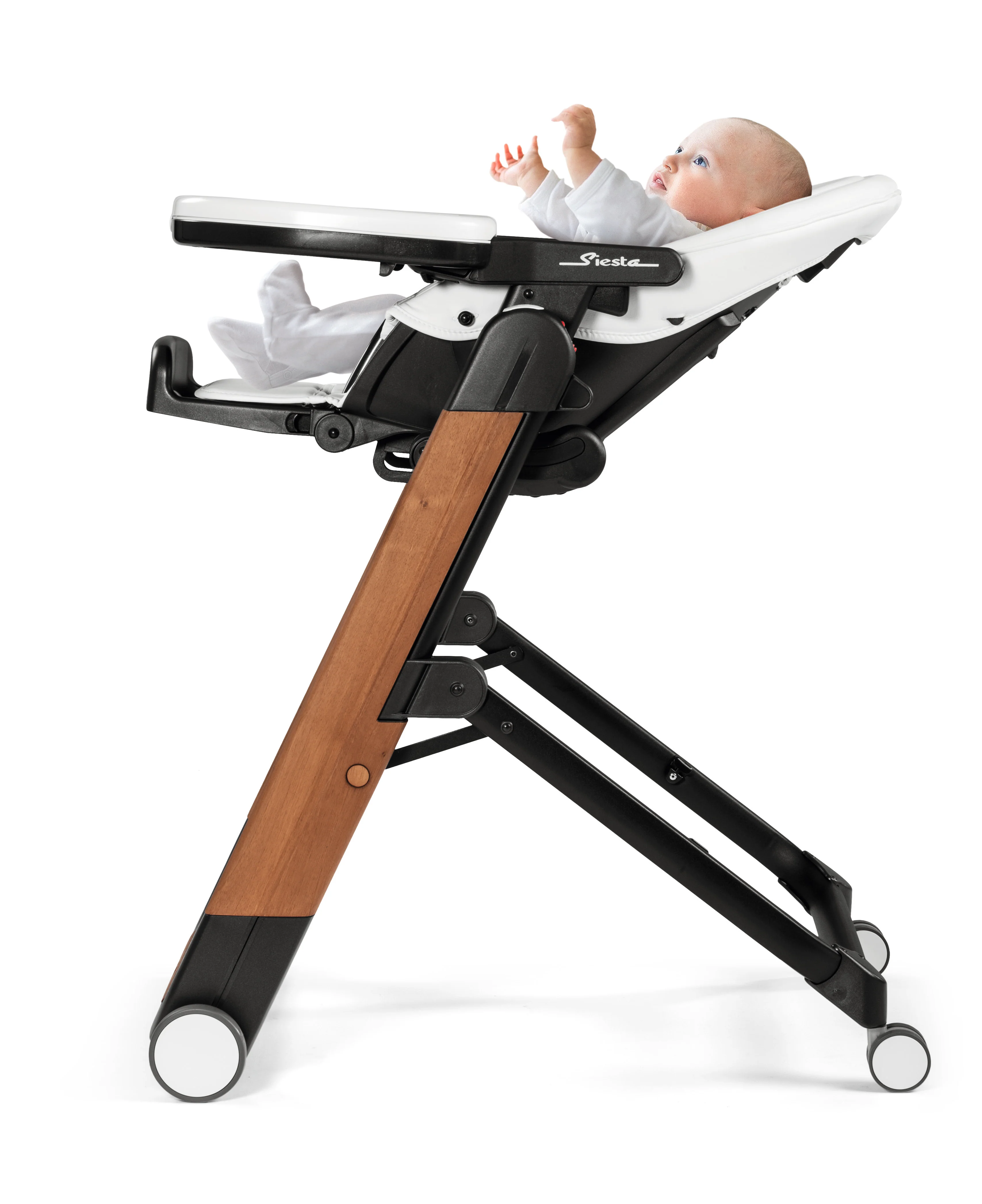 The multifunctional, ultra-compact high chair that easily accommodates a child's growth. From birth, the Siesta can be used as a recliner or as a high chair for feeding, playing and resting. The removable tray and multiple height positions allow child to sit right at the table. The Siesta follows a child from birth through the toddler years. The multi-functional high chair can be used as a comfortable recliner, perfect for keeping a young baby close. As the child grows, the five recline positions and nine height positions provide a perfect spot for relaxing, eating or playing. Dinner will truly be a family affair, as the Siesta's multiple height settings and removable tray allow child to sit at the dinner table. It's a smooth move from one room to the next with the Siesta. Floor-friendly caster wheels allow for an easy transition from kitchen to playroom, and automatically lock for safety. When it's time to put the Siesta away, it folds quickly and compactly. This compact fold makes the Siesta perfect for urban living spaces and is easily stored when not in use. With a sleek design available in five beautiful, saturated colors, the Siesta would be a welcomed addition to any living or kitchen space. Plus, with the Siesta, cleanup is a breeze. The Prima Classe fabric can quickly be wiped clean with a damp cloth. Weight of the item: 24 pounds