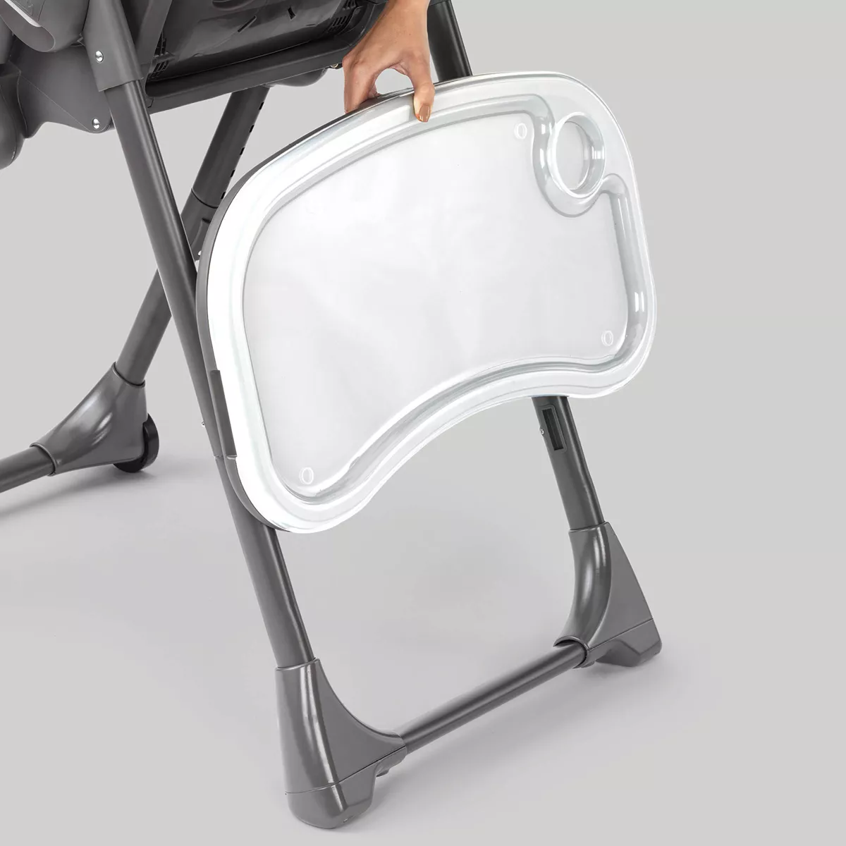 - Adjustable high chair accommodates growth from infant through toddler and features a space-saving, 11” wide fold that stands independently for storage