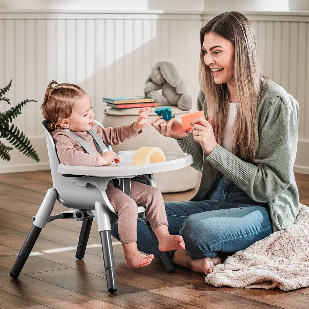 - REMOVABLE LEG EXTENSIONS – Shorten the legs for a low feeding chair that can be used for stacking or playing with toys or remove the harness and tray for a toddler chair