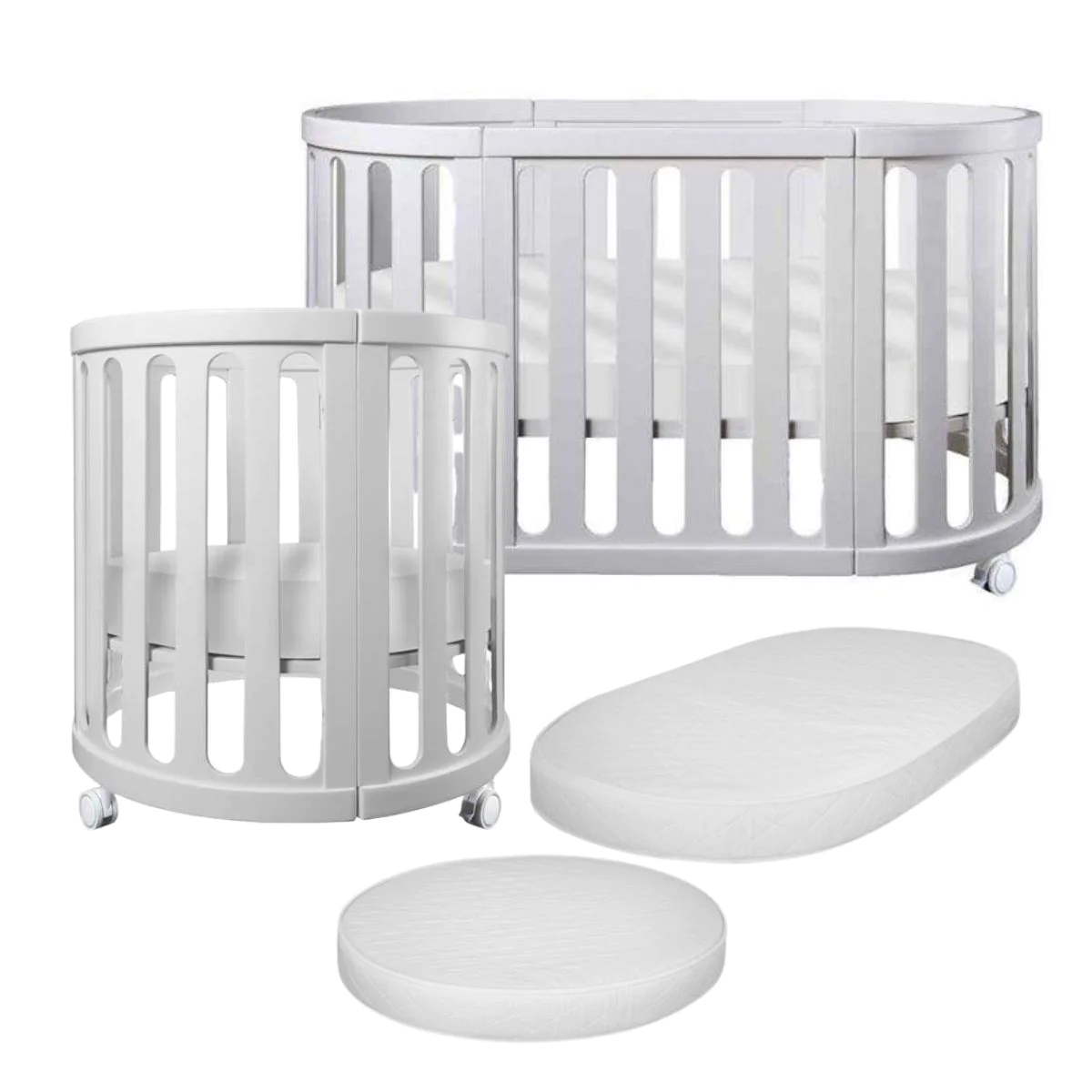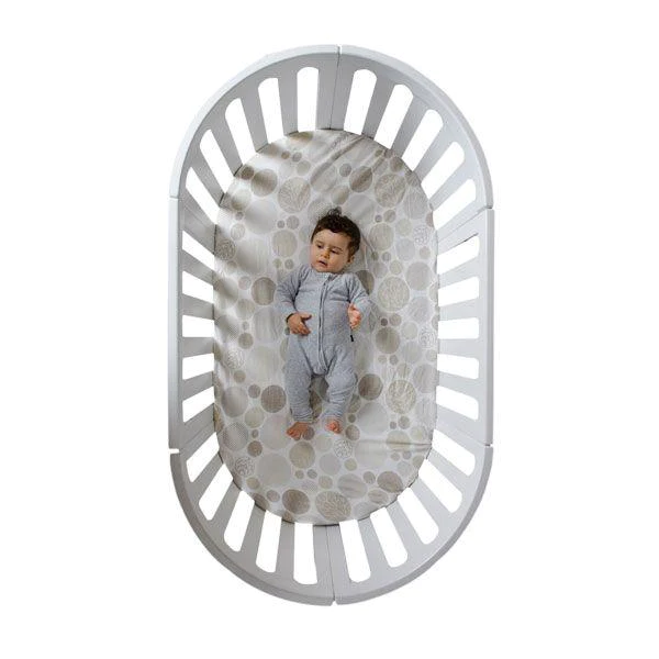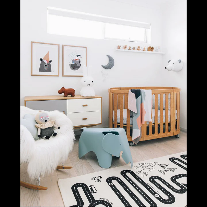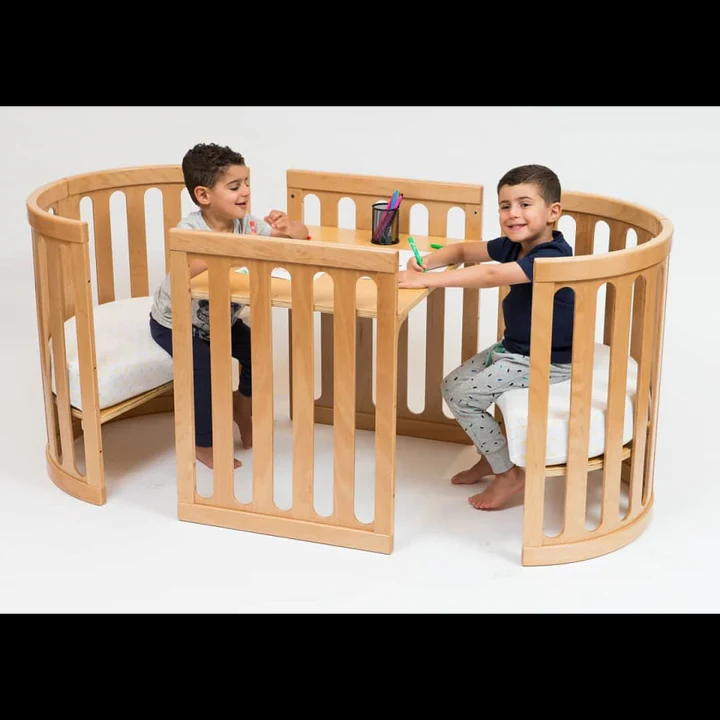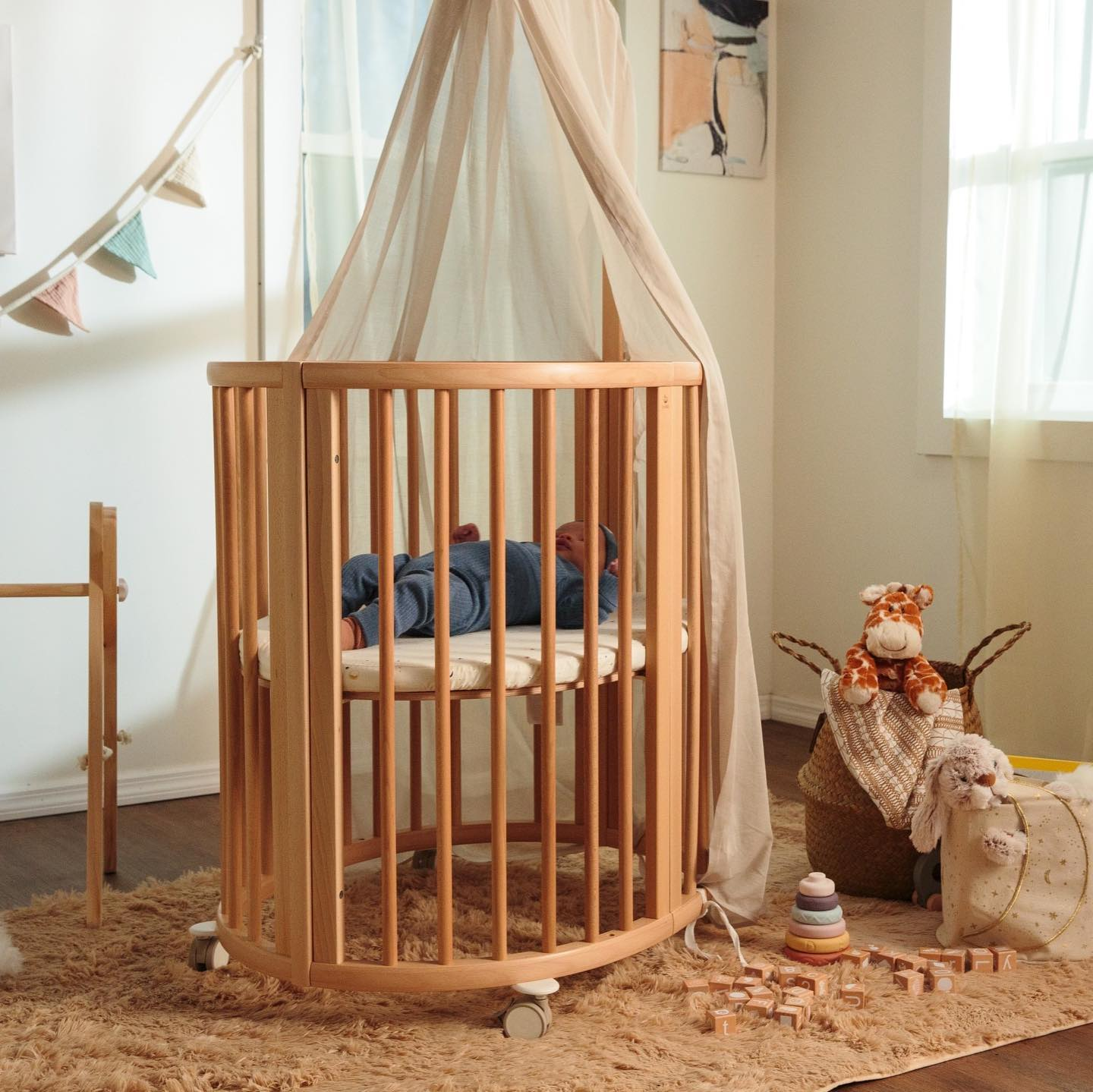 From birth the Crib is a uniquely designed circle bassinet to fit in any modern house, which then evolves into a cocoon style cot, then a junior bed.