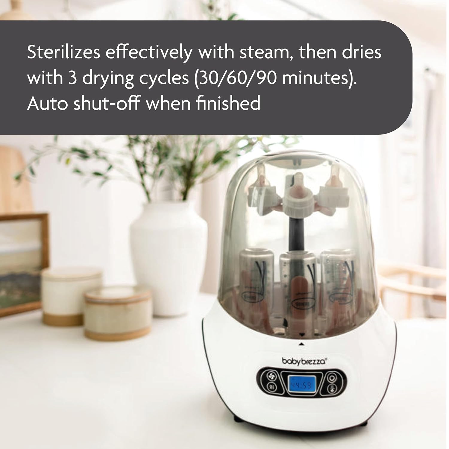 - AUTOMATICALLY STERILIZES & DRIES IN ONE EASY STEP! Fits up to 6 narrow or wide neck bottles, pump parts, pacifiers, teethers, sippy cups & other accessories from any brand.
