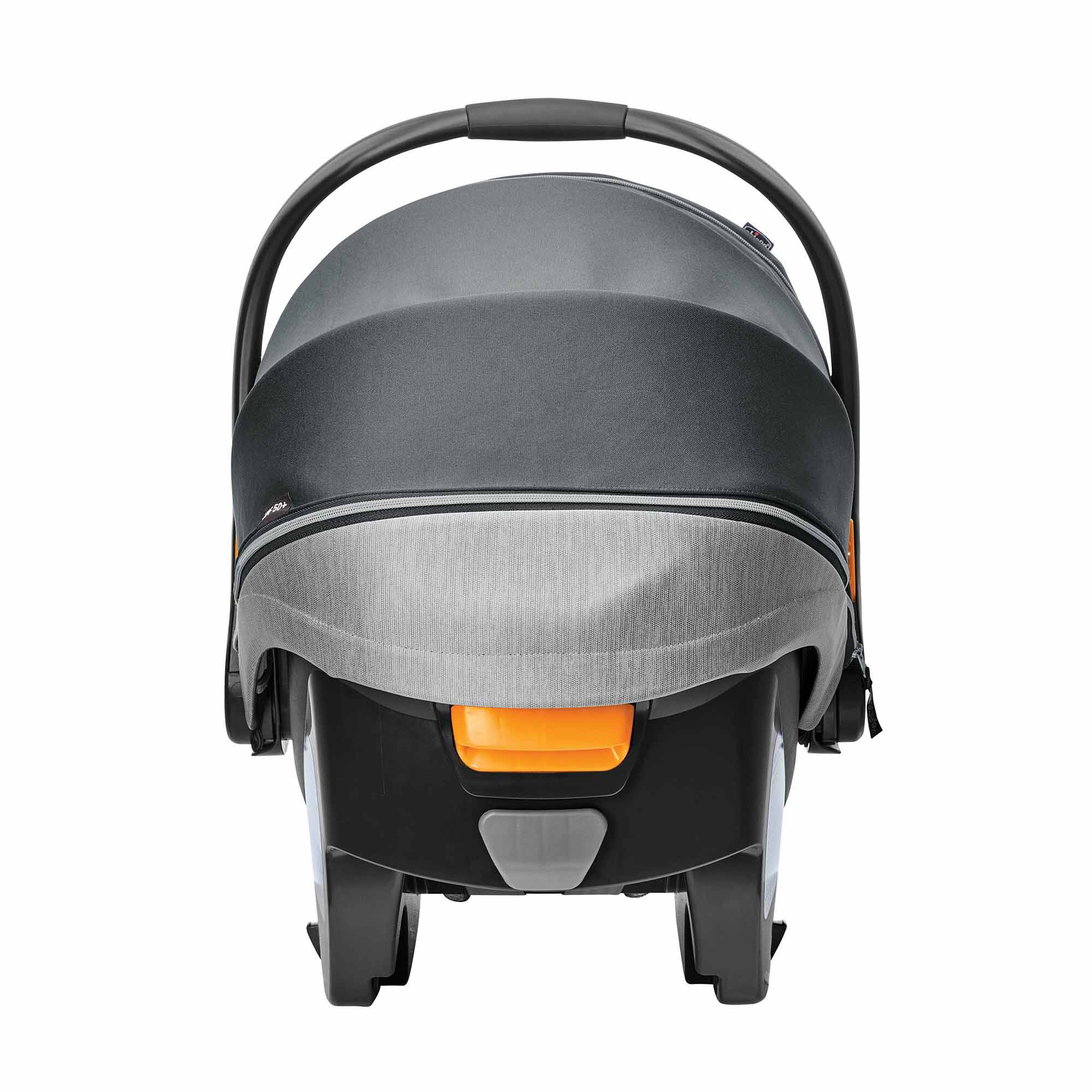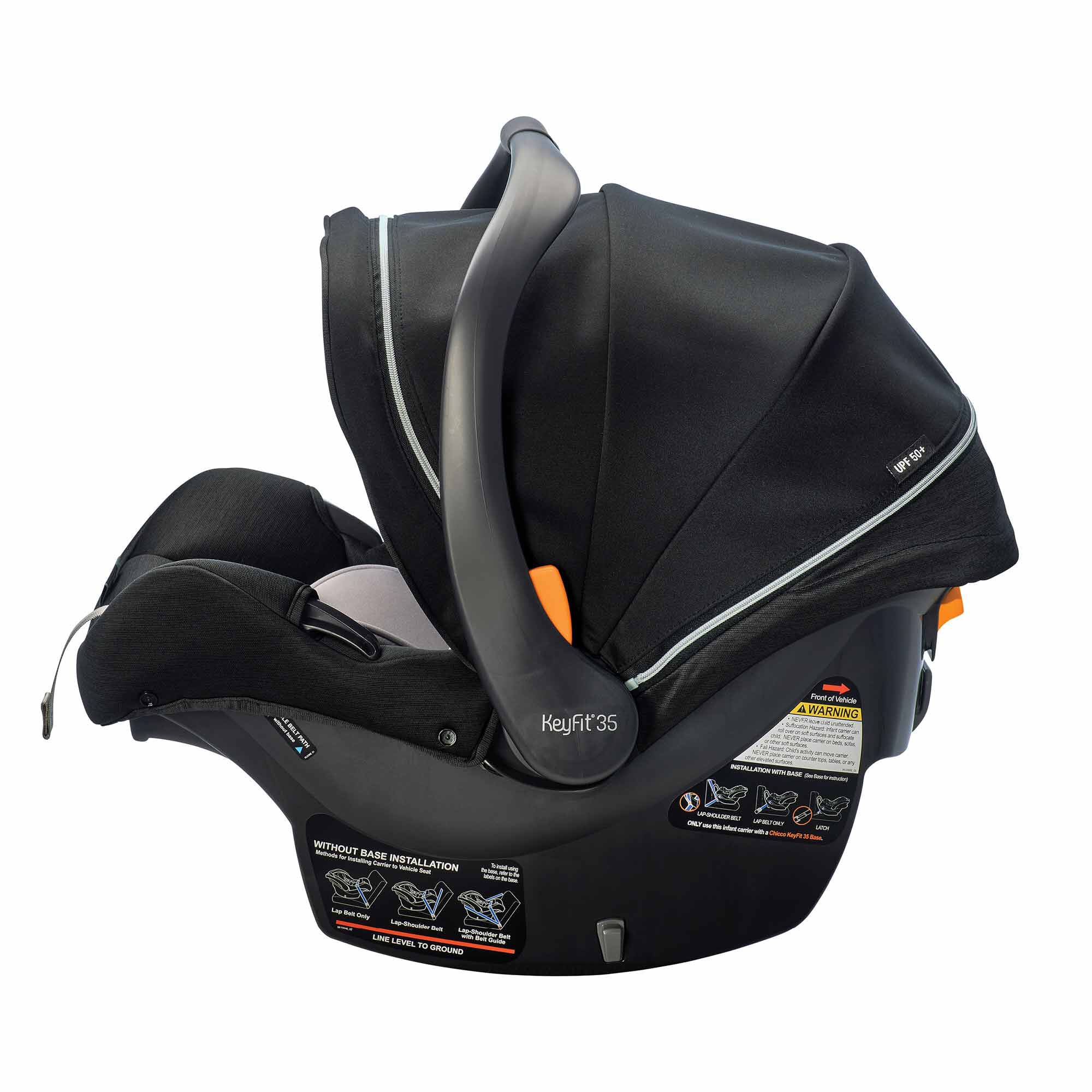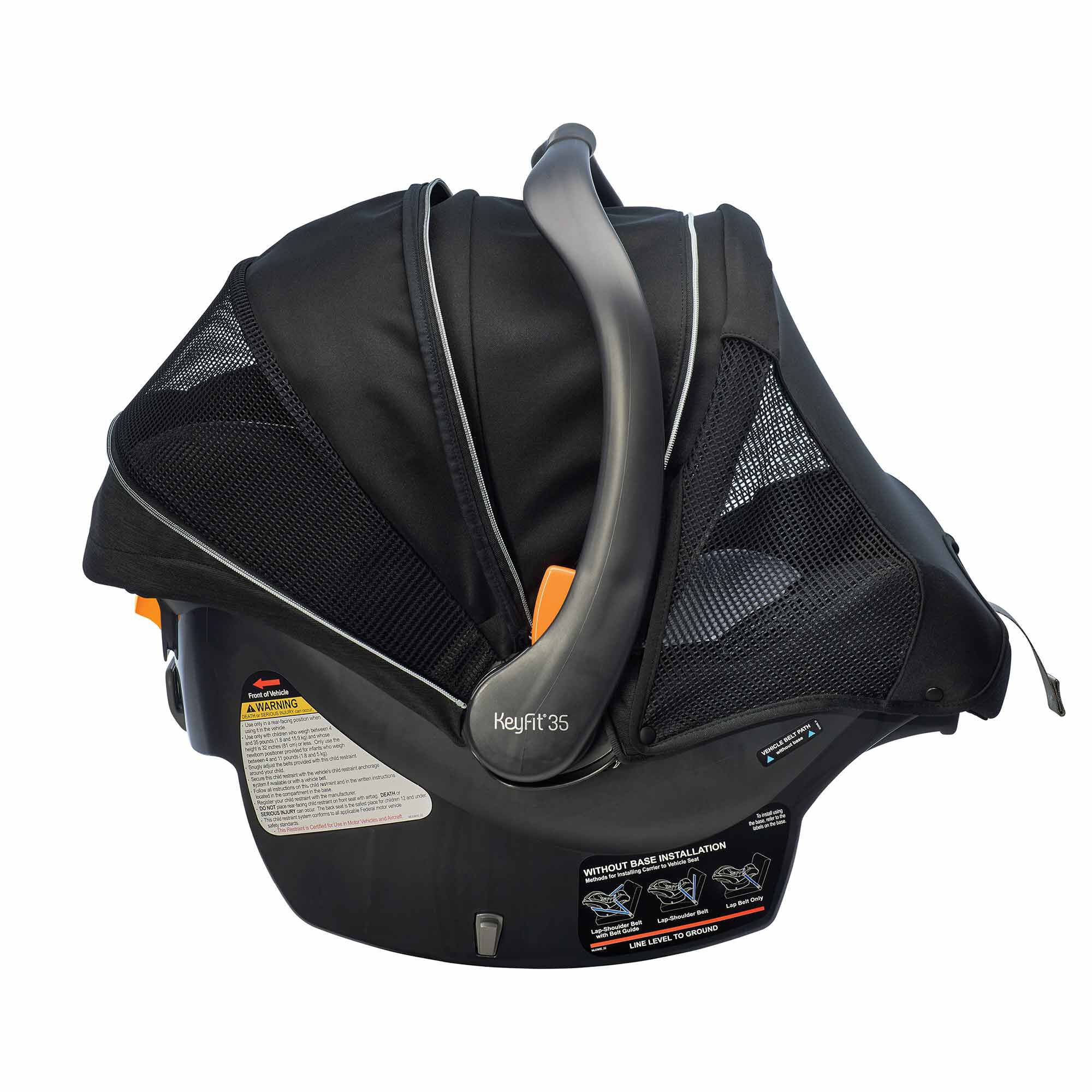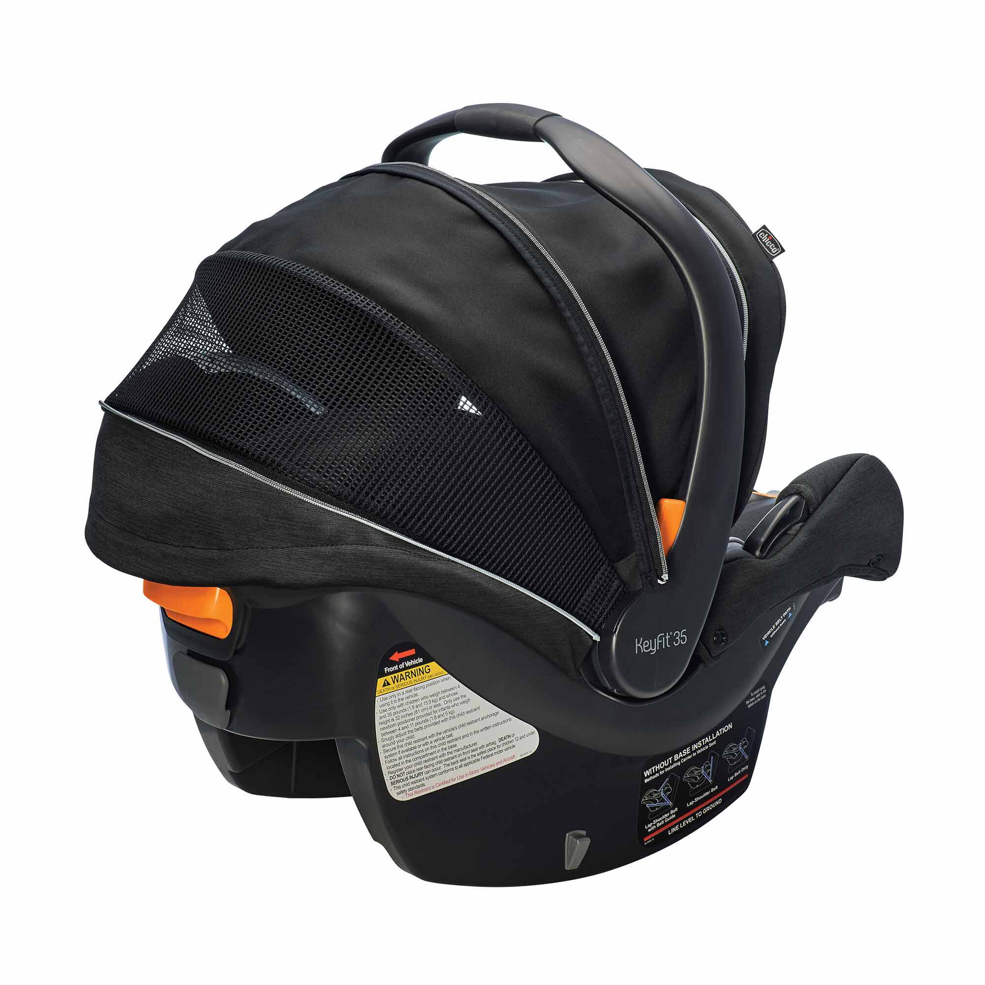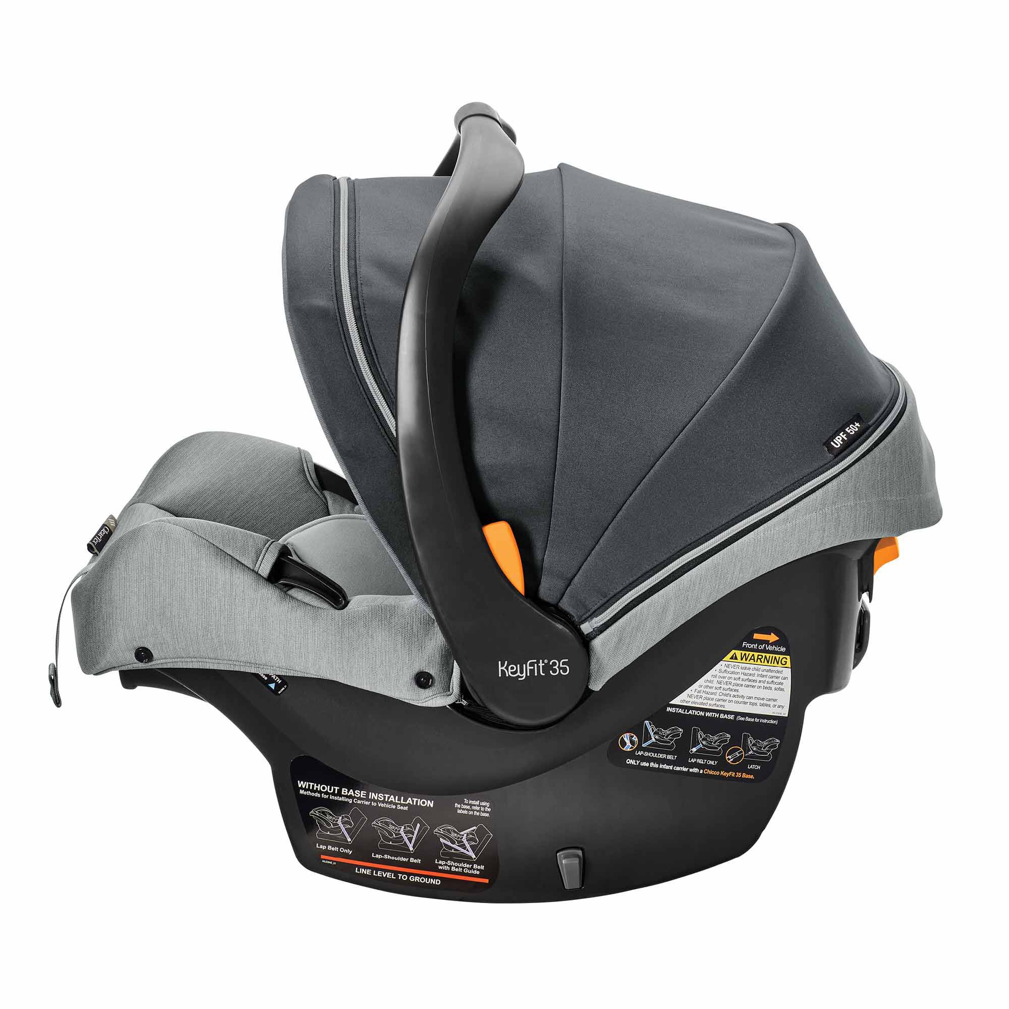 The KeyFit 35 Zip ClearTex Extended-Use Infant Car Seat from Chicco offers more headrest height & legroom for extended rear-facing use. It features no added chemicals and the breathable canopy includes a zip-extend, full-coverage privacy shield.