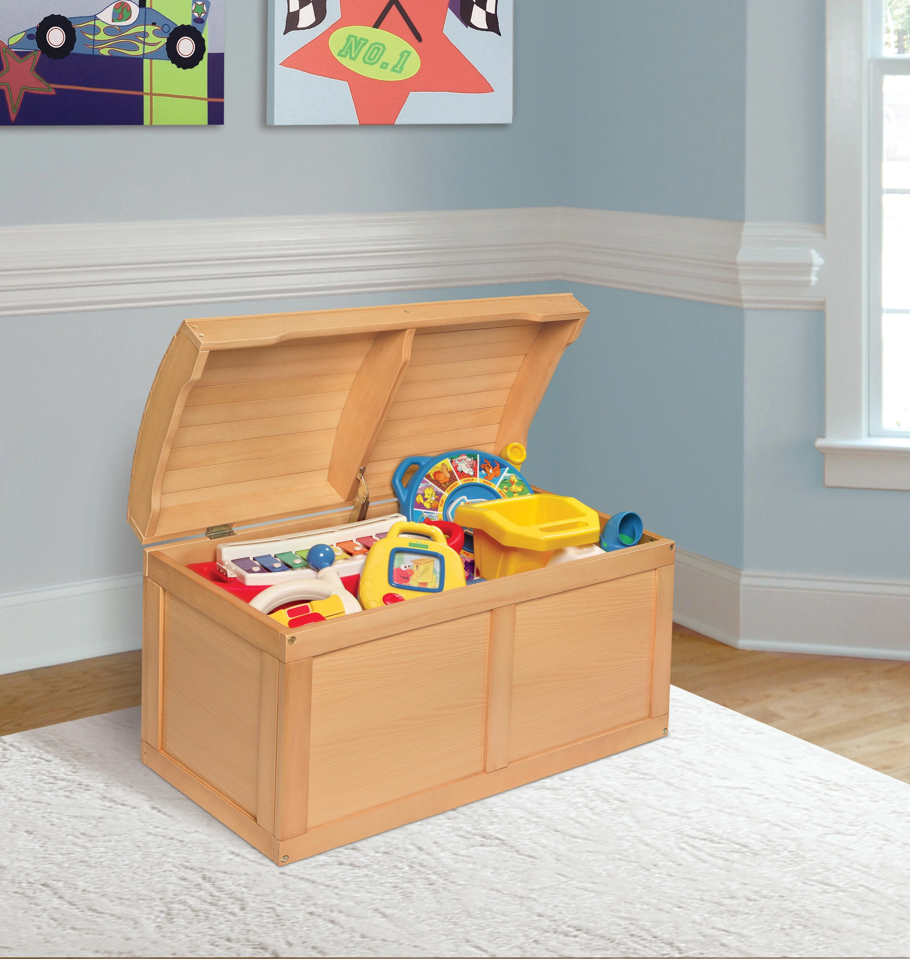 - The safety hinge secures the lid in the open position so it will not slam shut on your child while they choose a toy for playtime.